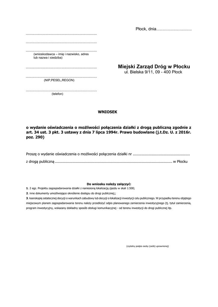 Płock, dnia................................... ...................................................................... ...................................................................... ...................................................................... (wnioskodawca – imię i nazwisko, adres lub nazwa i siedziba) Miejski Zarząd Dróg w Płocku ...................................................................... ul. Bielska 9/11, 09 - 400 Płock ...................................................................... (NIP,PESEL,REGON) ...................................................................... (telefon) WNIOSEK o wydanie oświadczenia o możliwości połączenia działki z drogą publiczną zgodnie z art. 34 ust. 3 pkt. 3 ustawy z dnia 7 lipca 1994r. Prawo budowlane (j.t.Dz. U. z 2016r. poz. 290) Proszę o wydanie oświadczenia o możliwości połączenia działki nr .................................................... z drogą publiczną ........................................................................................................... w Płocku Do wniosku należy załączyć: 1. 2 egz. Projektu zagospodarowania działki z naniesioną lokalizacją zjazdu w skali 1:500; 2. inne dokumenty umożliwiające określenie dostępu do drogi publicznej;; 3. kserokopię ostatecznej decyzji o warunkach zabudowy lub decyzji o lokalizacji inwestycji celu publicznego. W przypadku terenu objętego miejscowym planem zagospodarowania terenu należy przedłożyć odpis planowanego zamierzenia inwestycyjnego (tj. tytuł zamierzenia, program inwestycyjny, wskazany dokładny sposób obsługi komunikacyjnej - od terenu inwestycji do drogi publicznej itp. (czytelny podpis osoby (osób) uprawnionej)