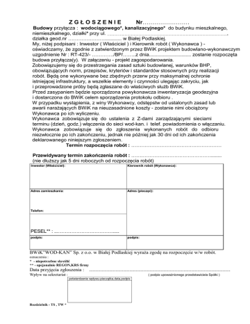 ZGŁOSZENIE Nr…………………… Budowy przyłącza : wodociągowego*, kanalizacyjnego* do budynku mieszkalnego, niemieszkalnego, działki* przy ul. ….......…....................................................................................................................., działka geod.nr ………….………............ w Białej Podlaskiej. My, niżej podpisani : Inwestor ( Właściciel ) i Kierownik robót ( Wykonawca ) oświadczamy, że zgodnie z zatwierdzonym przez BWiK projektem budowlano-wykonawczym uzgodnienie Nr : RT-423/- …………./BP/……..z dnia.............................. zostanie rozpoczęta budowa przyłącza(y). W załączeniu - projekt zagospodarowania. Zobowiązujemy się do przestrzegania zasad sztuki budowlanej, warunków BHP, obowiązujących norm, przepisów, kryteriów i standardów stosownych przy realizacji robót. Będą one wykonywane bez zbędnych przerw przy maksymalnej ochronie istniejącej infrastruktury, a wszelkie elementy i czynności ulegając zakryciu, jak i przeprowadzone próby będą zgłaszane do właściwych służb BWiK. Przed zasypaniem będzie sporządzona powykonawcza inwentaryzacja geodezyjna i dostarczona do BWiK celem sporządzenia protokołu odbioru . W przypadku wystąpienia, z winy Wykonawcy, odstępstw od ustalonych zasad lub awarii narażających BWiK na nieuzasadnione koszty - zostanie nimi obciążony Wykonawca po ich wyliczeniu. Wykonawca zobowiązuje się do ustalenia z Z-dami zarządzającymi sieciami terminu (dzień, godz.) włączenia do sieci wod-kan. i telef. powiadomienia o włączaniu. Wykonawca zobowiązuje się do zgłoszenia wykonanych robót do odbioru niezwłocznie po ich zakończeniu, jednak nie później jak 30 dni od ich zakończenia deklarowanego niniejszym zgłoszeniem. Termin rozpoczęcia robót : ……………………………………………… Przewidywany termin zakończenia robót : …………………………………………........ (nie dłuższy jak 5 dni roboczych od rozpoczęcia robót) Inwestor (Właściciel): Kierownik robót (Wykonawca): Adres zamieszkania: Adres (pieczęć): Telefon: PESEL** : ...……………………………..... podpis: podpis: BWiK”WOD-KAN” Sp. z o.o. w Białej Podlaskiej wyraża zgodę na rozpoczęcie w/w robót. oznaczenia : * - niepotrzebne skreślić ** - opcjonalnie REGON,KRS firmy Data przyjęcia zgłoszenia : ................................................................................................................ Wpływ na sekretariat : ( podpis upoważnionego przedstawiciela Spółki ) potwierdzenie wpływu-pieczątka,data,podpis Rozdzielnik - TS , TW *