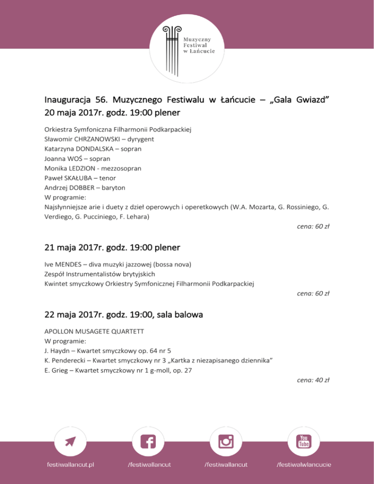 Inauguracja 56. Muzycznego Festiwalu w Łańcucie – „Gala Gwiazd” 20 maja 2017r. godz. 19:00 plener Orkiestra Symfoniczna Filharmonii Podkarpackiej Sławomir CHRZANOWSKI – dyrygent Katarzyna DONDALSKA – sopran Joanna WOŚ – sopran Monika LEDZION - mezzosopran Paweł SKAŁUBA – tenor Andrzej DOBBER – baryton W programie: Najsłynniejsze arie i duety z dzieł operowych i operetkowych (W.A. Mozarta, G. Rossiniego, G. Verdiego, G. Pucciniego, F. Lehara) cena: 60 zł 21 maja 2017r. godz. 19:00 plener Ive MENDES – diva muzyki jazzowej (bossa nova) Zespół Instrumentalistów brytyjskich Kwintet smyczkowy Orkiestry Symfonicznej Filharmonii Podkarpackiej cena: 60 zł 22 maja 2017r. godz. 19:00, sala balowa APOLLON MUSAGETE QUARTETT W programie: J. Haydn – Kwartet smyczkowy op. 64 nr 5 K. Penderecki – Kwartet smyczkowy nr 3 „Kartka z niezapisanego dziennika” E. Grieg – Kwartet smyczkowy nr 1 g-moll, op. 27 cena: 40 zł 23 maja 2017r. godz. 19:00, sala balowa Wiedeńska Orkiestra Kameralna Michael MACIASZCZYK – dyrygent/skrzypce W programie: J. Haydn – Symfonia nr 82 W.A. Mozart – Koncert skrzypcowy A-dur KV. 219 J. Haydn – Symfonia nr 88 cena: 60 zł 24 maja 2017r. godz. 19:00, sala balowa Dina YOFFE – fortepian W programie: L. van Beethoven – Sonata nr 16 G-dur op. 31 nr 1 J. Brahms – Fantazje op. 116 F. Chopin – Nokturn Es-dur op. 55 nr 2 F. Chopin – III Sonata h-moll op. 58 cena: 40 zł 25 maja 2017r. godz. 19:00, sala balowa Orkiestra Kameralna Wratislavia Jan STANIENDA - dyrygent Ivan MONIGHETTI – wiolonczela W programie: G. Ph. Telemann - Suita Don Kichot L. Boccherini - Koncert wiolonczelowy D-dur G.479 A. Vivaldi - Koncert wiolonczelowy G-dur RV 413 G. Rossini - I Sonata a quattro G-dur A. Dvořák - Serenada na smyczki E-dur op. 22 cena: 60 zł 26 maja 2017r. godz. 19:00, sala FP Gabriela MONTERO – fortepian W programie: F. Schubert – „Four Impromptus, op. 90, D. 899” R. Schumann – „Karnawał” op. 9 G. Montero - Improvisations cena: 40 zł 27 maja 2017r. godz. 19:00, sala FP Orkiestra Symfoniczna Filharmonii Podkarpackiej Chór Filharmonii Narodowej Massimiliano CALDI – dyrygent Soliści: Magdalena SCHABOWSKA – sopran Agnieszka MAKÓWKA – alt Tomasz KUK – tenor Robert GIERLACH - baryton W programie: L. van Beethoven – IX Symfonia d-moll op. 125 cena: 40 zł KONCERT NA BIS 28 maja 2017r. godz. 20:00, Hotel Sokół w Łańcucie CHOPIN UNIVERSITY OF MUSIC BIG BAND Janusz OLEJNICZAK – fortepian cena: 40 zł *** KARNET: 320 zł (8 koncertów) Poza karnetem tylko 28 maja 2017r.