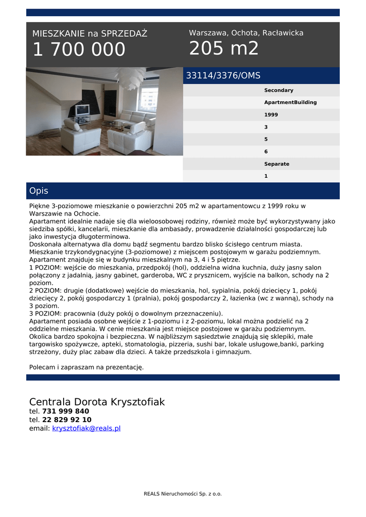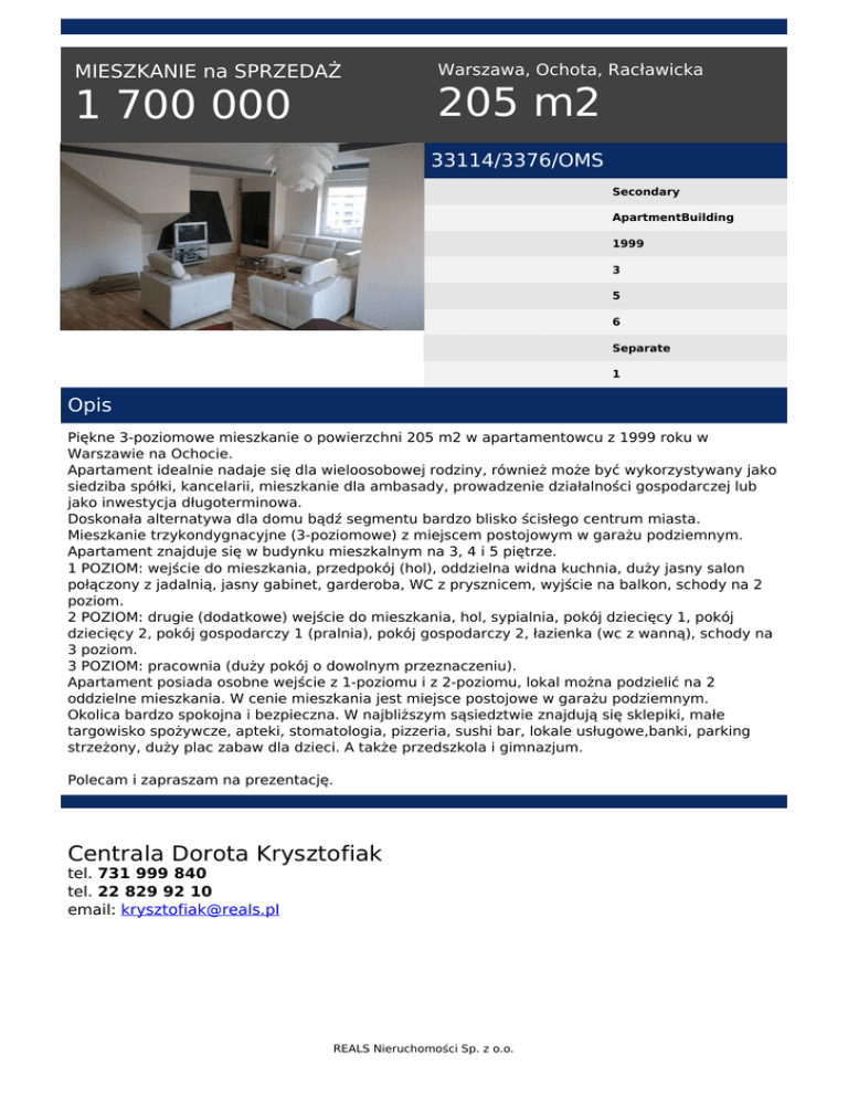 MIESZKANIE na SPRZEDAŻ 1 700 000 Warszawa, Ochota, Racławicka 205 m2 33114/3376/OMS Secondary ApartmentBuilding 1999 3 5 6 Separate 1 Opis Piękne 3-poziomowe mieszkanie o powierzchni 205 m2 w apartamentowcu z 1999 roku w Warszawie na Ochocie. Apartament idealnie nadaje się dla wieloosobowej rodziny, również może być wykorzystywany jako siedziba spółki, kancelarii, mieszkanie dla ambasady, prowadzenie działalności gospodarczej lub jako inwestycja długoterminowa. Doskonała alternatywa dla domu bądź segmentu bardzo blisko ścisłego centrum miasta. Mieszkanie trzykondygnacyjne (3-poziomowe) z miejscem postojowym w garażu podziemnym. Apartament znajduje się w budynku mieszkalnym na 3, 4 i 5 piętrze. 1 POZIOM: wejście do mieszkania, przedpokój (hol), oddzielna widna kuchnia, duży jasny salon połączony z jadalnią, jasny gabinet, garderoba, WC z prysznicem, wyjście na balkon, schody na 2 poziom. 2 POZIOM: drugie (dodatkowe) wejście do mieszkania, hol, sypialnia, pokój dziecięcy 1, pokój dziecięcy 2, pokój gospodarczy 1 (pralnia), pokój gospodarczy 2, łazienka (wc z wanną), schody na 3 poziom. 3 POZIOM: pracownia (duży pokój o dowolnym przeznaczeniu). Apartament posiada osobne wejście z 1-poziomu i z 2-poziomu, lokal można podzielić na 2 oddzielne mieszkania. W cenie mieszkania jest miejsce postojowe w garażu podziemnym. Okolica bardzo spokojna i bezpieczna. W najbliższym sąsiedztwie znajdują się sklepiki, małe targowisko spożywcze, apteki, stomatologia, pizzeria, sushi bar, lokale usługowe,banki, parking strzeżony, duży plac zabaw dla dzieci. A także przedszkola i gimnazjum. Polecam i zapraszam na prezentację. Centrala Dorota Krysztofiak tel. 731 999 840 tel. 22 829 92 10 email: [email protected] REALS Nieruchomości Sp. z o.o. Powered by TCPDF (www.tcpdf.org)