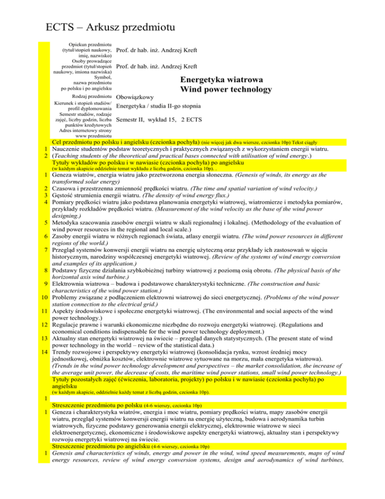 ECTS – Arkusz przedmiotu Opiekun przedmiotu (tytuł/stopień naukowy, imię, nazwisko) Osoby prowadzące przedmiot (tytuł/stopień naukowy, imiona nazwiska) Symbol, nazwa przedmiotu po polsku i po angielsku Rodzaj przedmiotu Kierunek i stopień studiów/ profil dyplomowania Semestr studiów, rodzaje zajęć, liczby godzin, liczba punktów kredytowych Adres internetowy strony www przedmiotu Prof. dr hab. inż. Andrzej Kreft Prof. dr hab. inż. Andrzej Kreft Energetyka wiatrowa Wind power technology Obowiązkowy Energetyka / studia II-go stopnia Semestr II, wykład 15, 2 ECTS Cel przedmiotu po polsku i angielsku (czcionka pochyła) (nie więcej jak dwa wiersze, czcionka 10p) Tekst ciągły 1 Nauczenie studentów podstaw teoretycznych i praktycznych związanych z wykorzystaniem energii wiatru. 2 (Teaching students of the theoretical and practical bases connected with utilisation of wind energy.) Tytuły wykładów po polsku i w nawiasie (czcionka pochyła) po angielsku (w każdym akapicie oddzielnie temat wykładu z liczbą godzin, czcionka 10p). . 1 Geneza wiatrów, energia wiatru jako przetworzona energia słoneczna. (Genesis of winds, its energy as the transformed solar energy) 2 Czasowa i przestrzenna zmienność prędkości wiatru. (The time and spatial variation of wind velocity.) 3 Gęstość strumienia energii wiatru. (The density of wind energy flux.) 4 Pomiary prędkości wiatru jako podstawa planowania energetyki wiatrowej, wiatromierze i metodyka pomiarów, przykłady rozkładów prędkości wiatru. (Measurement of the wind velocity as the base of the wind power designing.) 5 Metodyka szacowania zasobów energii wiatru w skali regionalnej i lokalnej. (Methodology of the evaluation of wind power resources in the regional and local scale.) 6 Zasoby energii wiatru w różnych regionach świata, atlasy energii wiatru. (The wind power resources in different regions of the world.) 7 Przegląd systemów konwersji energii wiatru na energię użyteczną oraz przykłady ich zastosowań w ujęciu historycznym, narodziny współczesnej energetyki wiatrowej. (Review of the systems of wind energy conversion and examples of its application.) 8 Podstawy fizyczne działania szybkobieżnej turbiny wiatrowej z poziomą osią obrotu. (The physical basis of the horizontal axis wind turbine.) 9 Elektrownia wiatrowa – budowa i podstawowe charakterystyki techniczne. (The construction and basic characteristics of the wind power station.) 10 Problemy związane z podłączeniem elektrowni wiatrowej do sieci energetycznej. (Problems of the wind power station connection to the electrical grid.) 11 Aspekty środowiskowe i społeczne energetyki wiatrowej. (The environmental and social aspects of the wind power technology.) 12 Regulacje prawne i warunki ekonomiczne niezbędne do rozwoju energetyki wiatrowej. (Regulations and economical conditions indispensable for the wind power technology deployment.) 13 Aktualny stan energetyki wiatrowej na świecie – przegląd danych statystycznych. (The present state of wind power technology in the world – review of the statistical data.) 14 Trendy rozwojowe i perspektywy energetyki wiatrowej (konsolidacja rynku, wzrost średniej mocy jednostkowej, obniżka kosztów, elektrownie wiatrowe sytuowane na morzu, mała energetyka wiatrowa). (Trends in the wind power technology development and perspectives – the market consolidation, the increase of the average unit power, the decrease of costs, the maritime wind power stations, small wind power technology.) Tytuły pozostałych zajęć (ćwiczenia, laboratoria, projekty) po polsku i w nawiasie (czcionka pochyła) po angielsku (w każdym akapicie, oddzielnie każdy temat z liczbą godzin, czcionka 10p). 1 Streszczenie przedmiotu po polsku (4-6 wierszy, czcionka 10p) 1 Geneza i charakterystyka wiatrów, energia i moc wiatru, pomiary prędkości wiatru, mapy zasobów energii wiatru, przegląd systemów konwersji energii wiatru na energię użyteczną, budowa i aerodynamika turbin wiatrowych, fizyczne podstawy generowania energii elektrycznej, elektrownie wiatrowe w sieci elektroenergetycznej, ekonomiczne i środowiskowe aspekty energetyki wiatrowej, aktualny stan i perspektywy rozwoju energetyki wiatrowej na świecie. Streszczenie przedmiotu po angielsku (4-6 wierszy, czcionka 10p) 1 Genesis and characteristics of winds, energy and power in the wind, wind speed measurements, maps of wind energy resources, review of wind energy conversion systems, design and aerodynamics of wind turbines, ECTS – Arkusz przedmiotu generation of electrical energy – physical basis, wind turbines in the electrical grid, economical and environmental aspects of wind energy technology, present status and development of wind energy in the world. Bibliografia (2-5 podstawowych pozycji) w ujęciu wymaganym w Wyd. Nauk AGH. Wskazane książki i skrypty wykładowców oraz literatura w języku angielskim 1 G. Boyle (Ed.), Renewable Energy - Power for a Sustainable Future, Chapter 7 – Wind Energy, Oxford University Press, 1996. Forma zaliczenia przedmiotu, w nawiasie kolokwium,( test) (czcionka pochyła) po angielsku Zasada wystawiania oceny końcowej, w Ocena zaliczenia wykładu (the test mark) nawiasie (czcionka pochyła) po angielsku Słowa kluczowe (5) w j polskim i angielskim szacowanie zasobów energii wiatru, turbiny wiatrowe, rozwój technologiczny, turbiny wiatrowe w sieci elekroenergetycznej, wpływ na środowisko (assessment of wind energy resources, wind turbines, technical development, wind turbines in the electrical grid, environmental impact)