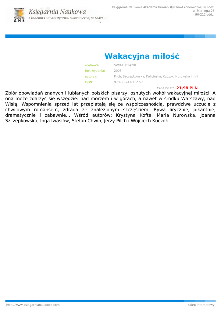 Księgarnia Naukowa Akademii Humanistyczno-Ekonomicznej w Łodzi ul.Sterlinga 26 90-212 Łódź Wakacyjna miłość wydawca: ŚWIAT KSIĄŻKI Rok wydania: 2008 autorzy: Pilch, Szczepkowska, Kalicińska, Kuczok, Nurowska i inni ISBN: 978-83-247-1127-7 Cena brutto: 21,98 PLN Zbiór opowiadań znanych i lubianych polskich pisarzy, osnutych wokół wakacyjnej miłości. A ona może zdarzyć się wszędzie: nad morzem i w górach, a nawet w środku Warszawy, nad Wisłą. Wspomnienia sprzed lat przeplatają się ze współczesnością, prawdziwe uczucie z chwilowym romansem, zdrada ze znalezionym szczęściem. Bywa lirycznie, pikantnie, dramatycznie i zabawnie... Wśród autorów: Krystyna Kofta, Maria Nurowska, Joanna Szczepkowska, Inga Iwasiów, Stefan Chwin, Jerzy Pilch i Wojciech Kuczok. http://www.ksiegarnianaukowa.com sklep internetowy