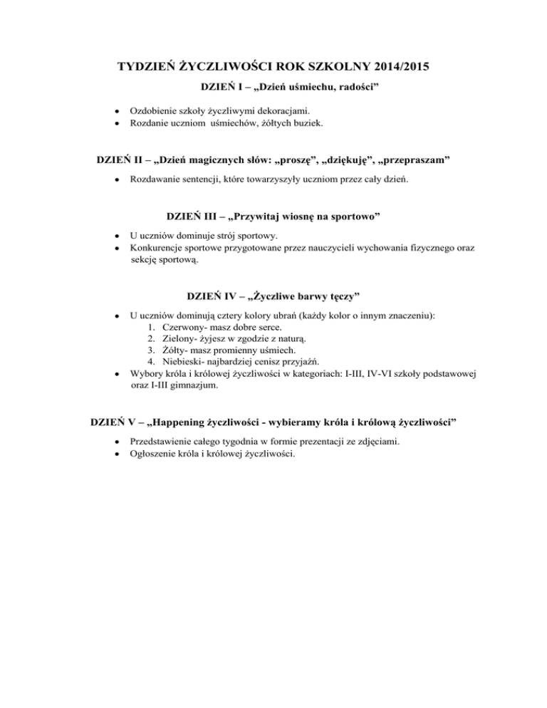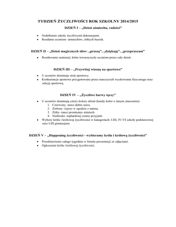 TYDZIEŃ ŻYCZLIWOŚCI ROK SZKOLNY 2014/2015 DZIEŃ I – „Dzień uśmiechu, radości” Ozdobienie szkoły życzliwymi dekoracjami. Rozdanie uczniom uśmiechów, żółtych buziek. DZIEŃ II – „Dzień magicznych słów: „proszę”, „dziękuję”, „przepraszam” Rozdawanie sentencji, które towarzyszyły uczniom przez cały dzień. DZIEŃ III – „Przywitaj wiosnę na sportowo” U uczniów dominuje strój sportowy. Konkurencje sportowe przygotowane przez nauczycieli wychowania fizycznego oraz sekcję sportową. DZIEŃ IV – „Życzliwe barwy tęczy” U uczniów dominują cztery kolory ubrań (każdy kolor o innym znaczeniu): 1. Czerwony- masz dobre serce. 2. Zielony- żyjesz w zgodzie z naturą. 3. Żółty- masz promienny uśmiech. 4. Niebieski- najbardziej cenisz przyjaźń. Wybory króla i królowej życzliwości w kategoriach: I-III, IV-VI szkoły podstawowej oraz I-III gimnazjum. DZIEŃ V – „Happening życzliwości - wybieramy króla i królową życzliwości” Przedstawienie całego tygodnia w formie prezentacji ze zdjęciami. Ogłoszenie króla i królowej życzliwości.