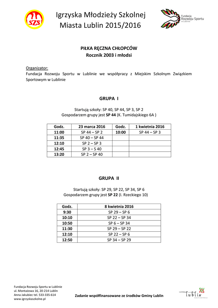 Igrzyska Młodzieży Szkolnej Miasta Lublin 2015/2016 PIŁKA RĘCZNA CHŁOPCÓW Rocznik 2003 i młodsi Organizator: Fundacja Rozwoju Sportu w Lublinie we współpracy z Miejskim Szkolnym Związkiem Sportowym w Lublinie GRUPA I Startują szkoły: SP 40, SP 44, SP 3, SP 2 Gospodarzem grupy jest SP 44 (K. Tumidajskiego 6A ) Godz. 11:00 11:35 12:10 12:45 13:20 23 marca 2016 SP 44 – SP 2 SP 40 – SP 44 SP 2 – SP 3 SP 3 – S 40 SP 2 – SP 40 Godz. 10:00 1 kwietnia 2016 SP 44 – SP 3 GRUPA II Startują szkoły: SP 29, SP 22, SP 34, SP 6 Gospodarzem grupy jest SP 22 (I. Rzeckiego 10) Godz. 9:30 10:10 10:50 11:30 12:10 12:50 Fundacja Rozwoju Sportu w Lublinie ul. Montażowa 16, 20-214 Lublin Anna Jakubiec tel. 533-335-614 www.igrzyskaszkolne.pl 8 kwietnia 2016 SP 29 – SP 6 SP 22 – SP 34 SP 6 – SP 34 SP 29 – SP 22 SP 22 – SP 6 SP 34 – SP 29 Zadanie współfinansowane ze środków Gminy Lublin Igrzyska Młodzieży Szkolnej Miasta Lublin 2015/2016 GRUPA III Startują szkoły: SP 28, SP 47, SP 10, SP 14, Gospodarzem grupy jest SP 28 (ul. Radości13) Godz. 9:00 9:35 10:10 10:45 11:20 11:55 7 kwietnia 2016 SP 28 – SP 14 SP 47 – SP 10 SP 14 – SP 10 SP 28 – SP 47 SP 47 – SP 14 SP 10 – SP 28 GRUPA IV Startują szkoły: SP 38, SP 7, SP 50, SP Paderewski, SP Klonowic Gospodarzem grupy jest SP Paderewski (ul. Symfoniczna 1) Godz. 9:30 10:10 10:50 11:30 12:10 22 marca 2016 SP 38 – SP 7 SP Paderewski – SP 50 SP Klonowic – SP 38 SP 7 – SP Paderewski SP 50 - SP Klonowic Godz. 10:00 10:35 11:10 11:45 12:20 6 kwietnia 2016 SP 38 – SP Paderewski SP 7 – SP Klonowic SP 50 – SP 38 SP Klonowic – SP Paderewski SP 7 – SP 50 GRUPA V Startują szkoły: SP 43, SP 51, SP Urszulanki, SP 23 Gospodarzem grupy jest SP 51 (ul. Bursztynowa 22) Godz. 9:30 10:10 10:50 11:30 12:10 12:50 Fundacja Rozwoju Sportu w Lublinie ul. Montażowa 16, 20-214 Lublin Anna Jakubiec tel. 533-335-614 www.igrzyskaszkolne.pl 11 kwietnia 2016 SP 43 – SP 23 SP 51 – SP Urszulanki SP 23 – SP Urszulanki SP 43 – SP 51 SP 51 – SP 23 SP Urszulanki – SP 43 Zadanie współfinansowane ze środków Gminy Lublin Igrzyska Młodzieży Szkolnej Miasta Lublin 2015/2016 Ćwierćfinały zostaną rozegrane 12 oraz 13 kwietnia. Finał zostanie rozegrany 14 kwietnia. Finał rozgrywek wojewódzkich odbędzie się 20 kwietnia 2016 r. w Łukowie. Sprawy techniczne: Szkoła może wystawić jedną drużynę złożoną z 14 osób. Drużyna winna posiadać jednolite stroje z numerami. Zawody przeprowadzane są zgodnie z przepisami zawartymi w kalendarzu LWSZS Czas gry 2 x 12 minut + 5 minut przerwy (w przypadku trzech spotkań czas spotkania może być skrócony do 2 x 10 min – decyduje zgoda wszystkich drużyn). Czas wykluczenia zawodnika 1 min. Nie wolno dokonywać zmian zawodników gdy piłka jest w posiadaniu przeciwnika. W I połowie meczu obowiązuje system gry w obronie „krycie każdy swego” na swojej połowie boiska, w II połowie system obrony strefowej 3:3 lub „każdy swego” Zmiany wolno dokonywać tylko wtedy gdy drużyna jest w posiadaniu piłki Obowiązuje kategoryczny zakaz używania środków klejących piłkę. Drużyna ma prawo wziąć 1-minutowy czas w każdej połowie. Dwa najlepsze zespoły z grup awansują do dalszej fazy rozgrywek. Obowiązują legitymacje szkolne do weryfikacji przed zawodami. Fundacja Rozwoju Sportu w Lublinie ul. Montażowa 16, 20-214 Lublin Anna Jakubiec tel. 533-335-614 www.igrzyskaszkolne.pl Zadanie współfinansowane ze środków Gminy Lublin