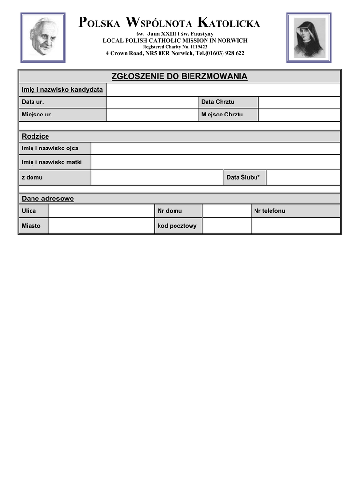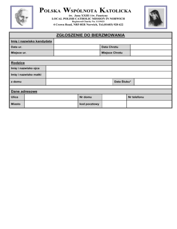 POLSKA WSPÓLNOTA KATOLICKA św. Jana XXIII i św. Faustyny LOCAL POLISH CATHOLIC MISSION IN NORWICH Registered Charity No. 1119423 4 Crown Road, NR5 0ER Norwich, Tel.(01603) 928 622 ZGŁOSZENIE DO BIERZMOWANIA Imię i nazwisko kandydata Data ur. Data Chrztu Miejsce ur. Miejsce Chrztu Rodzice Imię i nazwisko ojca Imię i nazwisko matki z domu Data Ślubu* Dane adresowe Ulica Nr domu Miasto kod pocztowy Nr telefonu