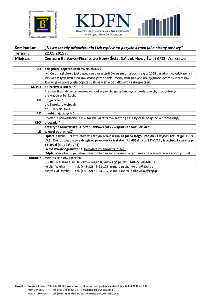 Seminarium Termin: Miejsce: „Nowe zasady dziedziczenia i ich wpływ na pozycję banku jako strony umowy” 22.09.2015 r. Centrum Bankowo-Finansowe Nowy Świat S.A., ul. Nowy Świat 6/12, Warszawa CO KOMU JAK JAK KTO ILE Kontakt osiągniesz poprzez udział w szkoleniu? • Celem szkolenia jest zapoznanie uczestników ze zmieniającymi się w 2015 zasadami dziedziczenia i wpływem tych zmian na zawierane przez bank umowy oraz nabycie umiejętności ochrony interesów banku jako wierzyciela poprzez ustanawianie dodatkowych zabezpieczeń. polecamy szkolenie? Pracownikom departamentów windykacyjnych, sprzedażowych, kredytowych, produktowych, prawnych w bankach. długo trwa ? ok. 6 godz. lekcyjnych od. 10.00 do 16.00 przebiegają zajęcia? Szkolenie prowadzone jest w formie warsztatów metodą case by case połączonych z dyskusją. prowadzi? Katarzyna Marczyńska, Arbiter Bankowy przy Związku Banków Polskich. wynosi odpłatność? Opłata z tytułu uczestnictwa w każdym seminarium za pierwszego uczestnika wynosi 699 zł (plus 23% VAT). Koszt uczestnictwa drugiego pracownika instytucji to 499zł (plus 23% VAT), trzeciego i czwartego po 299zł (plus 23% VAT). Liczba miejsc ograniczona. Decyduje kolejność zgłoszeń. Odpłatność obejmuje pełne uczestnictwo w seminarium, w tym: materiały szkoleniowe i poczęstunek. Związek Banków Polskich 00-380 Warszawa, ul. Kruczkowskiego 8, www.zbp.pl, fax. (+48-22) 48-68-100 Michał Wydra tel. (+48-22) 48-68-129, e-mail: [email protected]. Marta Polkowska tel. (+48-22) 48-68-137, e-mail: [email protected]. Kontakt: Związek Banków Polskich, 00-380 Warszawa, ul. Kruczkowskiego 8, www.zbp.pl, fax. (+48-22) 48-68-100 Michał Wydra tel. (+48-22) 48-68-129, e-mail: [email protected]. Marta Polkowska tel. (+48-22) 48-68-137, e-mail: [email protected]. JAKI JEST ZAKRES TEMATYCZNY SZKOLENIA? Program 1. Podstawowe zasady dziedziczenia: • data nabycia spadku - wpływ na umowy bankowe, • rodzaje dziedziczenia, • oznaczenie kręgu spadkobierców, • stanowisko prawne spadkobiercy i jego skutki (przyjęcie, odrzucenie spadku, przyjęcie spadku z dobrodziejstwem inwentarza), • nabycie zapisu windykacyjnego. 2. Ustalanie spadkobierców i zakresu ich zobowiązania: • postępowanie w sprawie stwierdzenia nabycia spadku i przedmiotu zapisu windykacyjnego, • postępowanie w przedmiocie działu spadku, • postępowanie o zabezpieczenie spadku, • spis inwentarza – tryb, skutki prawne dla wierzycieli, • wyjawienie przedmiotów spadkowych. 3. Problem zachowania tajemnicy bankowej wobec spadkobierców: • przy umowach rachunków bankowych, • przy umowach kredytowych, • problem spłaty zobowiązania przez osoby nie będące spadkobiercami. 4. Postępowanie banku związane ze środkami zgromadzonymi na rachunku zmarłego: • koszty pogrzebu, • zapis na wypadek śmierci, • wypłaty z rachunku wspólnego, • problem wspólności ustawowej małżeńskiej, • wypłaty dokonane przez osoby umocowane do rachunku po śmierci posiadacza, • problem limitu w rachunku. 5. Dochodzenie przez bank należności kredytowych od spadkobierców klienta banku: • tryb podejmowania czynności – uprawnienia banku związane z wniesieniem wniosku o stwierdzenie nabycia spadku i przystąpieniem do toczącego się postępowania, • uprawnienia banku związane z wniesieniem wniosku o zabezpieczenie spadku, • ustalenie właściwości sądu, • dokumenty niezbędne w postępowaniu spadkowym, • koszty postępowania spadkowego i zasady ich rozdziału. 6. Ustalenie za spadkobiercami sposobu spłaty zadłużenia i egzekucja należności wobec zobowiązanych 7. Postępowanie banku wobec: • poręczycieli spadkodawcy, • wspólników spółek osobowych, • pełnomocników spadkodawcy, • właścicieli nieruchomości stanowiących zabezpieczenie kredytu nie będących kredytobiorcami. Kontakt: Związek Banków Polskich, 00-380 Warszawa, ul. Kruczkowskiego 8, www.zbp.pl, fax. (+48-22) 48-68-100 Michał Wydra tel. (+48-22) 48-68-129, e-mail: [email protected]. Marta Polkowska tel. (+48-22) 48-68-137, e-mail: [email protected].