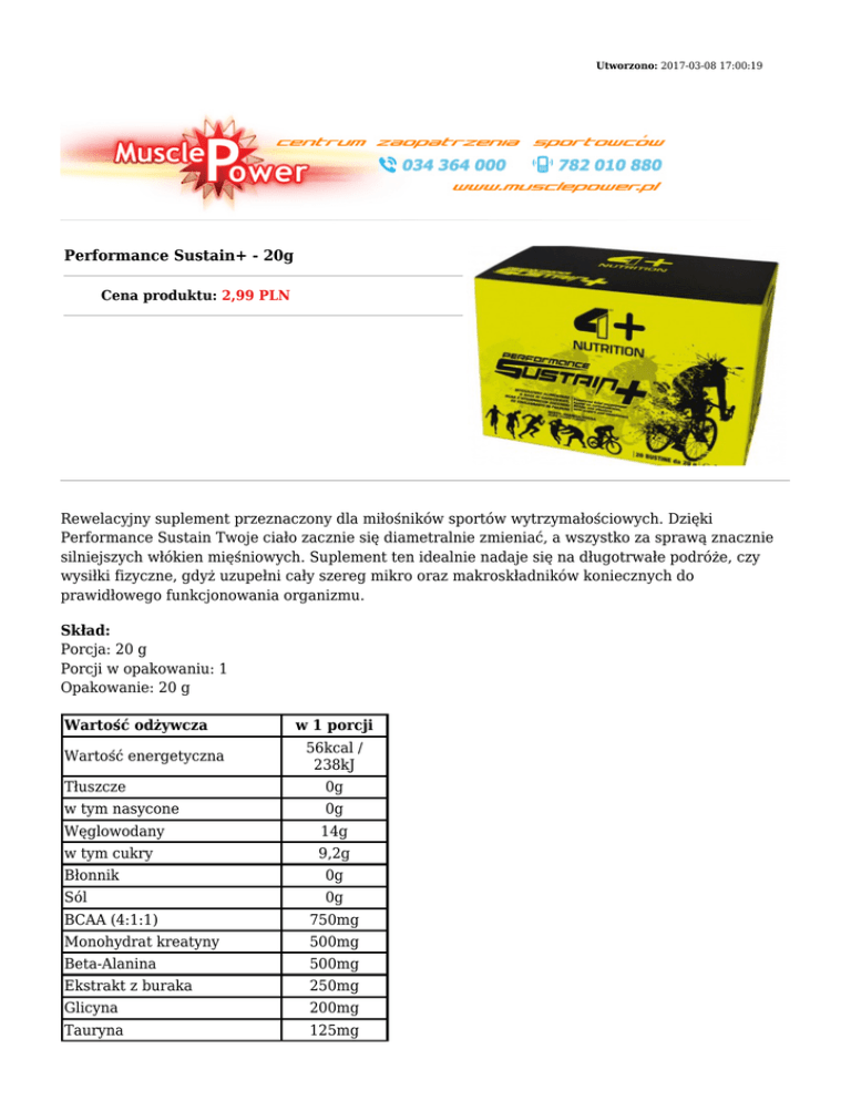 Utworzono: 2017-03-08 17:00:19 Performance Sustain+ - 20g Cena produktu: 2,99 PLN Rewelacyjny suplement przeznaczony dla miłośników sportów wytrzymałościowych. Dzięki Performance Sustain Twoje ciało zacznie się diametralnie zmieniać, a wszystko za sprawą znacznie silniejszych włókien mięśniowych. Suplement ten idealnie nadaje się na długotrwałe podróże, czy wysiłki fizyczne, gdyż uzupełni cały szereg mikro oraz makroskładników koniecznych do prawidłowego funkcjonowania organizmu. Skład: Porcja: 20 g Porcji w opakowaniu: 1 Opakowanie: 20 g Wartość odżywcza Wartość energetyczna w 1 porcji 56kcal / 238kJ Tłuszcze 0g w tym nasycone 0g Węglowodany 14g w tym cukry 9,2g Błonnik 0g Sól 0g BCAA (4:1:1) 750mg Monohydrat kreatyny 500mg Beta-Alanina 500mg Ekstrakt z buraka 250mg Glicyna 200mg Tauryna 125mg Acetyl L-karnityny 100mg Glutamina 100mg Witamina C 80mg Kwas pantotenowy 0,9mg Witamina B6 0,21mg Witamina B2 0,21mg Witamina B1 0,165mg Kwas foliowy 60mcg Biotyna 7,5mcg Witamina B12 0,75mcg 4+ ANTIOX ENERGY MATRIX 60mg Uva rossa 24mg Astralagus 12mg Sycylijskie pomarańcze 15mg Owoce Goji 6mg Maqui 3mg Polifenole 25mg Polisacharydy 12mg Dawkowanie: Zaleca się stosowanie jednej porcji dziennie. Marka MP Adres: http://www.muscle.trustnet.pl/ - Telefon: 34 36 43 000, 782 010 880 Email: [email protected]