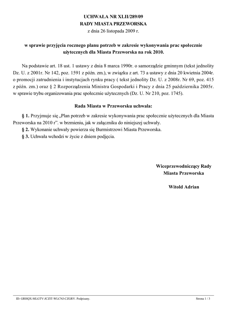 Uchwała Nr XLII/289/09 Rady Miasta Przeworska