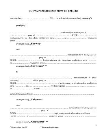 UMOWA PRZENIESIENIA PRAW DO DZIAŁKI zawarta dnia ……………….……………... 201….. r. w Lublinie (zwana dalej „umową”) pomiędzy: …………........................…………......................……., zamieszkałym w (kod poczt.) …..........… …………….…….. przy ul. ……...….......................................……, PESEL ….………………, legitymującym się dowodem osobistym: seria……..……nr…………….………., wydanym przez …………….............................................................................................. zwanym dalej „Zbywcą” oraz …………………........................................…………..........…., zamieszkałym w (kod pocztowy) ……..................……………..….. przy ul. …………………...............................................…………, PESEL …………….…………….…, legitymującym się dowodem osobistym seria …..……. nr……………..………. wydanym przez ........................................................................…………… zwanym dalej „Zbywcami” ** a …………………...................................................................………., zamieszkałym w (kod pocztowy)…….........….Lublin przy ul. ……....……...........…….................................………, PESEL ………………………………………………, legitymującym się dowodem osobistym seria ………..…. nr……………..…………. wydanym przez .......................….......…………… tel. ……………………… e-mail …………………………….……. adres do korespondencji: ……………………………………………………………………………… zwanym dalej „Nabywcą” oraz ………………….............................................................………., zamieszkałym w (kod pocztowy) …........……………..……….....….. przy ul. …..............................................................…………, PESEL ………………………………………………, legitymującym się dowodem osobistym seria …………. nr………………………. wydanym przez …………………………...….............. …… zwanym dalej „Nabywcami” ** *Niepotrzebne skreślić **Dla współmałżonków 1 §1 1. Zbywca oświadcza, że: przysługuje mu prawo do działki nr ……….… o powierzchni ………....…m 2, położonej na terenie Rodzinnego Ogrodu Działkowego „Kalina” w Lublinie przy ul. Zawilcowej 2, zwanej dalej „działką”; przysługujące mu prawo do działki wynika z: a) uchwały Zarządu PZD Rodzinnego Ogrodu Działkowego „Kalina” w Lublinie z dnia ………………………………. i przekształcone na mocy art. 66 pkt 2 ustawy z dnia 13 grudnia 2013 roku o rodzinnych ogrodach działkowych w prawo do działki ustanawiane w drodze umowy dzierżawy działkowej*, b) umowy przeniesienia praw do działki, zawartej w dniu ……….……………., zatwierdzonej uchwałą Nr ............ Zarządu Rodzinnego Ogrodu Działkowego „Kalina” w Lublinie przy ul. Zawilcowej 2 z dnia ……………………. *, c) umowy dzierżawy działkowej zawartej w dniu ………………..……….*, działka jest wolna od jakichkolwiek obciążeń osób trzecich, a w szczególności nie jest oddana innym osobom w dzierżawę działkową; wszelkie nasadzenia, urządzenia i obiekty znajdujące się na działce stanowią jego własność zgodnie z art. 30 ust. 2 ustawy z dnia 13 grudnia 2013 roku o rodzinnych ogrodach działkowych oraz są zgodne z obowiązującym prawem; nie zalega z opłatami ogrodowymi wobec Rodzinnego Ogrodu Działkowego „Kalina” w Lublinie. 2. Nabywca oświadcza, że: nie przysługuje mu prawo do innej działki, niż określona w ust. 1, położonej w jakimkolwiek rodzinnym ogrodzie działkowym; ubiega się o działkę wyłącznie w celu jej wykorzystania w zakresie prowadzenia upraw ogrodniczych, wypoczynku i rekreacji; zapoznał się z obowiązującym Regulaminem Rodzinnego Ogrodu Działkowego oraz ustawą z dnia 13 grudnia 2013 roku o rodzinnych ogrodach działkowych, zwaną dalej „ustawą”; przed zawarciem umowy sprawdził oraz akceptuje stan prawny oraz faktyczny dotyczący działki. §2 1. Przedmiotem niniejszej umowy jest przeniesienie praw i obowiązków wynikających z prawa do działki zgodnie z art. 41 ustawy, a także określenie warunków zapłaty i wysokość wynagrodzenia za znajdujące się na działce nasadzenia, urządzenia i obiekty. 2. Niniejsza umowa określa również prawa i obowiązki, które Zbywca przenosi na rzecz Nabywcy. *Niepotrzebne skreślić **Dla współmałżonków 2 §3 1. Zbywca przenosi na rzecz Nabywcy prawa i obowiązki wynikające z prawa do działki oraz własność znajdujących się na działce nasadzeń, urządzeń i obiektów. 2. Z tytułu przeniesienia własności nasadzeń, urządzeń i obiektów, o których mowa w ust. 1, Nabywca zapłaci na rzecz Zbywcy wynagrodzenie w wysokości ...............……. zł (słownie: …………………………..……………………………………………..………zł). 3. Zapłata wynagrodzenia, o którym mowa w ust. 2, nastąpi w terminie …………………. . §4 1. Skuteczność przeniesienia praw do działki wynikającego z niniejszej umowy zależy od zatwierdzenia przez Zarząd stowarzyszenia Rodzinny Ogród Działkowy „Kalina” w Lublinie na zasadach określonych w art. 41 ustawy. 2. Nabywca zobowiązuje się, że w terminie .…. dni od zawarcia niniejszej umowy, złoży do Zarządu stowarzyszenia ogrodowego Rodzinny Ogród Działkowy„Kalina” w Lublinie przy ul. Zawilcowej 2 pisemny wniosek o zatwierdzenie przeniesienie praw do działki. Do tego wniosku Nabywca załączy jeden egzemplarz zawartej umowy. 3. W przypadku odmowy zatwierdzenia przeniesienia pra