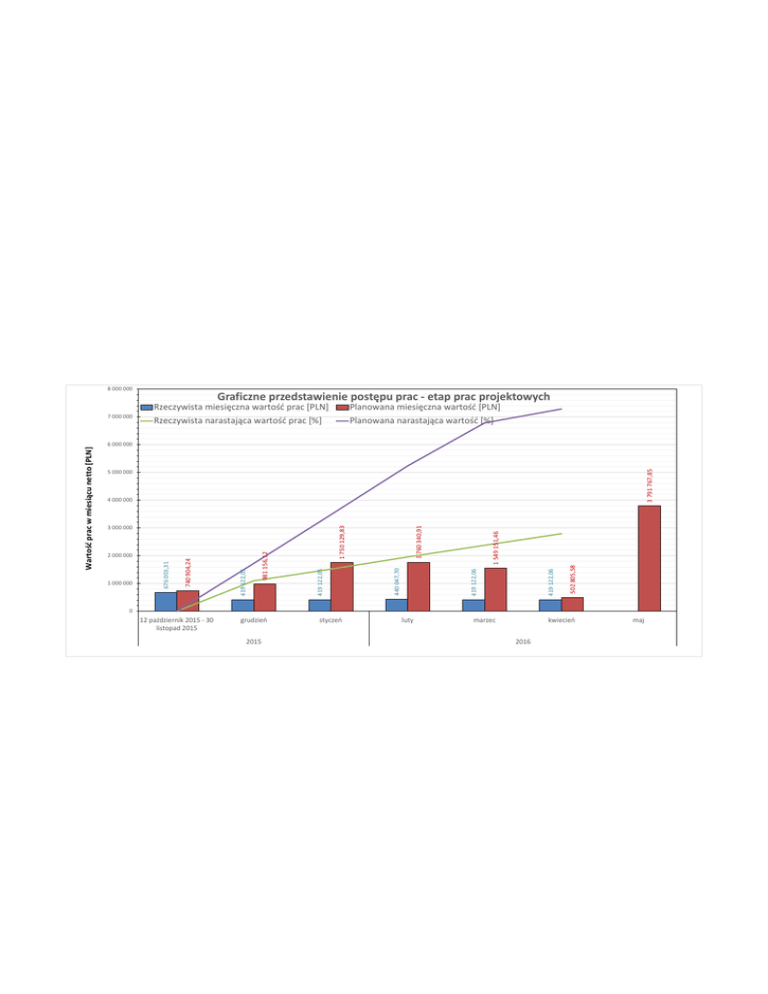 8 000 000 Planowana miesięczna wartość [PLN] Planowana narastająca wartość [%] 3 791 767,85 6 000 000 5 000 000 502 805,58 419 122,06 1 549 151,46 419 122,06 440 047,70 1 750 129,83 981 156,12 419 122,05 1 000 000 419 122,05 2 000 000 740 904,24 3 000 000 1 760 340,91 4 000 000 676 003,31 Wartość prac w miesiącu netto [PLN] 7 000 000 Graficzne przedstawienie postępu prac - etap prac projektowych Rzeczywista miesięczna wartość prac [PLN] Rzeczywista narastająca wartość prac [%] 0 12 październik 2015 - 30 listopad 2015 grudzień 2015 styczeń luty marzec kwiecień 2016 maj