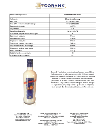 Pełna nazwa produktu Toorank Pina Colada Kategoria Likier śmietanowy Kod EAN 8712436100682 Kod EAN opakowania zbiorczego 8712436120680 Zawartość alkoholu 16,00% Pojemność 0,7L Sposób pakowania Karton 6x0,7 L Ilość sztuk w opakowaniu zbiorczym 6 Szerokość produktu 74mm Wysokość produktu 270mm Głębokość produktu 74mm Szerokość kartonu zbiorczego 235mm Wysokość kartonu zbiorczego 280mm Głębokość kartonu zbiorczego 160mm Masa produktu 1200g Ilość kartonów na warstwie 25 Ilość kartonów na palecie 100 Toorank Pina Colada to doskonałe połączenie rumu, likieru kokosowego oraz soku ananasowego. Ma delikatny smak i aromatyczny zapach. Podaje się ją z lodem, plastrem ananasa i sokiem z cytryny. Swoją popularność zawdzięcza m.in. piosence z 1979 roku: „Escape” (znanej również jako „The Pina Colada Song”), którą zaśpiewał Rupert Holmes. Przepis na tego drinka jest prosty i można go znaleźć na oficjalnej liście koktajli IBA (International Bartenders Association). Toorank Polska S.A. Jasienica 607, 43-385 Jasienica Tel. +48 33 815 26 27/30 Fax: +48 33 815 28 48 e-mail: info@toorank com.pl Internet:www.toorank.com Numer rachunku bankowego w PLN: ING Bank Śląski o/B-B IBAN:PL 07 1050 1070 1000 0022 1970 6567 BIC Code: INGBPLPW Numer rachunku bankowego w EURO: ING Bank Śląski o/B-B IBAN:PL 37 1050 1070 1000 0022 7062 2588 BIC Code: INGBPLPW Sąd Rejonowy w Bielsku – Białej VIII Wydział Gospodarczy Krajowego Rejestru Sądowego NR: 0000022014 NIP: 547-14-24-127 REGON 070739216 Wysokość kapitału akcyjnego: 2 500 000 zł, w całości wpłacony