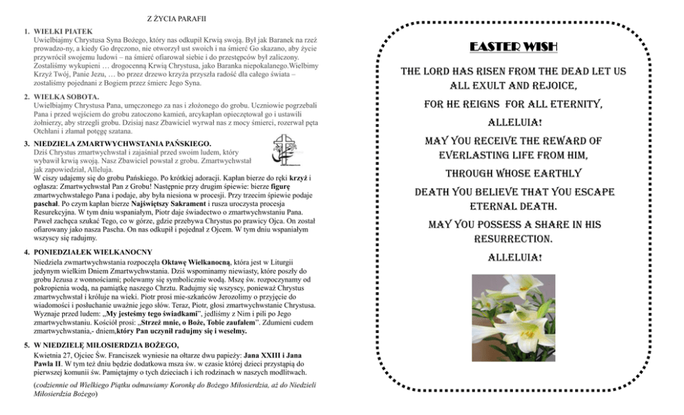 Z ŻYCIA PARAFII 1. WIELKI PIATEK Uwielbiajmy Chrystusa Syna Bożego, który nas odkupił Krwią swoją. Był jak Baranek na rzeź prowadzo-ny, a kiedy Go dręczono, nie otworzył ust swoich i na śmierć Go skazano, aby życie przywrócił swojemu ludowi – na śmierć ofiarował siebie i do przestępców był zaliczony. Zostaliśmy wykupieni … drogocenną Krwią Chrystusa, jako Baranka niepokalanego.Wielbimy Krzyż Twój, Panie Jezu, … bo przez drzewo krzyża przyszła radość dla całego świata – zostaliśmy pojednani z Bogiem przez śmierc Jego Syna. 2. WIELKA SOBOTA. Uwielbiajmy Chrystusa Pana, umęczonego za nas i złożonego do grobu. Uczniowie pogrzebali Pana i przed wejściem do grobu zatoczono kamień, arcykapłan opieczętował go i ustawili żołnierzy, aby strzegli grobu. Dzisiaj nasz Zbawiciel wyrwał nas z mocy śmierci, rozerwał pęta Otchłani i złamał potęgę szatana. 3. NIEDZIELA ZMARTWYCHWSTANIA PAŃSKIEGO. Dziś Chrystus zmartwychwstał i zajaśniał przed swoim ludem, który wybawił krwią swoją. Nasz Zbawiciel powstał z grobu. Zmartwychwstał jak zapowiedział, Alleluja. W ciszy udajemy się do grobu Pańskiego. Po krótkiej adoracji. Kapłan bierze do ręki krzyż i ogłasza: Zmartwychwstał Pan z Grobu! Następnie przy drugim śpiewie: bierze figurę zmartwychwstałego Pana i podaje, aby była niesiona w procesji. Przy trzecim śpiewie podaje paschał. Po czym kapłan bierze Najświętszy Sakrament i rusza uroczysta procesja Resurekcyjna. W tym dniu wspaniałym, Piotr daje świadectwo o zmartwychwstaniu Pana. Paweł zachęca szukać Tego, co w górze, gdzie przebywa Chrystus po prawicy Ojca. On został ofiarowany jako nasza Pascha. On nas odkupił i pojednał z Ojcem. W tym dniu wspaniałym wszyscy się radujmy. 4. PONIEDZIAŁEK WIELKANOCNY Niedziela zwmartwychwstania rozpoczęła Oktawę Wielkanocną, która jest w Liturgii jedynym wielkim Dniem Zmartwychwstania. Dziś wspominamy niewiasty, które poszły do grobu Jezusa z wonnościami; polewamy się symbolicznie wodą. Mszę św. rozpoczynamy od pokropienia wodą, na pamiątkę naszego Chrztu. Radujmy się wszyscy, ponieważ Chrystus zmartwychwstał i króluje na wieki. Piotr prosi mie-szkańców Jerozolimy o przyjęcie do wiadomości i posłuchanie uważnie jego słów. Teraz, Piotr, głosi zmartwychwstanie Chrystusa. Wyznaje przed ludem: „My jesteśmy tego świadkami”, jedliśmy z Nim i pili po Jego zmartwychwstaniu. Kościół prosi: „Strzeż mnie, o Boże, Tobie zaufałem”. Zdumieni cudem zmartwychwstania,- dniem,który Pan uczynił radujmy się i weselmy. 5. W NIEDZIELĘ MIŁOSIERDZIA BOŻEGO, Kwietnia 27, Ojciec Św. Franciszek wyniesie na ołtarze dwu papieży: Jana XXIII i Jana Pawla II. W tym też dniu będzie dodatkowa msza św. w czasie której dzieci przystąpią do pierwszej komunii św. Pamiętajmy o tych dzieciach i ich rodzinach w naszych modlitwach. (codziennie od Wielkiego Piątku odmawiamy Koronkę do Bożego Miłosierdzia, aż do Niedzieli Miłosierdzia Bożego) EASTER WISH The Lord has risen from the dead let us all exult and rejoice, for he reigns for all eternity, alleluia! may YOU receive the reward of everlasting life from him, through whose earthly death you believe That you escape eternal death. May you possess a share in his Resurrection. Alleluia! CANNONIZATION OF BOTH POPE JOHN XXIII AND POPE JOHN PAUL II WILL TAKE PLACE ON APRIL 27, 2014 Pope John the XXIII entered his papacy at the age of 77 with an already rich experience of life formed by living and working in a variety of diverse cultures, religions, and peoples. He brought with him a practical knowledge of poverty and riches, of ministering in wars and in peace. This knowledge proved to be invaluable as he was propelled into a leadership role for not only the Church but the secular world. He knew that the Church could not be kept separate from the workings of the world. He strongly believed that spiritual values needed to be exerted as the “guiding influence” on all c” components” such as culture, social institutions, economics, politics, law and science – all that made up “ the external community” of humanity and “its continual development” (Pacemin Terris#36). Above all John XXIII upheld the pursuit of truth and freedom as basic needs for both men and women: that each person should be free to seek truth and meaning as a right in itself. He promoted the dignity of employment, the essentiality of care and stability for the aged, disabled and those suffering loss. He became an essential pivot for balancing the spiritual with the secular: of not losing sight of one by focusing solely on the other. That was his greatest legacy. He not only reshaped single-handedly the role and activities of the papacy and the institutional Catholic Church, but his thirst for unity and peace introduced the atmosphere for dialogue as an alternative to defense. He reminded us that there’s a better way to steer the course of history and “prepare a glorious future”. “We have to do it together, he said. And we have to do it with God”. Pope John Paul II became Pope at the age of 58. He was the second longest Pope in history. His Papacy was 27 years and was one of the most travelled world leaders in history, visiting 129 countries during his pontificate. As the dawn of the third millennium approached, Pope John Paul II began to lay out the steps that were to mark one of the most remarkable years in the history of Christendom. The year 2000 was designed to kick-start what the Pope liked to call the “new evangelization”. Though he called it “new” he acknowledged that in many countries with Christian histories, it was an attempt to re-evangelize Christians who had fallen away from the practice of their faith. The Pope often lamented that many lived “lives of practical atheism,” or acted as if God did not exist, though they may be nominal Christians. The Pope came to Toronto during World Youth 