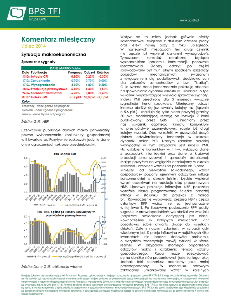 Komentarz miesięczny Lipiec 2014 Sytuacja makroekonomiczna Sprzeczne sygnały Źródło: GUS, NBP Czerwcowe publikacje danych makro potwierdziły pewne wyhamowanie koniunktury gospodarczej w II kwartale br. Pozytywnie zaskoczyły jedynie dane o wynagrodzeniach sektorze przedsiębiorstw. Źródło: Dane GUS, obliczenia własne Wpływ na to miały jednak głównie efekty kalendarzowe, związane z dłuższym czasem pracy oraz efekt niskiej bazy z roku ubiegłego. W następnych miesiącach ten drugi czynnik nie będzie już wspierał dynamiki wynagrodzeń. Tymczasem sprzedaż detaliczna, będąca wyznacznikiem poziomu konsumpcji, ponownie rozczarowała. Słabszy odczyt po części spowodowany był m.in. silnym spadkiem sprzedaży pojazdów mechanicznych, związanym z wygaszeniem ulg podatkowych dedykowanych dla zakupów samochodów z tzw. ”kratką”. O ile twarde dane jednoznacznie pokazują obecnie na spowolnienie dynamiki wzrostu w II kwartale, o tyle wskaźniki wyprzedzające wysyłają sprzeczne sygnały. Indeks PMI uśredniony dla 3 miesięcy wyraźnie sygnalizuje trend spadkowy. Miesięczny odczyt indeksu obniżył się już czwarty kolejny raz (łącznie o 5,6 pkt.) i znajduje się tylko nieco powyżej granicy 50 pkt., oddzielającej recesję od rozwoju. Z kolei publikowany przez GUS i uśredniony przez nas wskaźnik ogólnego klimatu koniunktury w przetwórstwie przemysłowym, rośnie już drugi kolejny kwartał. Oba wskaźniki w przeszłości dosyć dobrze odzwierciedlały tendencje w zakresie dynamiki zmian PKB. Naszym zdaniem bardziej wiarygodny w tym przypadku jest indeks PMI. Na osłabienie koniunktury w II kw. wskazują dane z gospodarki niemieckiej oraz dane o krajowej produkcji przemysłowej i sprzedaży detalicznej. Mając powyższe na względzie oczekujemy w okresie kwiecień - czerwiec wzrostu na poziomie ok. 3 proc. Mniejszy, od pierwotnie zakładanego, wzrost gospodarczy poparty ujemnymi odczytami inflacji konsumenckiej w okresie letnim, będzie wspierał wzrost oczekiwań na redukcje stóp procentowych NBP. Lipcowa projekcja inflacyjna NBP pokazała wyraźnie niższą prognozowaną ścieżkę przyszłej inflacji w stosunku do projekcji z marca br. Równocześnie wypowiedzi prezesa NBP i części członków RPP wciąż nie są jednoznaczne w tej kwestii. Po lipcowym posiedzeniu RPP padły sugestie, iż prawdopodobieństwo obniżki we wrześniu (najbliższe posiedzenie decyzyjne) jest niskie. Równocześnie w kolejnych miesiącach RPP pozostawia sobie otwarta drogę do wszelkich działań. Zatem naszym zdaniem, w sytuacji gdy wiadomym jest, iż presja inflacyjna w najbliższych kilku kwartałach nie będzie stanowiła problemu, o wszystkim zadecyduje rozwój sytuacji w sferze realnej. W przypadku istotnego pogorszenia odczytów makro i osłabienia tempa wzrostu gospodarczego, Rada może zdecydować się na obniżkę stóp procentowych jesienią tego roku. Jednak taki scenariusz oceniamy jako mniej prawdopodobny. W scenariuszu bazowym zakładamy umiarkowany wzrost w kolejnych Niniejszy dokument ma charakter wyłącznie informacyjny. Prognozy i opinie zawarte w niniejszym opracowaniu są wyrazem oceny BPS TFI S.A. i mogą ulec zmianie bez zapowiedzi. Dokument ten nie powinien być rozumiany jako materiał o charakterze doradczym lub jako podstawa do podejmowania decyzji inwestycyjnych lub rekomendacja inwestycyjna, w szczególności nie stanowi on rekomendacji w rozumieniu Rozporządzenia Ministra Finansów z 19 października 2005 r. w sprawie informacji stanowiących rekomendacje dotyczące instrumentów finansowych, ich emitentów lub wystawców (Dz. U. Nr 206, poz. 1715). Pomimo dołożenia należytej staranności przy sporządzaniu niniejszego dokumentu BPS TFI S.A. nie może zapewnić, że prezentowane opinie okażą się trafne, a sytuacja na rynku nie ulegnie zmianie, w szczególności w stosunku do określonych instrumentów finansowych. BPS TFI S.A. nie ponosi jakiejkolwiek odpowiedzialności za działania lub zaniechania podjęte na podstawie niniejszego dokumentu, w szczególności za decyzje inwestycyjne podjęte na podstawie niniejszego komentarza ani za szkody poniesione w wyniku tych decyzji inwestycyjnych. kwartałach na poziomach nieco powyżej, ale blisko 3 procent, co powinno sprzyjać stabilizacji stóp procentowych w dłuższym okresie na obecnym poziomie. Rynek akcji Przewaga czynników negatywnych Czerwiec na GPW okazał się jeszcze gorszy niż maj. Indeks szerokiego rynku, czyli indeks WIG zakończył miesiąc na minusie, odnotowując spadek o 0,3 proc., a indeks największych spółek WIG20 obniżył się o prawie 0,9 proc. Na przełomie czerwca i lipca indeks WIG20 wybił się dołem poniżej poziomów wsparcia utworzonych przez dołki z lipca, września ub. oraz tegoroczne minima ze stycznia, marca i maja. Techniczne może to sugerować spadki. na poziomie 15,1 procent. Wzrosty na rynkach rozwiniętych to oczywiście efekt stopniowego powrotu zaufania inwestorów w ożywienie gospodarcze oraz polityki ultra niskich stóp procentowych banków centralnych. W tej sytuacji kapitał spekulacyjny płynie z rynków wschodzących na rynki rozwinięte. W przypadku Polski, negatywnie na sytuację na giełdzie wpływał jeszcze do niedawna kryzys ukraiński. Obecnie ten czynnik zszedł na drugi plan. Za to wciąż ciąży kwestia OFE. Do końca lipca zdecyduje się, ile osób pozostanie w OFE. Obawy, iż będzie to jedynie kilka procent oznaczają, że rocznie z tego tytułu wpłaty do systemu będą niskie. Tymczasem OFE będą musiały odprowadzać rocznie do ZUS kilka miliardów złotych, w zależności od ilości osób deklarujących pozostanie w OFE, w ramach tzw. suwaka. Zatem popyt na akcje z tej strony wyraźnie osłabnie. O skali zagrożenia świadczy fakt, iż w ostatnich latach OFE zasilały giełdę ok. 20 mld złotych rocznie. Źródło: Dane Bloomberg Słabość warszawskiej giełdy nie podlega zatem dyskusji. Dobitniej to zjawisko jest wi