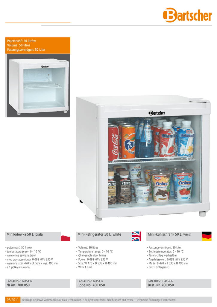 Pojemność: 50 litrów Volume: 50 litres Fassungsvermögen: 50 Liter Minilodówka 50 L, biała • pojemność: 50 litrów • temperatura pracy: 0 - 10 °C • wymienne zawiasy drzwi • moc przyłączeniowa: 0,068 kW / 230 V • wymiary: szer. 470 x gł. 535 x wys. 490 mm • z 1 półką wsuwaną EAN 4015613415437 Nr art. 700.050 08/2011 Mini-Refrigerator 50 L, white • Volume: 50 litres • Temperature range: 0 - 10 °C • Changeable door hinge • Power: 0,068 kW / 230 V • Size: W 470 x D 535 x H 490 mm • With 1 grid EAN 4015613415437 Code-No. 700.050 Mini-Kühlschrank 50 L, weiß • Fassungsvermögen: 50 Liter • Betriebstemperatur: 0 - 10 °C • Türanschlag wechselbar • Anschlusswert: 0,068 kW / 230 V • Maße: B 470 x T 535 x H 490 mm • mit 1 Einlegerost EAN 4015613415437 Best.-Nr. 700.050 Zastrzega się prawo wprowadzania zmian technicznych. • Subject to technical modifications and errors. • Technische Änderungen vorbehalten.