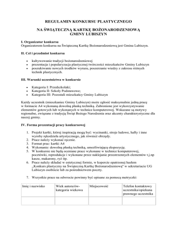 REGULAMIN KONKURSU PLASTYCZNEGO NA ŚWIĄTECZNĄ KARTKĘ BOŻONARODZENIOWĄ GMINY LUBISZYN I. Organizator konkursu Organizatorem konkursu na Świąteczną Kartkę Bożonarodzeniową jest Gmina Lubiszyn. II. Cel i przedmiot konkursu kultywowanie tradycji bożonarodzeniowej prezentacja i popularyzacja plastycznej twórczości mieszkańców Gminy Lubiszyn poszukiwanie nowych środków wyrazu, poszerzanie wiedzy z zakresu różnych technik plastycznych. III. Warunki uczestnictwa w konkursie Kategoria I: Przedszkolaki; Kategoria II: Szkoły Podstawowe; Kategoria III: Pozostali mieszkańcy Gminy Lubiszyn Każdy uczestnik (mieszkaniec Gminy Lubiszyn) może zgłosić maksymalnie jedną pracę w formacie A4 wykonaną dowolną płaską techniką. Zabronione jest wykorzystywanie elementów gotowych lub wykonanych w technice komputerowej. Wskazane są motywy regionalne, związane z tradycją Świąt Bożego Narodzenia oraz akcenty charakterystyczne dla naszej gminy. IV. Forma prezentacji pracy konkursowej 1. Projekt kartki, której inspiracją mogą być: wycinanki, stroje ludowe, hafty i inne wyroby rękodzieła artystycznego, jak również obrzędy. 2. Prace należy wykonać ręcznie. 3. Format prac: kartki A4 4. Wykonanie: dowolną płaską techniką, umożliwiającą ekspozycję. 5. W konkursie nie będą oceniane prace wykonane w technice komputerowej, pocztówki, reprodukcje i wykonane przez naklejanie przestrzennych elementów t.j.np kasze, makarony, ryż itp. 6. Prace należy składać w estetycznej formie, w kopercie opatrzonej hasłem ,,Konkurs plastyczny na Świąteczną Kartkę Bożonarodzeniową'' w sekretariacie UG Lubiszyn osobiście lub za pośrednictwem poczty. 7. Wszystkie prace na odwrocie powinny być opisane za pomocą metryczki: Imię i nazwisko Wiek autora/ówkategoria wiekowa Miejscowość Telefon kontaktowy uczestnika/opiekuna prawnego uczestnika 8. Do prac należy dołączyć Zgodę na przetwarzanie danych osobowych (Załącznik nr 1 do Regulaminu) oraz zgodę na wykorzystanie wizerunku/prac plastycznych w celach konkursowych oraz wykonania i rozpowszechniania kartki świątecznej Gminy Lubiszyn (Załącznik nr 2 do Regulaminu). V. Miejsce i termin składania prac konkursowych 1. Prace należy składać do dnia 15 listopada 2016 r. do godz. 15:00 do Urzędu Gminy Lubiszyn, Plac Jedności Robotniczej 1, 66-433 Lubiszyn. 2. Prace konkursowe nie spełniające wymagań, o których mowa w regulaminie konkursu, nie będą podlegały ocenie Komisji Konkursowej. 3. Prace dostarczone po terminie oraz prace dostarczone bez wymaganych oświadczeń i metryczki nie będą oceniane. 4. Organizator nie zwraca prac. 5. Organizatorzy zastrzegają sobie prawo do reprodukowania prac w celach popularyzatorskich. VI. Ocena prac konkursowych Zwycięskie prace zostaną wybrane przez Komisję Konkursową powołaną przez Wójta Gminy Lubiszyn. VII. Rozstrzygnięcie konkursu 1. W wyniku postępowania konkursowego Komisja Konkursowa dokona oceny prac i przyzna nagrody w trzech kategoriach wiekowych. 2. Planowana data ogłoszenia wyników 21 listopada 2016r. 3. Wyniki zostaną zamieszczone na stronie internetowej Urzędu Gminy Lubiszyn oraz na tablicy ogłoszeń w siedzibie w Urzędu Gminy Lubiszyn. 4. Za zajęcie miejsc I-III w poszczególnych kategoriach uczestnicy otrzymają nagrody rzeczowe. 5. Nagrodzone prace zostaną wykorzystane do projektu kartek świątecznych, które będą rozsyłane przez Gminę Lubiszyn do mieszkańców, instytucji i kontrahentów, a także okładki świątecznego wydania „Wieści Lubiszyńskich”. W przypadku zapytań i wątpliwości prosimy o kontakt telefoniczny z Panią Insp. Anną Rajską- Pura - tel. UG Lubiszyn 519 513 148 Lubiszyn, 27 października 2016 r. (-) Artur Terlecki Wójt Gminy Lubiszyn