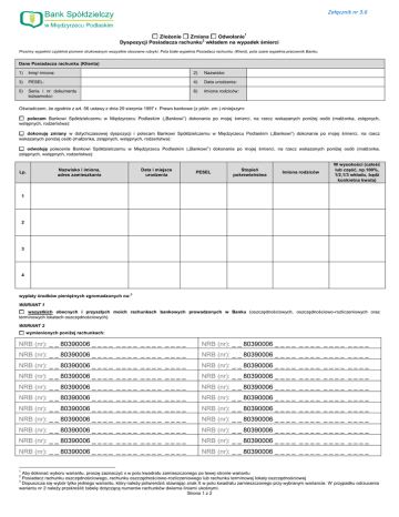Załącznik nr 3.6 Załącznik nr 3 1 Złożenie Zmiana Odwołanie 2 Dyspozycji Posiadacza rachunku wkładem na wypadek śmierci Prosimy wypełnić czytelnie pismem drukowanym wszystkie stosowne rubryki. Pola białe wypełnia Posiadacz rachunku (Klient), pola szare wypełnia pracownik Banku. do Uchwały Zarządu BS nr 91/2015 z dnia 16-12-2015 r. Dane Posiadacza rachunku (Klienta) 1) Imię/ imiona: 2) Nazwisko: 3) PESEL: 4) Data urodzenia: 5) Seria i nr dokumentu tożsamości: 6) Imiona rodziców: Oświadczam, że zgodnie z art. 56 ustawy z dnia 29 sierpnia 1997 r. Prawo bankowe (z późn. zm.) niniejszym: polecam Bankowi Spółdzielczemu w Międzyrzecu Podlaskim („Bankowi”) dokonanie po mojej śmierci, na rzecz wskazanych poniżej osób (małżonka, zstępnych, wstępnych, rodzeństwa): dokonuję zmiany w dotychczasowej dyspozycji i polecam Bankowi Spółdzielczemu w Międzyrzecu Podlaskim („Bankowi”) dokonanie po mojej śmierci, na rzecz wskazanych poniżej osób (małżonka, zstępnych, wstępnych, rodzeństwa): odwołuję polecenie Bankowi Spółdzielczemu w Międzyrzecu Podlaskim („Bankowi”) dokonania po mojej śmierci, na rzecz wskazanych poniżej osób (małżonka, zstępnych, wstępnych, rodzeństwa): Lp. Nazwisko i imiona, adres zamieszkania Data i miejsce urodzenia PESEL Stopień pokrewieństwa Imiona rodziców W wysokości (całość lub część, np.100%, 1/2,1/3 wkładu, bądź konkretna kwota) 1 2 3 4 wypłaty środków pieniężnych zgromadzonych na: 3 WARIANT 1 wszystkich obecnych i przyszłych moich rachunkach bankowych prowadzonych w Banku (oszczędnościowych, oszczędnościowo-rozliczeniowych oraz terminowych lokatach oszczędnościowych). WARIANT 2 wymienionych poniżej rachunkach: NRB (nr): _ _ 80390006 _ _ _ _ _ _ _ _ _ _ _ _ _ _ _ _ NRB (nr): _ _ 80390006 _ _ _ _ _ _ _ _ _ _ _ _ _ _ _ _ NRB (nr): _ _ 80390006 _ _ _ _ _ _ _ _ _ _ _ _ _ _ _ _ NRB (nr): _ _ 80390006 _ _ _ _ _ _ _ _ _ _ _ _ _ _ _ _ NRB (nr): _ _ 80390006 _ _ _ _ _ _ _ _ _ _ _ _ _ _ _ _ NRB (nr): _ _ 80390006 _ _ _ _ _ _ _ _ _ _ _ _ _ _ _ _ NRB (nr): _ _ 80390006 _ _ _ _ _ _ _ _ _ _ _ _ _ _ _ _ NRB (nr): _ _ 80390006 _ _ _ _ _ _ _ _ _ _ _ _ _ _ _ _ NRB (nr): _ _ 80390006 _ _ _ _ _ _ _ _ _ _ _ _ _ _ _ _ NRB (nr): _ _ 80390006 _ _ _ _ _ _ _ _ _ _ _ _ _ _ _ _ NRB (nr): _ _ 80390006 _ _ _ _ _ _ _ _ _ _ _ _ _ _ _ _ NRB (nr): _ _ 80390006 _ _ _ _ _ _ _ _ _ _ _ _ _ _ _ _ NRB (nr): _ _ 80390006 _ _ _ _ _ _ _ _ _ _ _ _ _ _ _ _ NRB (nr): _ _ 80390006 _ _ _ _ _ _ _ _ _ _ _ _ _ _ _ _ NRB (nr): _ _ 80390006 _ _ _ _ _ _ _ _ _ _ _ _ _ _ _ _ NRB (nr): _ _ 80390006 _ _ _ _ _ _ _ _ _ _ _ _ _ _ _ _ NRB (nr): _ _ 80390006 _ _ _ _ _ _ _ _ _ _ _ _ _ _ _ _ NRB (nr): _ _ 80390006 _ _ _ _ _ _ _ _ _ _ _ _ _ _ _ _ NRB (nr): _ _ 80390006 _ _ _ _ _ _ _ _ _ _ _ _ _ _ _ _ NRB (nr): _ _ 80390006 _ _ _ _ _ _ _ _ _ _ _ _ _ _ _ _ NRB (nr): _ _ 80390006 _ _ _ _ _ _ _ _ _ _ _ _ _ _ _ _ NRB (nr): _ _ 80390006 _ _ _ _ _ _ _ _ _ _ _ _ _ _ _ _ 1 Aby dokonać wyboru wariantu, proszę zaznaczyć x w polu kwadratu zamieszczonego po lewej stronie wariantu Posiadacz rachunku oszczędnościowego, rachunku oszczędnościowo-rozliczeniowego lub rachunku terminowej lokaty oszczędnościowej Dopuszcza się wybór tylko jednego wariantu, który należy potwierdzić stawiając znak X w polu kwadratu zamieszczonego przy wybranym wariancie. W przypadku odrzucenia wariantu nr 2 należy przekreślić tabelę dotyczącą numerów rachunków dwiema liniami ukośnymi. Strona 1 z 2 2 3 Przyjmuję do wiadomości, że: 1) 2) 3) 4) 5) 6) Zwrot kosztów pogrzebu ma pierwszeństwo przed dyspozycją na wypadek śmierci i następuje ze środków zgromadzonych na rachunkach bankowych na podstawie przedłożonych rachunków stwierdzających wysokość poniesionych wydatków. Wypłata z rachunków objętych dyspozycją, łącznie na rzecz wszystkich zapisobierców, nie może być wyższa niż przypadające na ostatni miesiąc przed śmiercią posiadacza rachunku dwudziestokrotne przeciętne miesięczne wynagrodzenie w sektorze przedsiębiorstw bez wypłat nagród z zysku, ogłaszane przez Prezesa Głównego Urzędu Statystycznego, nie przekraczające jednak wysokości środków na wszystkich wymienionych rachunkach. Dyspozycja na rzecz zapisobierców realizowana będzie do wysokości: a) aktualnego salda rachunków objętych dyspozycją, powiększonego o należne odsetki, b) maksymalnej kwoty zapisu o której mowa w pkt. 2 (ewentualna nadwyżka przypada spadkobiercom). Bank Spółdzielczy w Międzyrzecu Podlaskim nie ponosi odpowiedzialności za ewentualne wypłaty z rachunków oszczędnościowych podjęte przez pełnomocnika po śmierci Posiadacza rachunku, do czasu odwołania pełnomocnictwa lub powiadomienia Banku Spółdzielczego w Międzyrzecu Podlaskim o śmierci Posiadacza rachunku. Wypłaty z rachunku mogą być dokonane wskazanym powyżej osobom: małżonkowi, wstępnym, zstępnym lub rodzeństwu. Przyjęta przez Bank dyspozycja na wypadek śmierci stanowi integralną część umowy rachunku bankowego. Oświadczam, że: 1) Składałem(łam) dyspozycje na wypadek śmierci w innym banku: NIE Wysokość zapisu Nazwa i siedziba banku 2) TAK (poniżej nazwa i siedziba banku oraz wysokość zapisu) Za złożenie/ zmianę/ odwołanie niniejszej dyspozycji Bank pobiera od Posiadacza rachunku opłatę w wysokości określonej w aktualnie obowiązującej Taryfie opłat i prowizji bankowych Banku Spółdzielczego w Międzyrzecu Podlaskim dla klientów indywidualnych. Ponadto zobowiązuję się do powiadomienia Banku Spółdzielczego w Międzyrzecu Podlaskim: 1) o złożeniu dodatkowej dyspozycji na wypadek śmierci w innym Oddziale Banku Spółdzielczego w Międzyrzecu Podlaskim lub innym banku 2) o zmianie miejsca zamieszkania (zarówno swojego jak i zapisobierców). _____________________ miejscowość ___________________________________ data (miesiąc wpisać słownie) podpis Posiadacza rachunku Potwierdzam tożsamość Posiadacza rachunku i własnoręczność