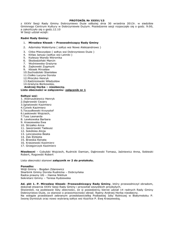 PROTOKÓŁ Nr XXXV/13 z XXXV Sesji Rady Gminy Dobrzyniewo Duże odbytej dnia 30 września 2013r. w siedzibie Gminnego Centrum Kultury w Dobrzyniewie Dużym. Posiedzenie sesji rozpoczęło się o godz. 9.00, a zakończyło się o godz.12.10 W Sesji udział wzięli: Radni Rady Gminy: 1. Mirosław Kłosek – Przewodniczący Rady Gminy 2. Adamska Walentyna ( sołtys wsi Nowe Aleksandrowo ) 3. Citko Mieczysław ( sołtys wsi Dobrzyniewo Duże ) 4. Kitlas Janusz (sołtys wsi Letniki ) 5. Kulesza Wanda Weronika 6. Skobodziński Marcin 7. Woźniewska Grażyna 8. Zajkowski Zygmunt 9. Kłosek Mirosław 10.Suchodolski Stanisław 11.Ciołko Lucyna Dorota 12.Mroczko Henryk 13.Radziszewski Władysław 14.Grażyna Borkowska, Andrzej Horba – nieobecny. Lista obecności w załączeniu- załącznik nr 1 Sołtysi wsi: 1. Andruszkiewicz Henryk 2.Dąbrowski Cezary 3.Ignatowski Kazimierz 4.Cylwik Kazimierz 5.Toczydłowski Krzysztof 6.Laskowski Wojciech, 7.Tusz Leonarda 8. Lewkowska Barbara 9. Kraszewska Ewa 10. Strzałko Anna 11. Jaworowski Tadeusz 12. Sokólska Alicja 13. Lenczewska Beata 14. Żak Elżbieta 15. Brzeska Renata 16. Kraszewski Kazimierz 17. Grzegorczyk Kazimierz Nieobecni – Cybulski Wojciech, Rudnicki Damian, Dąbrowski Tomasz, Jaśniewicz Anna, Sobieski Robert, Rogowski Robert Lista obecności stanowi załącznik nr 2 do protokołu. Ponadto: Wójt Gminy - Bogdan Zdanowicz Skarbnik Gminy Dorota Rudnicka – Dobrzyńska Radca prawny UG – Hanna Nikitiuk Sekretarz Gminy – Teresa Rydzewska Ad. pkt 1. P. Mirosław Kłosek- Przewodniczący Rady Gminy, który przewodniczył obradom, dokonał otwarcia XXXV Sesji Rady Gminy i przywitał wszystkich przybyłych. Stwierdził, na podstawie listy obecności, że w posiedzeniu bierze udział 14 radnych Rady Gminy Dobrzyniewo Duże, co stanowi o prawomocności obrad. Radny Andrzej Horba nieobecny. Na wstępie przedstawił zebranym przedstawicielkę Podlaskiej Izby Rolniczej w Białymstoku P. Iwonę Dymisiuk oraz nowo wybraną sołtys wsi Kozińce P. Ewę Kraszewską. Za przyzwoleniem radnych gminy udzielił głosu P. Iwonie Dymisiuk, która wypowiedziała się na temat szkoleń prowadzonych przez Podlaską Izbę Rolniczą skierowanych do osób ubezpieczonych w KRUS Białystok oraz na temat nowej ustawy o ochronie zwierząt. Następnie Przewodniczący Rady Gminy odczytał proponowany porządek obrad sesji: 1. Otwarcie obrad XXXV Sesji Rady Gminy. 2. Przyjęcie porządku posiedzenia. 3. Przyjęcie protokołu z XXXIV Sesji Rady Gminy Dobrzyniewo Duże odbytej dnia 30 sierpnia 2013 r. 4.Sprawozdanie Wójta Gminy z działalności w okresie między sesjami. 5. Rozpatrzenie i podjęcie uchwał w sprawach: a) zmian w budżecie gminy na 2013 r. b) zmian w Wieloletniej Prognozie Finansowej Gminy Dobrzyniewo Duże na lata 2013- 2024. 6. Sprawozdanie Komisji Rewizyjnej z kontroli przeprowadzonych w dniach 19, 20 września 2013 r. 7. Interpelacje i wnioski Radnych kierowane do Wójta Gminy. 8. Odpowiedzi na interpelacje i wnioski Radnych. 9. Wolne wnioski, zapytania i informacje. 10. Zamknięcie obrad sesji. Przewodniczący obrad zapytał, czy są propozycje zmian porządku obrad. Uwag ani propozycji zmian nie zgłoszono. Ad. pkt 3. Przyjęcie protokołu z XXXIV Sesji Rady Gminy Dobrzyniewo Duże odbytej dnia 30 sierpnia 2013r. Przewodniczący obrad zapytał, czy radni mają pytania odnośnie protokołu z poprzedniej sesji Rady Gminy. Nie zgłoszono, żadnych pytań ani uwag. Przewodniczący Rady Gminy poprosił o przegłosowanie przyjęcia protokołu z XXXIV Sesji Rady Gminy Dobrzyniewo Duże odbytej dnia 30 sierpnia 2013r Na 15 radnych obecnych na sesji Rady Gminy w głosowaniu wzięło udział 14 radnych. Głosowanie przebiegało następująco: Głosy „za” -14 Głosy „przeciw” – 0 Głosy „wstrzymujące się” – 0 Tryb głosowania- głosowanie jawne zwykłą większością głosów w obecności, co najmniej połowy ustawowego składu rady. Protokół z obrad XXXIV Sesji Rady Gminy z dnia 30 sierpnia 2013 został przyjęty. Ad. pkt 4. Sprawozdanie Wójta Gminy z działalności w okresie między sesjami. Sprawozdanie stanowi załącznik Nr 3 do niniejszego protokołu. Ad. pkt 5. Rozpatrzenie i podjęcie uchwał w sprawach: a) zmian w budżecie gminy na 2013 r. Przewodniczący Rady Gminy oddał głos Skarbnikowi Gminy. Skarbnik Gminy przedstawiła zmiany w oparciu o załącznik Nr 6 – Objaśnienia dokonanych zmian w planie budżetu gminy na 2013 r. Dodała, że najprawdopodobniej w 2014 r. nastąpi emisja obligacji gminnych. Zostaną one spożytkowane na realizację zadań inwestycyjnych ujętych w planie inwestycyjnym na 2014 r. W październiku br. rozpoczną się prace związane z przygotowaniem projektu budżetu na 2014 r. Poprosiła radnych o zgłaszanie swoich propozycji. Przewodniczący Rady Gminy poprosił przewodniczącego Komisji Finansów i Budżetu o przedstawienie opinii o projekcie uchwały. Radny Marcin Skobodziński poinformował, że członkowie komisji wydali pozytywną opinię o projekcie uchwały w sprawie zmian w budżecie gminy na 2013 r. Opinia stanowi załącznik Nr 4 do niniejszego protokołu. Radny Henryk Mroczko poprosił Wójta Gminy o uzasadnienie zakupu zadymiarki na potrzeby referatu gospodarki komunalnej Urzędu Gminy. Jego zdaniem zakup jest zbędny. Wszelkie środki finansowe należy kierować na udoskonalanie przepompowni ścieków m.in. montaż osadników. Nielegalne podłączenia kanalizacyjne można lokalizować poprzez kontrolę w terenie. Zgodnie z ustawą o ochronie środowiska Wójt Gminy może wydać upoważnienie do wejścia na posesję. Wójt Gminy stwierdził, że nikt nie ma prawa wejścia na posesję bez zgody właściciela. Efektywność stosowania zadymiarki została sprawdzona w wielu jednostkach – opinia pozytywna. Dodał, że często awarie spowodowane są nieumiejętnym korzystaniem mieszkańców z sieci kanalizacyjnej Radny Henryk Mroczko powiedział, że jak najszybciej należy stworzyć na t