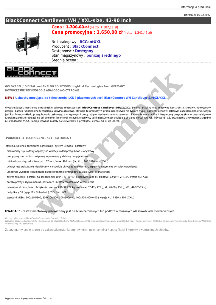 Informacje o produkcie Utworzono 08-03-2017 BlackConnect Cantilever WH / XXL-size, 42-90 inch Cena : 1.700,00 zł (netto: 1.382,11 zł) Cena promocyjna : 1.650,00 zł (netto: 1.341,46 zł) Nr katalogowy : BCCantXXL Producent : BlackConnect Dostępność : Dostępny Stan magazynowy : poniżej średniego Średnia ocena : er m ar k GOLDKABEL / DIGITAL and ANALOG SOLUTIONS, HighEnd Technologies from GERMANY. NOWOCZESNE TECHNOLOGIE ANALOGOWO-CYFROWE. NEW ! Uchwyty mocujące do telewizorów LCD i plazmowych serii BlackConnect WH Cantilever S/M/XL/XXL. Wysokiej jakości naścienne ultra-płaskie uchwyty mocujące serii BlackConnect Cantilever S/M/XL/XXL. Solidna, stabilna oraz masywna konstrukcja, ciekawy, nowoczesny design i bardzo funkcjonalna technologia uchylno-obrotowa, stawiają te produkty w gronie najlepszych nie tylko w swojej kategorii cenowej. Istotnym aspektem konstrukcyjnym jest kombinacja układu przegubowo-łożyskowego z masywnym i precyzyjnym mechanizmem nożycowym. Zapewnia ona stabilną i bezpieczną pozycję ekranu przy relatywnie szerokim zakresie regulacji na osi poziomej i pionowej. Wszystkie uchwyty serii BlackConnect posiadają oficjalne certyfikaty GS, TÜV Nord i CE, oraz spełniają wymagania zgodne ze standardem VESA. Zaprojektowane zostały do telewizorów o przekątnej ekranu od 19 do 90 cali. PARAMETRY TECHNICZNE, KEY FEATURES : stabilna, solidna i bezpieczna konstrukcja, system uchylno - obrotowy niezawodny 3-punktowy odporny na wibracje układ przegubowo - łożyskowy precyzyjny mechanizm nożycowy zapewniający stabilną pozycję ekranu minimalny odstęp od sciany tylko 37 mm / max. 490 mm ( M, XL ), 165 / 810 mm ( XXL ) uchwyt jest praktycznie niewidoczny, całkowicie ukryty za telewizorem, zapewnia optymalną cyrkulację powietrza umożliwia wygodne i bezpieczne przeprowadzenie przewodów zasilających i sygnałowych at zakres regulacji ( obrotu ) na osi poziomej 180° ( +/- 90° LR ), nachylenia na osi pionowej 12/19° (-2/+17°, wersje XL i XXL) bardzo prosty i szybki montaż, poziomica i zestaw montażowy* w komplecie przekątne ekranu /max. obciążenie : wersja S 19-37 / 22 kg, wersja M, 32-47 / 27 kg, XL, 40-60 / 45 kg, XXL, 42-90°/75 kg certyfikaty GS ( geprüfte Sicherheit ), TÜV Nord i CE w standard VESA : 100x100/200, 200x200/400, 300x300/400, 400x400, 600x400 ( wersja XL ) i 830 x 500 ( XXL ) UWAGA! * - zestaw montażowy przewidziany jest do ścian betonowych lub podłoża o zbliżonych właściwościach mechanicznych. All copy rights reserved by AC/AudioComponents, Szczecin / Poland. Wszystkie opisy produktów, teksty i tłumaczenia są własnością firmy AC/AudioComponents. Ich publikacja i kopiowianie w całości lub nawet fragmentarycznej części bez naszej autoryzacji i zgody Biura Ochrony Własności Intelektualnej, jest zabronione. Zastrzegamy sobie prawo do zakwestionowania poprawności pow. cennika / specyfikacji i korekty ewentualnych błędów. Wygenerowano w programie www.oscGold.com