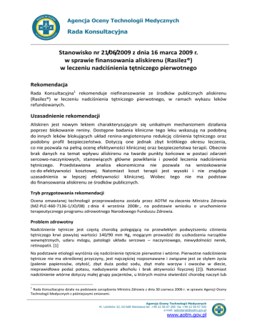 Agencja Oceny Technologii Medycznych Rada Konsultacyjna Stanowisko nr 21/06/2009 z dnia 16 marca 2009 r. w sprawie finansowania aliskirenu (Rasilez®) w leczeniu nadciśnienia tętniczego pierwotnego Rekomendacja Rada Konsultacyjna1 rekomenduje niefinansowanie ze środków publicznych aliskirenu (Rasilez®) w leczeniu nadciśnienia tętniczego pierwotnego, w ramach wykazu leków refundowanych. Uzasadnienie rekomendacji Aliskiren jest nowym lekiem charakteryzującym się unikalnym mechanizmem działania poprzez blokowanie reniny. Dostępne badania kliniczne tego leku wskazują na podobną do innych leków blokujących układ renina-angiotensyna redukcję ciśnienia tętniczego oraz podobny profil bezpieczeństwa. Dotyczą one jednak zbyt krótkiego okresu leczenia, co nie pozwala na pełną ocenę efektywności klinicznej oraz bezpieczeństwa terapii. Obecnie brak danych na temat wpływu aliskirenu na twarde punkty końcowe w postaci zdarzeń sercowo-naczyniowych, stanowiących główne powikłania i powód leczenia nadciśnienia tętniczego. Przedstawiona analiza ekonomiczna nie pozwala na wnioskowanie co do efektywności kosztowej. Natomiast koszt terapii jest wysoki i nie znajduje uzasadnienia w lepszej efektywności klinicznej. Wobec tego nie ma podstaw do finansowania aliskirenu ze środków publicznych. Tryb przygotowania rekomendacji Ocena omawianej technologii przeprowadzona została przez AOTM na zlecenie Ministra Zdrowia (MZ-PLE-460-7136-1/JO/08) z dnia 4 września 2008r., na podstawie wniosku o uruchomienie terapeutycznego programu zdrowotnego Narodowego Funduszu Zdrowia. Problem zdrowotny Nadciśnienie tętnicze jest częstą chorobą polegającą na przewlekłym podwyższeniu ciśnienia tętniczego krwi powyżej wartości 140/90 mm Hg, mogącym prowadzić do uszkodzenia narządów wewnętrznych, udaru mózgu, patologii układu sercowo – naczyniowego, niewydolności nerek, retinopatii. [1] Na podstawie etiologii wyróżnia się nadciśnienie tętnicze pierwotne i wtórne. Pierwotne nadciśnienie tętnicze nie ma określonej przyczyny, jest najczęściej rozpoznawane i związane jest ze stylem życia (palenie papierosów, otyłość, zbyt duża podaż sodu, zbyt mało warzyw i owoców w diecie, nieprawidłowa podaż potasu, nadużywanie alkoholu i brak aktywności fizycznej [2]). Natomiast nadciśnienie wtórne dotyczy małej grupy pacjentów, u których można stwierdzić chorobę naczyń lub 1 Rada Konsultacyjna działa na podstawie zarządzenia Ministra Zdrowia z dnia 30 czerwca 2006 r. w sprawie Agencji Oceny Technologii Medycznych z późniejszymi zmianami. Agencja Oceny Technologii Medycznych Al. Lotników 22, 02-668 Warszawa tel. +48 22 56 67 200 fax +48 22 56 67 202 e-mail: [email protected] www.aotm.gov.pl Stanowisko Rady Konsultacyjnej AOTM nr 21/06/2009 z dnia 16 marca 2009 r. miąższu nerki, guz produkujący katecholaminy, choroby nadnerczy, zespół bezdechu sennego, zwężenie aorty lub inną przyczynę. [1] Szacuje się, że na świecie nadciśnienie tętnicze dotyka około 1 miliarda osób, zaś w Polsce około 8 milionów. Jest ono wymieniane wśród najczęstszych przyczyn zgonów. Obecna standardowa terapia Leczenie nadciśnienia tętniczego obejmuje zarówno zamianę stylu życia pacjenta jak i farmakoterapię. Ze względu na złożoność, uciążliwość oraz pośredni charakter powodowanych podwyższonym ciśnieniem krwi powikłań, terapia często bywa niedostateczna lub jest przerywana. Ocenia się, że w warunkach polskich tylko około 12% pacjentów jest leczonych skutecznie. [2] Po rozpoznaniu nadciśnienia poszukuje się jego przyczyn i jeżeli uda się je znaleźć prowadzi się leczenie przyczynowe. Jednak w ogromnej większości przypadków przyczyna nadciśnienia pozostaje nieznana. W takiej sytuacji standardowa farmakoterapia polega na stosowaniu leków należących do kilku grup, podawanych pojedynczo lub w skojarzeniu, włączanych w zależności od obrazu klinicznego i towarzyszących schorzeń. Należą do nich leki wpływające na oś renina-angiotensynaaldosteron (inhibitory enzymu konwertującego angiotensynę – ACEi, antagoniści receptorów angiotensynowych – ARB - sartany), antagoniści kanałów wapniowych, leki moczopędne, antagoniści receptorów β adrenergicznych („β-blokery”), antagoniści receptorów α1 adrenergicznych oraz inne leki stosowane w przypadku przeciwwskazań do zastosowania wymienionych leków lub niezadowalającej kontroli ciśnienia tętniczego. [1] Proponowana terapia Aliskiren jest czynnym po podaniu doustnym, niepeptydowym, silnym i wybiórczo działającym bezpośrednim inhibitorem ludzkiej reniny. Hamując aktywność reniny, aliskiren hamuje układ reninaangiotensyna w punkcie aktywacji, blokując przekształcenie angiotensynogenu w angiotensynę I oraz zmniejszając stężenie angiotensyny I i angiotensyny II. Podczas gdy inne środki hamujące układ renina-angiotensyna (ACEi, ARB) powodują kompensacyjne zwiększenie aktywności reninowej osocza, leczenie aliskirenem zmniejsza aktywność reninową osocza u pacjentów z nadciśnieniem tętniczym o około 50 do 80%. Podobne zmniejszenie obserwowano po podaniu aliskirenu w skojarzeniu z innymi środkami przeciwnadciśnieniowymi. Zwiększona aktywność reninowa osocza jest związana ze zwiększonym ryzykiem incydentów sercowo-naczyniowych u pacjentów z nadciśnieniem tętniczym oraz u osób z prawidłowym ciśnieniem tętniczym krwi. W chwili obecnej konsekwencje kliniczne różnic we wpływie na aktywność reninową osocza nie są znane. [3] Zalecana dawka preparatu Rasilez wynosi 150 mg raz na dobę. U pacjentów, u których ciśnienie krwi nie jest odpowiednio kontrolowane, dawkę można zwiększyć do 300 mg raz na dobę. Działanie obniżające ciśnienie występuje zasadniczo w ciągu dwóch tygodni (85-90%) po rozpoczęciu leczenia dawką 150 mg raz na dobę. Rasilez można stosować w monoterapii lub w skojarzeniu z innymi środkam