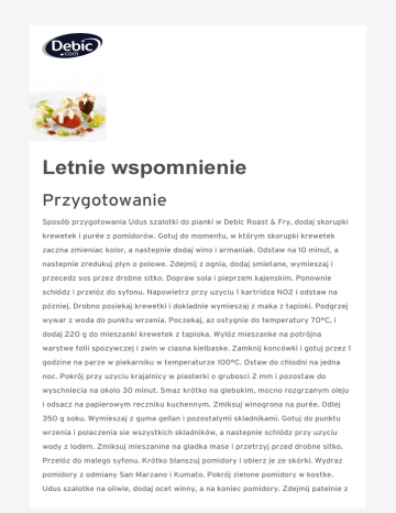 Debic Letnie wspomnienie Przygotowanie Sposób przygotowania Udus szalotki do pianki w Debic Roast & Fry, dodaj skorupki krewetek i purée z pomidorów. Gotuj do momentu, w którym skorupki krewetek zaczna zmieniac kolor, a nastepnie dodaj wino i armaniak. Odstaw na 10 minut, a nastepnie zredukuj plyn o polowe. Zdejmij z ognia, dodaj smietane, wymieszaj i przecedz sos przez drobne sitko. Dopraw sola i pieprzem kajenskim. Ponownie schlódz i przelóz do syfonu. Napowietrz przy uzyciu 1 kartridza NO2 i odstaw na pózniej. Drobno posiekaj krewetki i dokladnie wymieszaj z maka z tapioki. Podgrzej wywar z woda do punktu wrzenia. Poczekaj, az ostygnie do temperatury 70°C, i dodaj 220 g do mieszanki krewetek z tapioka. Wylóz mieszanke na potrójna warstwe folii spozywczej i zwin w ciasna kielbaske. Zamknij koncówki i gotuj przez 1 godzine na parze w piekarniku w temperaturze 100°C. Ostaw do chlodni na jedna noc. Pokrój przy uzyciu krajalnicy w plasterki o grubosci 2 mm i pozostaw do wyschniecia na okolo 30 minut. Smaz krótko na glebokim, mocno rozgrzanym oleju i odsacz na papierowym reczniku kuchennym. Zmiksuj winogrona na purée. Odlej 350 g soku. Wymieszaj z guma gellan i pozostalymi skladnikami. Gotuj do punktu wrzenia i polaczenia sie wszystkich skladników, a nastepnie schlódz przy uzyciu wody z lodem. Zmiksuj mieszanine na gladka mase i przetrzyj przed drobne sitko. Przelóz do malego syfonu. Krótko blanszuj pomidory i obierz je ze skórki. Wydraz pomidory z odmiany San Marzano i Kumato. Pokrój zielone pomidory w kostke. Udus szalotke na oliwie, dodaj ocet winny, a na koniec pomidory. Zdejmij patelnie z ognia, odlóz niewielka ilosc posiekanych pomidorów jako dekoracje talerza. Wymieszaj pozostale pomidory z krewetkami i nadziej wydrazone pomidory salatka z krewetek. Umyj selera i pokrój go na dlugie, waskie paski. Wlóz zblanszowanego selera do wody z lodem, wraz z galazkami dzikiej portulaki. Złożenie Wykonczenie Ulóz pomidory na talerzy i udekoruj je ketchupem. Wymieszaj zblanszowane paski selera, portulake i zólte pomidory z oliwa, a nastepnie ulóz je na talerzu. Nalóz pianke na wydrazone pomidory, a na koniec ulóz na talerzu krakersa z krewetek. Pokaż składniki 10 pieces Pianka z szarych krewetek 50 ml Debic Roast & Fry 20 g posiekanej szalotki 200 g skorupek z krewetek 100 ml armaniaku 100 ml białego wina 300 ml Debic Śmietanka 32% 5 g soli 1 g pieprz cayenne Krakersy z szarych krewetek 300 g mąki z tapioki 110 g szarych krewetek 150 ml wywaru z krewetek 110 ml wody 14 g soli Ketchup z winogron 500 g czerwonych winogron 100 ml 30 g cukru 25 ml sosu shiro shoyu 3 g soli 6 g gumy gellan octu winnego ze szczepu Cabernet Sauvignon Sa?atka z krewetek i pomidorów 500 g szarych krewetek 500 g pomidorów San Marzano 300 g pomidorów Kumato 500 g zielonych pomidorów 300 g żółtych pomidorków wiśniowych 30 g posiekanej szalotki 50 g oleju z oliwek 10 ml octu z sherry 3 g soli Przybranie 500 g selera naciowego 200 g portulaki Debic to marka Friesland Campina Foodservice - Copyright 2017 Debic