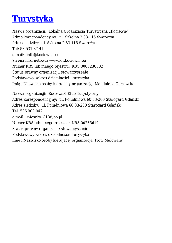 Turystyka Nazwa organizacji: Lokalna Organizacja Turystyczna „Kociewie” Adres korespondencyjny: ul. Szkolna 2 83-115 Swarożyn Adres siedziby: ul. Szkolna 2 83-115 Swarożyn Tel: 58 531 37 41 e-mail: [email protected] Strona internetowa: www.lot.kociewie.eu Numer KRS lub innego rejestru: KRS 0000230802 Status prawny organizacji: stowarzyszenie Podstawowy zakres działalności: turystyka Imię i Nazwisko osoby kierującej organizacją: Magdalena Olszewska Nazwa organizacji: Kociewski Klub Turystyczny Adres korespondencyjny: ul. Południowa 60 83-200 Starogard Gdański Adres siedziby: ul. Południowa 60 83-200 Starogard Gdański Tel: 506 908 042 e-mail: [email protected] Numer KRS lub innego rejestru: KRS 00235610 Status prawny organizacji: stowarzyszenie Podstawowy zakres działalności: turystyka Imię i Nazwisko osoby kierującej organizacją: Piotr Malowany