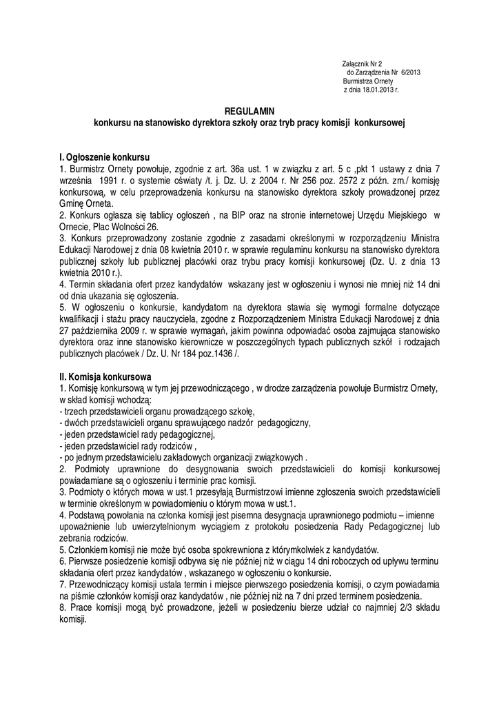 Załącznik Nr 2 do Zarządzenia Nr 6/2013 Burmistrza Ornety z dnia 18.01.2013 r. REGULAMIN konkursu na stanowisko dyrektora szkoły oraz tryb pracy komisji konkursowej I. Ogłoszenie konkursu 1. Burmistrz Ornety powołuje, zgodnie z art. 36a ust. 1 w związku z art. 5 c ,pkt 1 ustawy z dnia 7 września 1991 r. o systemie oświaty /t. j. Dz. U. z 2004 r. Nr 256 poz. 2572 z późn. zm./ komisję konkursową, w celu przeprowadzenia konkursu na stanowisko dyrektora szkoły prowadzonej przez Gminę Orneta. 2. Konkurs ogłasza się tablicy ogłoszeń , na BIP oraz na stronie internetowej Urzędu Miejskiego w Ornecie, Plac Wolności 26. 3. Konkurs przeprowadzony zostanie zgodnie z zasadami określonymi w rozporządzeniu Ministra Edukacji Narodowej z dnia 08 kwietnia 2010 r. w sprawie regulaminu konkursu na stanowisko dyrektora publicznej szkoły lub publicznej placówki oraz trybu pracy komisji konkursowej (Dz. U. z dnia 13 kwietnia 2010 r.). 4. Termin składania ofert przez kandydatów wskazany jest w ogłoszeniu i wynosi nie mniej niż 14 dni od dnia ukazania się ogłoszenia. 5. W ogłoszeniu o konkursie, kandydatom na dyrektora stawia się wymogi formalne dotyczące kwalifikacji i stażu pracy nauczyciela, zgodne z Rozporządzeniem Ministra Edukacji Narodowej z dnia 27 października 2009 r. w sprawie wymagań, jakim powinna odpowiadać osoba zajmująca stanowisko dyrektora oraz inne stanowisko kierownicze w poszczególnych typach publicznych szkół i rodzajach publicznych placówek / Dz. U. Nr 184 poz.1436 /. II. Komisja konkursowa 1. Komisję konkursową w tym jej przewodniczącego , w drodze zarządzenia powołuje Burmistrz Ornety, w skład komisji wchodzą: - trzech przedstawicieli organu prowadzącego szkołę, - dwóch przedstawicieli organu sprawującego nadzór pedagogiczny, - jeden przedstawiciel rady pedagogicznej, - jeden przedstawiciel rady rodziców , - po jednym przedstawicielu zakładowych organizacji związkowych . 2. Podmioty uprawnione do desygnowania swoich przedstawicieli do komisji konkursowej powiadamiane są o ogłoszeniu i terminie prac komisji. 3. Podmioty o których mowa w ust.1 przesyłają Burmistrzowi imienne zgłoszenia swoich przedstawicieli w terminie określonym w powiadomieniu o którym mowa w ust.1. 4. Podstawą powołania na członka komisji jest pisemna desygnacja uprawnionego podmiotu – imienne upoważnienie lub uwierzytelnionym wyciągiem z protokołu posiedzenia Rady Pedagogicznej lub zebrania rodziców. 5. Członkiem komisji nie może być osoba spokrewniona z którymkolwiek z kandydatów. 6. Pierwsze posiedzenie komisji odbywa się nie później niż w ciągu 14 dni roboczych od upływu terminu składania ofert przez kandydatów , wskazanego w ogłoszeniu o konkursie. 7. Przewodniczący komisji ustala termin i miejsce pierwszego posiedzenia komisji, o czym powiadamia na piśmie członków komisji oraz kandydatów , nie później niż na 7 dni przed terminem posiedzenia. 8. Prace komisji mogą być prowadzone, jeżeli w posiedzeniu bierze udział co najmniej 2/3 składu komisji. 9. Pracami komisji kieruje jej przewodniczący, który w szczególności – uzupełnia lub dokonuje zmiany komisji w przypadku, gdy podmioty o których mowa w ust .1 nie prześlą imiennych zgłoszeń swoich przedstawicieli w terminie określonym ust.3 lub dokonują ich zmiany i na posiedzenie komisji zgłaszają się osoby nie ujęte w zarządzeniu określającym skład komisji a posiadające pisemne upoważnienie, o którym mowa w ust.4 . 10. W kwestiach spornych występujących między członkami komisji przewodniczący zarządza jawne głosowanie, w którym, w przypadku równego podziału głosów rozstrzygający jest jego głos . 11. Konkurs odbywa się w dwóch etapach przeprowadzonych w jednym dniu. III. Tryb pracy komisji konkursowej A. ETAP PIERWSZY 1. Pierwszy etap przebiega bez udziału kandydatów . Członkowie komisji zapoznają się z dokumentami złożonymi przez kandydatów , orzekają czy kandydaci spełniają kryteria określone w przepisach ustawowych i ogłoszeniu o konkursie, sprawdzają warunki formalne i merytoryczne złożonych ofert . Komisja, na podstawie złożonej oferty, podejmuje uchwałę o dopuszczeniu lub odmowie dopuszczenia kandydata do postępowania konkursowego. Uchwała zapada zwykłą większością głosów w głosowaniu jawnym. W przypadku równej liczby głosów głos decydujący należy do przewodniczącego komisji. 2. Komisja podejmuje uchwałę o odmowie dopuszczenia kandydata do postępowania konkursowego, jeżeli: 1) oferta została złożona po terminie; 2) oferta nie zawiera wszystkich dokumentów wskazanych w ogłoszeniu konkursu, 3) z oferty wynika, że kandydat nie spełnia wymagań wskazanych w ogłoszeniu konkursu, 3.Po zakończeniu prac przewodniczący komisji informuje ustnie kandydatów o dopuszczeniu albo odmowie dopuszczenia do postępowania konkursowego. 4. Kandydat, któremu odmówiono dopuszczenia do postępowania konkursowego, może, w terminie 3 dni od otrzymania ustnej informacji o odmowie dopuszczenia do postępowania konkursowego, wystąpić z pisemnym wnioskiem o podanie przyczyn odmowy. Przewodniczący komisji informuje kandydata na piśmie o przyczynach odmowy dopuszczenia do postępowania konkursowego w terminie 7 dni od dnia złożenia wniosku. B. ETAP DRUGI 1. Drugi etap to rozmowa z kandydatem na temat perspektyw funkcjonowania szkoły , własnej koncepcji funkcjonowania i rozwoju publicznej szkoły . Komisja przeprowadza rozmowy z kandydatami oddzielnie. Członkowie komisji mogą zadawać kandydatom pytania. Celem rozmów kwalifikacyjnych jest ocena merytoryczna kandydatów , ocena predyspozycji i umiejętności kandydatów gwarantujących prawidłowe prowadzenie szkoły. 2. Komisja wyłania kandydata na stanowisko dyrektora w głosowaniu tajnym. Każdy z członków komisji dysponuje jednym głosem. 3. Konkurs wyłania kandydata na dyrektora, jeżeli jeden z uczestników otrzyma bezwzględną więk