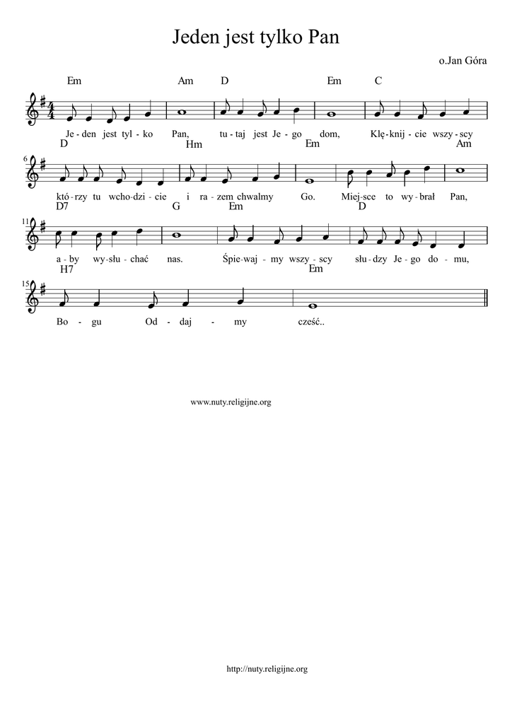 Jeden jest tylko Pan o.Jan Góra Em Am Em C 4 Je den jest tyl ko Pan, D 6 D tu taj jest Je któ rzy tu wcho dzi cie D7 i ra zem chwalmy G go dom, Klę knij cie wszy scy Em Hm Go. Em Am Miej sce to wy brał Pan, D 11 a by wy słu chać nas. Śpie waj my wszy scy Em H7 15 Bo gu Od daj my cześć.. www.nuty.religijne.org http://nuty.religijne.org słu dzy Je go do mu,