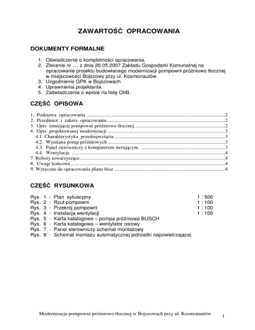 ZAWARTOŚĆ OPRACOWANIA DOKUMENTY FORMALNE 1. Oświadczenie o kompletności opracowania. 2. Zlecenie nr .... z dnia 20.05.2007 Zakładu Gospodarki Komunalnej na opracowanie projektu budowlanego modernizacji pompowni próżniowo tłocznej w miejscowości Bojszowy przy ul. Kosmonautów. 3. Uzgodnienie GPK w Bojszowach 4. Uprawnienia projektanta. 5. Zaświadczenie o wpisie na listę OIIB. CZĘŚĆ OPISOWA 1. 2. 3. 4. Podstawa opracowania ............................................................................................................2 Przedmiot i zakres opracowania............................................................................................2 Opis istniejącej pompowni próżniowo tłocznej. .....................................................................2 Opis projektowanej modernizacji ...........................................................................................3 4.1. Charakterystyka przedsięwzięcia .....................................................................................3 4.2. Wymiana pomp próżniowych ...........................................................................................3 4.3. Panel sterowniczy z komputerem sterującym. .................................................................3 4.4. Wentylacja. .......................................................................................................................4 7. Roboty towarzyszące.................................................................................................................4 8. Uwagi końcowe........................................................................................................................4 9. Wytyczne do opracowania planu bioz ......................................................................................4 CZĘŚĆ RYSUNKOWA Rys. Rys. Rys. Rys. Rys. Rys. Rys. Rys. 1 2 3 4 5 6 7 8 - Plan sytuacyjny Rzut pompowni Przekrój pompowni Instalacja wentylacji Karta katalogowa – pompa próżniowa BUSCH Karta katalogowa – wentylator osiowy Panel sterowniczy schemat montażowy Schemat montażu automatycznej jednostki napowietrzającej 1 : 500 1 : 100 1 : 100 1 : 100 Modernizacja pompowni próżniowo tłocznej w Bojszowach przy ul. Kosmonautów 1 OPIS TECHNICZNY do projektu budowlano wykonawczego modernizacji pompowni próżniowo tłocznej w Bojszowach przy ul. Kosmonautów 1. Podstawa opracowania . - warunki techniczne do wykonania projektu modernizacji pompowni próżniowo tłocznej wyd. przez GPK Bojszowy 7041-2P/21/2007. z dnia 02.03.2007 r. - aktualna mapa do celów projektowych, - inwentaryzacja budynku i urządzeń - obowiązujące normy i normatywy techniczne. 2. Przedmiot i zakres opracowania Przedmiotem opracowania jest projekt budowlano wykonawczy modernizacji pompowni próżniowo tłocznej obsługującej sieć kanalizacji podciśnieniowej w miejscowości Bojszowy. Pompownia zlokalizowana jest w Bojszowach przy ul. Kosmonautów. W zakres modernizacji objętej niniejszym projektem budowlanym wchodzą: 1. Wymiana pomp próżniowych: 2. Modernizacja panelu sterowania 3. Modernizacja instalacji wentylacji 2 szt. 1 kpl. 3. Opis istniejącej pompowni próżniowo tłocznej. Pompownia próżniowo tłoczna stanowi budynek parterowy o wymiarach 3,0 x 4,0 m. Pompownia zlokalizowana jest przy skrzyżowaniu ulic Kosmonautów i Gaikowej na działce nr 324. Pompownia obsługuje sieć kanalizacji podciśnieniowej w Bojszowach. Wytwarzane podciśnienie w zakresie 300-400 kPa jest niewystarczające do transportu ścieków ze wszystkich studzienek podciśnieniowych na terenie przynależnym tej przepompowni. Pompownia wyposażona jest w: − pompy próżniowe Robuschi 400 z silnikami 7,5 kW. Są to pompy z pierścieniem wodnym. Do pracy potrzebują wody o niskiej twardości oraz temperaturze nie wyższej niż 20ºC. − Zbiornik podciśnieniowy o objętości 12 m3, stalowy, zabezpieczony przed korozją chemoutwardzalnymi powłokami epoksydowymi. Zbiornik umieszczony jest na terenie pompowni pod powierzchnią terenu, poza budynkiem. Nad powierzchnię ziemi wystaje jedynie właz rewizyjny-otoczony jest pierścieniem betonowym i przykryty pokrywą drewnianą. Do zbiornika przyłączone są kolektory sieci kanalizacji podciśnieniowej. − Pompy tłoczne firmy Flygt typu CP HT 3127. Są to pompy zatapialne, o wolnym przelocie 76 mm, przeznaczone do transportu ścieków. Modernizacja pompowni próżniowo tłocznej w Bojszowach przy ul. Kosmonautów 2 − Panel z komputerem sterującym znajduje się w budynku pompowni. W panelu znajdują się zabezpieczenia elektryczne oraz sterowanie dla wszystkich urządzeń technologicznych. Komputer oparty jest o sterownik firmy SAIA. Stany pracy oraz awarii poszczególnych urządzeń sygnalizowane są lampkami sygnalizacyjnymi na zewnętrznej obudowie panelu. 4. Opis projektowanej modernizacji 4.1. Charakterystyka przedsięwzięcia Wizja lokalna wraz z pracownikami GKP pozwoliła ustalić niedomagania i niedogodności eksploatacyjne istniejącego układu: pompownia próżniowo tłoczna – sieć podciśnieniowa. Wydane warunki odzwierciedlają sugestie oraz zalecenia co do zakresu i sposobu przeprowadzenia modernizacji pompowni próżniowo tłocznej. Projektowana modernizacja ma na celu: − zwiększenie wytwarzanego podciśnienia dla lepszej pracy zaworów podciśnieniowych oraz poprawienia hydrauliki sieci podciśnieniowej, − zwiększenie wydajności pompowni dla zapewnienia możliwości realizacji nowych podłączeń do sieci, − wyeliminowanie wody jako medium technologii wytwarzania podciśnienia − wprowadzenia lepszej kontroli nad urządzeniami technologicznymi z możliwością monitoringu ich pracy, − poprawienie wentylacji budynku. Projektowana modernizacja obejmuje pompownię próżniowo tłoczną, jednak dla osiągnięcia najlepszego efektu zbierania ścieków należy we wskazanych studzienkach zaworowych zainstalować automatyczne jednostki napowietrzające. 4.2. W