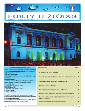 BIULETYN INFORMACYJNY GMINY KRYNICY -ZDROJU Nr 3 (12), Wrzesień 2013r. ISSN: 2083-6163 KOMUNIKAT MPGK Sp. z o.o. MPGK Sp. z o.o. w Krynicydo odbioru z terenu miasta Krynica- ul. Jaworowa, 24.09.2013 (wtorek) ul. Kraszewskiego i wszystkie ulice boczne, 26.09.2013 (czwartek) ul. Czarny Potok, ul. Reymonta, ul. Ludowa, dniu wywozu do godziny 8.00. 444 12 03, 693 323 487 W tym numerze: Strona: 47 FESTIWAL IM. JANA KIEPURY 2 FORUM EKONOMICZNE I FESTIWAL BIEGOWY - PODSUMOWANIE 3 PODPISANIE UMOWY W SPRAWIE AQUAPARKU 3 DOŻYNKI GMINNE W TYLICZU 4 REMONT POMIESZCZEŃ PRZEDSZKOLA W TYLICZU 6 ALEJKI W PARKU SPORTOWO-REKREACYJNYM CZARNY POTOK 6 ZAGOSPODAROWANIE ŹRÓDEŁEK WÓD MINERALNYCH WOKÓŁ OSIEDLA ŹRÓDLANA 7 INFORMAJCE UNIWERSYTETU TRZECIEGO WIEKU 8 2 www.krynica-zdroj.pl /MojaKrynica 47 Festiwal im. Jana Kiepury S ukcesem zakończył się tegoroczny Festiwal im. Jana Kiepury w Krynicy-Zdroju. Czterdziestą siódmą edycję zainaugurowała Gala Verdiowska, poprowadzona 10 sierpnia przez Alicję Węgorzewską – śpiewaczkę operową pełniącą obowiązki dyrektora artystycznego festiwalu. Znanej i lubianej artystce towarzyszył konferansjer Adam Czopek. Na perfekcyjnie zorganizowany występ przybyły tłumy melomanów. W tym roku główną imprezę poprzedziła odbywająca się w dniach od 2 do 9 sierpnia Kiepuriada, promująca młodych i wyróżniających się artystów. Wyjątkowym wydarzeniem było otwarcie Alei Gwiazd. Na krynickim Deptaku uhonorowano w ten sposób m.in. Jana Kiepurę, jego żonę Martę Eggerth, Bogusława Kaczyńskiego i Stefana Półchłopka. W ciągu kolejnych sierpniowych dni Krynica tradycyjnie przemieniła się w stolicę polskiej i zagranicznej muzyki klasycznej. 11 sierpnia wystąpił Bogdan Kierejsza – wybitny wirtuoz i kompozytor muzyki filmowej. Kolejny dzień festiwalu uświetnił występ Orkiestry Filharmonii Podkarpackiej pod dyrekcją Sławomira (fot. Krystian Wrona) Chrzanowskiego z udziałem Edyty Krzemień i Damiana Aleksandra. 13 sierpnia zabrzmiały „Najpiękniejsze Melodie Operetkowe Świata” – koncert w wykonaniu wybitnych artystów polskich i zagranicznych scen muzycznych. Piąty dzień imprezy zapamiętamy z powodu znakomitego Koncertu Galowego z okazji 220-lecia Uzdrowiska. Gwiazdą tego wieczoru była Edyta Piasecka. 15 sierpnia Alicja Węgorzewska i Tomasz Kammel poprowadzili „Bitwę tenorów na róże”, którą głosami publiczności wygrał Tomasz Kuk. To wyjątkowe wydarzenie transmitowała Telewizja Polska (TVP 2). Siódmy dzień festiwalu przyniósł zmianę stylu muzycznego. Publiczność miała okazję podziwiać brawurowy występ Caecilie Norby oraz Leszka Możdżera z zespołem. Festiwal zakończył Galowy Koncert Finałowy Muzyka Świata – Alicja & Friends. Codziennie w samo południe do Domu Festiwalowego na swoje show z gwiazdami zapraszał Jerzy Snakowski. Wstęp na Kiepura? Si! był darmowy, podobnie jak na popołudniowe koncerty, które odbywały się w kościołach. (RED) www.krynica-zdroj.pl 3 /MojaKrynica Forum Ekonomiczne, Festiwal Biegowy – mega promocja Krynicy D la miejscowości wypoczynkowych koniec wakacji oznacza zwykle znaczny spadek liczby odwiedzających. Reguła ta nie dotyczy Krynicy, która w pierwszej dekadzie września zawsze tętni życiem dzięki organizacji Forum Ekonomicznego oraz Festiwalu Biegowego. Fakt, że w tym okresie w uzdrowisku codziennie przebywa po kilka tysięcy gości ma ogromne znaczenie dla całej branży hotelarskiej, restauratorów oraz pozostałych krynickich przedsiębiorców. Korzyści, jakie mieszkańcy gminy czerpią z tych dwóch wydarzeń nie ograniczają się jednak wyłącznie do tygodniowego wzrostu obrotów. Nie chodzi też jedynie o prestiż uzdrowiska. Obecność przedstawicieli niemal wszystkich ogólnopolskich mediów, przekładająca się na setki codziennych relacji we wszystkich środkach masowego przekazu sprawia, że Krynica zyskuje reklamę, jakiej wiele podobnych miejscowości może nam jedynie pozazdrościć. Według ostrożnych wyliczeń burmistrza Dariusza Reśki, jest to promocja warta grubo ponad 10 milionów złotych. W ten sposób oferta Krynicy nie ogranicza się jedynie do kuracjuszy i turystów, ale kieruje się także w stronę biznesmenów, artystów i sportowców z całej Polski i zagranicy. Przekłada się to na wzrost liczby przyjezdnych w ciągu całego roku. Gmina ze swej strony dokłada starań, aby zwiększyć atrakcyjność uzdrowiska oraz sąsiednich miejscowości. Przykładem jest chociażby zakończony niedawno pierwszy etap rewitalizacji krynickiego Deptaku, podjęcie decyzji o przystąpieniu do budowy Aquaparku, czy też budowa nowych szlaków rekreacyjnych i turystycznych, prowadzących z Krynicy, przez Tylicz, na Słowację. (RED) Kolejny krok w stronę krynickiego Aquaparku N a początku lipca burmistrz Dariusz Reśko uczynił kolejny krok na drodze do budowy kompleksu rekreacji wodnej w uzdrowisku. Inwestycja ta wymaga starannego zaplanowania, ponieważ w założeniu jej realizacja przebiegać będzie w ramach partnerstwa publiczno-prywatnego. W tym celu w dniu 1 lipca została podpisana umowa z Kancelarią Doradztwa Gospodarczego Cieślak & Kordasiewicz z Warszawy, obejmująca świadczenie usług doradczych w zakresie opracowania analizy prawno finansowej i modelu projektu pod nazwą „Budowa Aquaparku w Krynicy-Zdroju”. Podpisanie umowy poprzedziły działania Burmistrza mające na celu wybór najlepszej lokalizacji dla tego rodzaju obiektu. Kolejnym krokiem było stworzenie odpowiednich warunków dla realizacji przedsięwzięcia w miejscowym planie zagospodarowania przestrzennego. Ten etap przygotowań został już zakończony z pomyślnym skutkiem. Po rozważeniu wszystkich możliwych opcji zdecydowano, że krynicki Aquapark powstanie na miejscu obecnego boiska piłkarskiego obok stadionu hokejowego. Optymalnym rozwiązaniem, do którego zmierza Burmistrz jest stworzenie takiego modelu partnerstwa, w którym Gmi