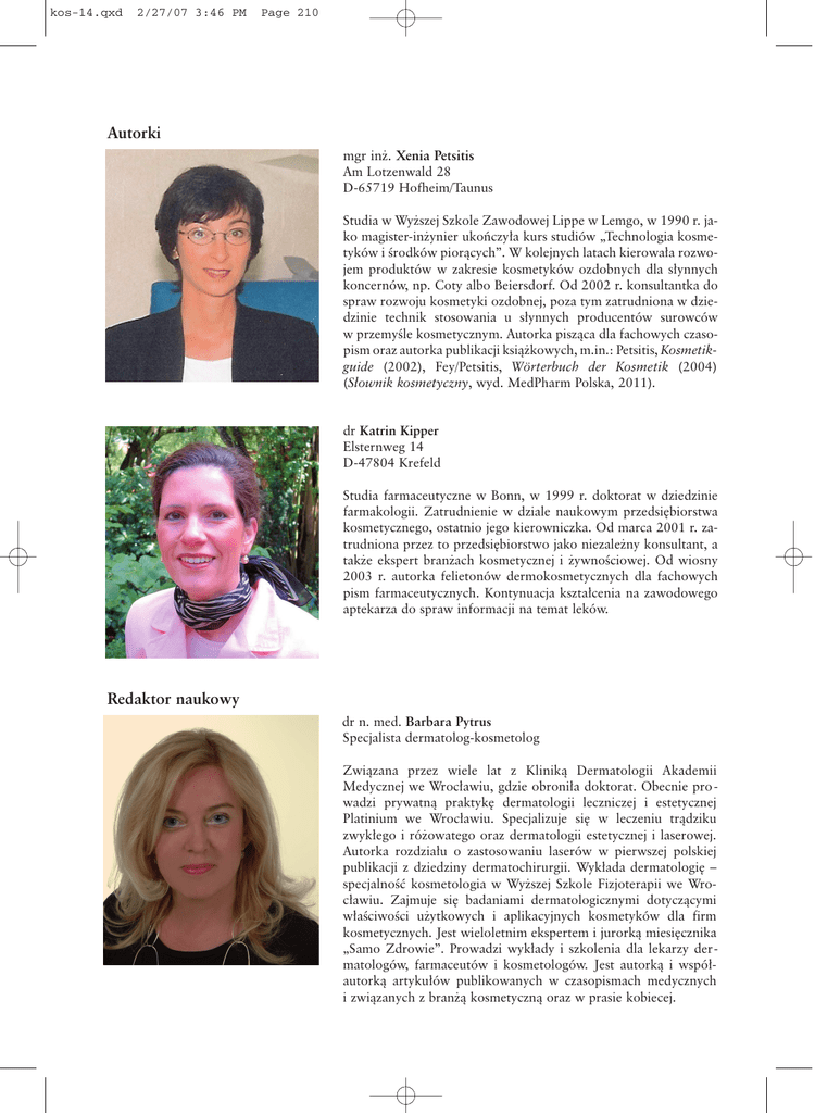 kos-14.qxd 2/27/07 3:46 PM Page 210 Autorki mgr in¿. Xenia Petsitis Am Lotzenwald 28 D-65719 Hofheim/Taunus Studia w Wy¿szej Szkole Zawodowej Lippe w Lemgo, w 1990 r. jako magister-in¿ynier ukoñczy³a kurs studiów „Technologia kosmetyków i œrodków pior¹cych”. W kolejnych latach kierowa³a rozwojem produktów w zakresie kosmetyków ozdobnych dla s³ynnych koncernów, np. Coty albo Beiersdorf. Od 2002 r. konsultantka do spraw rozwoju kosmetyki ozdobnej, poza tym zatrudniona w dziedzinie technik stosowania u s³ynnych producentów surowców w przemyœle kosmetycznym. Autorka pisz¹ca dla fachowych czasopism oraz autorka publikacji ksi¹¿kowych, m.in.: Petsitis, Kosmetikguide (2002), Fey/Petsitis, Wörterbuch der Kosmetik (2004) (S³ownik kosmetyczny, wyd. MedPharm Polska, 2011). dr Katrin Kipper Elsternweg 14 D-47804 Krefeld Studia farmaceutyczne w Bonn, w 1999 r. doktorat w dziedzinie farmakologii. Zatrudnienie w dziale naukowym przedsiêbiorstwa kosmetycznego, ostatnio jego kierowniczka. Od marca 2001 r. zatrudniona przez to przedsiêbiorstwo jako niezale¿ny konsultant, a tak¿e ekspert bran¿ach kosmetycznej i ¿ywnoœciowej. Od wiosny 2003 r. autorka felietonów dermokosmetycznych dla fachowych pism farmaceutycznych. Kontynuacja kszta³cenia na zawodowego aptekarza do spraw informacji na temat leków. Redaktor naukowy dr n. med. Barbara Pytrus Specjalista dermatolog-kosmetolog Zwi¹zana przez wiele lat z Klinik¹ Dermatologii Akademii Medycznej we Wroc³awiu, gdzie obroni³a doktorat. Obecnie pro wadzi prywatn¹ praktykê dermatologii leczniczej i estetycznej Platinium we Wroc³awiu. Specjalizuje siê w leczeniu tr¹dziku zwyk³ego i ró¿owatego oraz dermatologii estetycznej i laserowej. Autorka rozdzia³u o zastosowaniu laserów w pierwszej polskiej publikacji z dziedziny dermatochirurgii. Wyk³ada dermatologiê – specjalnoœæ kosmetologia w Wy¿szej Szkole Fizjoterapii we Wroc³awiu. Zajmuje siê badaniami dermatologicznymi dotycz¹cymi w³aœciwoœci u¿ytkowych i aplikacyjnych kosmetyków dla firm kosmetycznych. Jest wieloletnim ekspertem i jurork¹ miesiêcznika „Samo Zdrowie”. Prowadzi wyk³ady i szkolenia dla lekarzy dermatologów, farmaceutów i kosmetologów. Jest autork¹ i wspó³autork¹ artyku³ów publikowanych w czasopismach medycznych i zwi¹zanych z bran¿¹ kosmetyczn¹ oraz w prasie kobiecej.