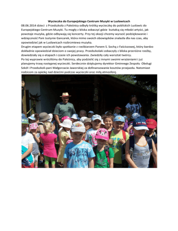 Wycieczka do Europejskiego Centrum Muzyki w Lusławicach 08.06.2014 dzieci z Przedszkola z Paleśnicy odbyły krótką wycieczkę do pobliskich Lusławic do Europejskiego Centrum Muzyki. Tu mogły z bliska zobaczyć gdzie kształcą się młodzi artyści, jak powstaje muzyka, gdzie odbywają się koncerty. Przy tej okazji chcemy wyrazić podziękowanie i wdzięczność Pani Justynie Gancarek, która mimo swoich obowiązków znalazła dla nas czas, aby opowiedzieć jak w Lusławicach rozbrzmiewa muzyka. Drugim etapem wycieczki było spotkanie z rzeźbiarzem Panem S. Sochą z Faściszowej, który bardzo dokładnie opowiedział dzieciom o swojej pracy. Przedszkolaki zobaczyły z bliska przeróżne rzeźby, dowiedziały się o etapach i czasie ich powstawania. Zwiedziły cały warsztat twórcy. Po tej wyprawie wróciliśmy do Paleśnicy, aby podzielić się z innymi swoimi wrażeniami i już planujemy trasę następnej wycieczki. Serdecznie dziękujemy dyrektor Gminnego Zespołu Obsługi Szkół i Przedszkoli-pani Małgorzacie Jaworskiej za dofinansowanie kosztów przejazdu. Natomiast rodzicom za opiekę nad dziećmi podczas wycieczki oraz miłą atmosferę.
