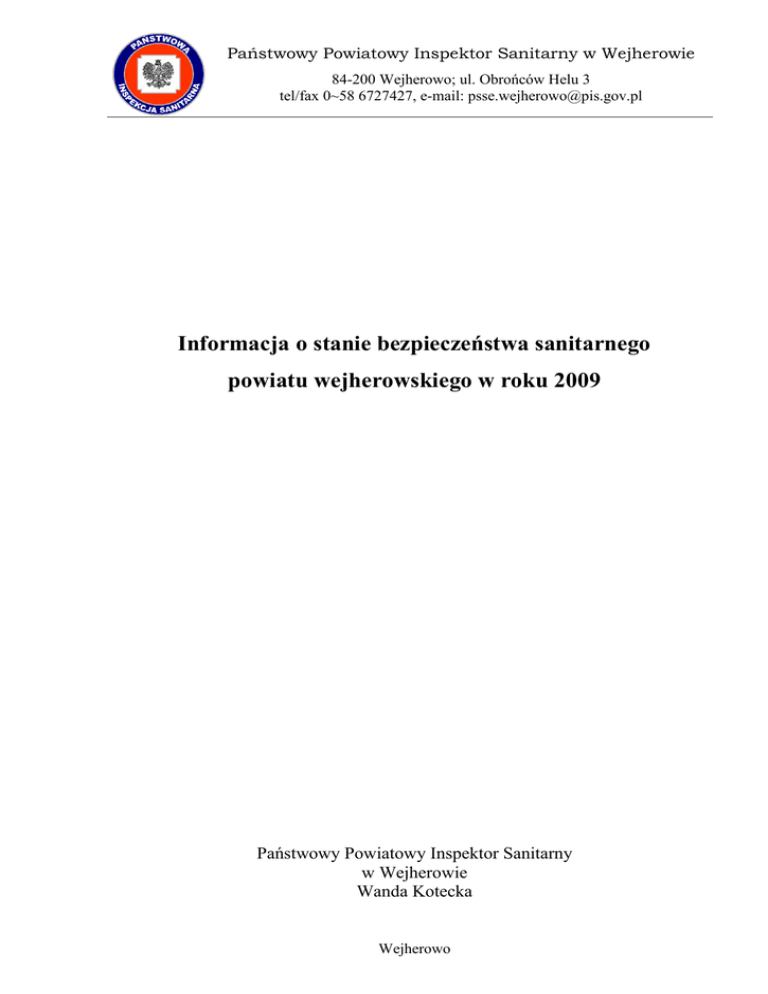 Państwowy Powiatowy Inspektor Sanitarny w Wejherowie 84-200 Wejherowo; ul. Obrońców Helu 3 tel/fax 0~58 6727427, e-mail: [email protected] Informacja o stanie bezpieczeństwa sanitarnego powiatu wejherowskiego w roku 2009 Państwowy Powiatowy Inspektor Sanitarny w Wejherowie Wanda Kotecka Wejherowo Informacja o stanie bezpieczeństwa sanitarnego powiatu wejherowskiego za 2009r Spis treści Spis treści.......................................................................................................................................... 2 Spis tabel .......................................................................................................................................... 2 Spis rysunków .................................................................................................................................. 2 Wstęp ................................................................................................................................................ 3 Ocena zagrożeń sanitarnych na podstawie działalności kontrolnej prowadzonej na terenie powiatu wejherowskiego. ................................................................................................................. 5 Sytuacja epidemiologiczna chorób zakaźnych na terenie powiatu. ............................................. 5 Inwazyjna choroba meningokokowa. ......................................................................................6 Pokąsania .................................................................................................................................7 Antygeny HBS i HCV .............................................................................................................7 Grypa .......................................................................................................................................7 Zakażenia wewnątrzszpitalne. .................................................................................................7 Analiza szczepień ochronnych ................................................................................................7 Ocena stanu sanitarno-technicznego i funkcjonalności placówek służby zdrowia. ................7 Nadzór sanitarny nad obiektami komunalnymi ............................................................................ 8 Ocena zagrożenia wystąpienia Legionelozy po pobycie w hotelach. .....................................8 Zły stan techniczny obiektów PKP ..........................................................................................8 Ocena zagrzybienia obiektów mieszkalnych. ..........................................................................8 Ocena zaszczurzenia. ...............................................................................................................8 Ocena stanu sanitarnego kąpielisk. ..........................................................................................8 Ocena stanu sanitarnego basenów ...........................................................................................9 Ocena stanu sanitarnego wodociągów .....................................................................................9 Ocena zanieczyszczenia powietrza atmosferycznego w Wejherowie. ..................................11 Ocena higienizacji procesu nauczania i stanu sanitarnego placówek oświatowych. ................ 12 Ocena poprawy bezpieczeństwa i jakości zdrowotnej żywności. .............................................. 13 Ocena higienicznych warunków pracy. ...................................................................................... 14 Działalność oświatowa i promocja zdrowia. .............................................................................. 16 Zapobiegawczy nadzór sanitarny. .............................................................................................. 17 Sytuacja kadrowa Stacji.................................................................................................................. 18 Podsumowanie działalności kontrolno-represyjnej PPIS w Wejherowie w roku 2009. ............... 18 Spis tabel Tabela 1 Statystyka epidemiologiczna z wybranych chorób zakaźnych za lata 2008-2009 na terenie powiatu wejherowskiego ...................................................................................................... 5 Tabela 2 Zanieczyszczenie benzo/a/pirenem i substancjami smołowymi w powietrzu atmosferycznym w Wejherowie w latach 2004-2009 .................................................................... 11 Tabela 3 Dopuszczalne stężenia 24h zanieczyszczeń powietrza atmosferycznego ....................... 12 Tabela 4 Najczęściej stwierdzane nieprawidłowości higieniczno sanitarne w latach 2008-2009 . 15 Tabela 5 Zestawienie narażenia pracowników na czynniki szkodliwe w środowisku pracy w latach 2008-2009 ............................................................................................................................ 15 Tabela 5 Analiza chorób zawodowych w latach 2004-2009 .......................................................... 16 Tabela 7 Działalność kontrolno-represyjna PPIS w Wejherowie w 2009r. ................................... 18 Spis rysunków Rysunek 1 Ocena wodociagów pod względem dostarczanej jakości wody .................................... 9 Rysunek 2 Ocena zaopatrzenia ludności w wodę na terenie powiatu wejherowskiego ................ 10 Rysunek 3 Ocena zaopatrzenia w wodę ludności w poszczególnych gminach powiatu wejherowskiego .............................................................................................................................. 11 Rysunek 4 Średnie miesięczne zanieczyszczenie powietrza atmosferycznego w Wejherowie ..... 12 Strona 2 z 18 Informacja o stanie bezpieczeństwa sanitarnego powiatu wejherowskiego za 2009r Wstęp Państwowy Powiatowy Inspektor Sanitarny w Wejherowie, realizując zadania z zakr