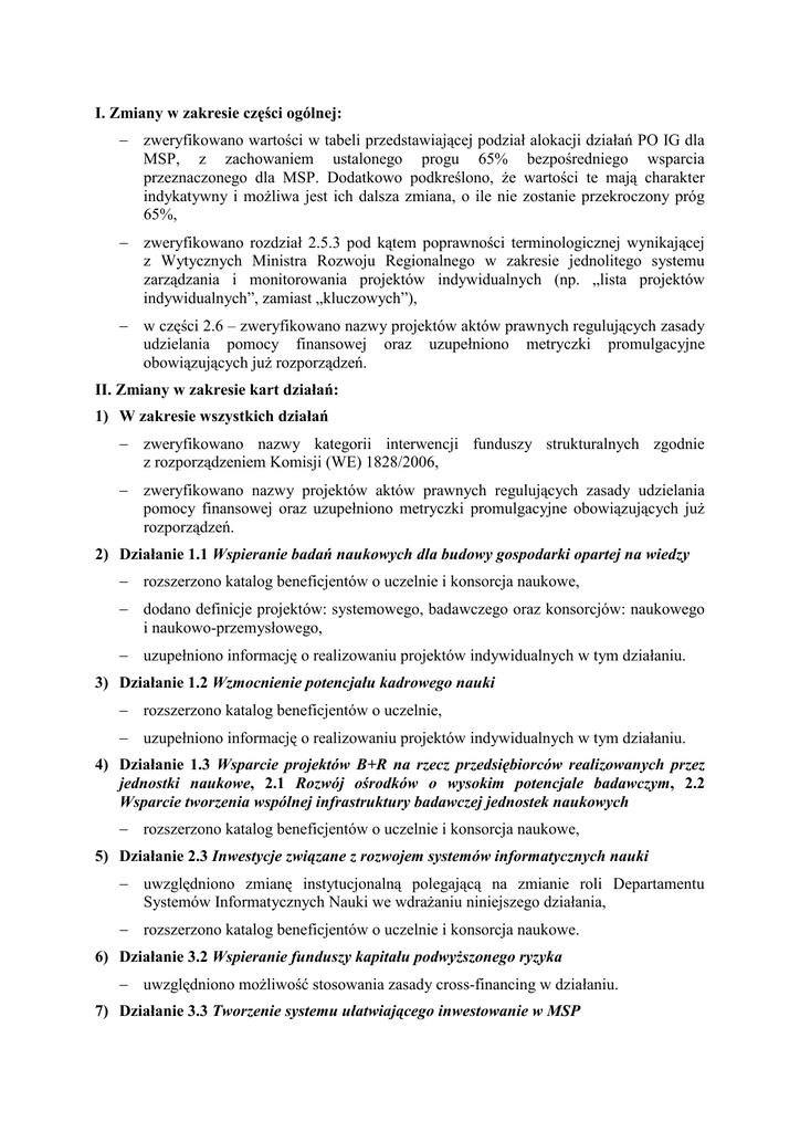 I. Zmiany w zakresie części ogólnej: − zweryfikowano wartości w tabeli przedstawiającej podział alokacji działań PO IG dla MSP, z zachowaniem ustalonego progu 65% bezpośredniego wsparcia przeznaczonego dla MSP. Dodatkowo podkreślono, Ŝe wartości te mają charakter indykatywny i moŜliwa jest ich dalsza zmiana, o ile nie zostanie przekroczony próg 65%, − zweryfikowano rozdział 2.5.3 pod kątem poprawności terminologicznej wynikającej z Wytycznych Ministra Rozwoju Regionalnego w zakresie jednolitego systemu zarządzania i monitorowania projektów indywidualnych (np. „lista projektów indywidualnych”, zamiast „kluczowych”), − w części 2.6 – zweryfikowano nazwy projektów aktów prawnych regulujących zasady udzielania pomocy finansowej oraz uzupełniono metryczki promulgacyjne obowiązujących juŜ rozporządzeń. II. Zmiany w zakresie kart działań: 1) W zakresie wszystkich działań − zweryfikowano nazwy kategorii interwencji funduszy strukturalnych zgodnie z rozporządzeniem Komisji (WE) 1828/2006, − zweryfikowano nazwy projektów aktów prawnych regulujących zasady udzielania pomocy finansowej oraz uzupełniono metryczki promulgacyjne obowiązujących juŜ rozporządzeń. 2) Działanie 1.1 Wspieranie badań naukowych dla budowy gospodarki opartej na wiedzy − rozszerzono katalog beneficjentów o uczelnie i konsorcja naukowe, − dodano definicje projektów: systemowego, badawczego oraz konsorcjów: naukowego i naukowo-przemysłowego, − uzupełniono informację o realizowaniu projektów indywidualnych w tym działaniu. 3) Działanie 1.2 Wzmocnienie potencjału kadrowego nauki − rozszerzono katalog beneficjentów o uczelnie, − uzupełniono informację o realizowaniu projektów indywidualnych w tym działaniu. 4) Działanie 1.3 Wsparcie projektów B+R na rzecz przedsiębiorców realizowanych przez jednostki naukowe, 2.1 Rozwój ośrodków o wysokim potencjale badawczym, 2.2 Wsparcie tworzenia wspólnej infrastruktury badawczej jednostek naukowych − rozszerzono katalog beneficjentów o uczelnie i konsorcja naukowe, 5) Działanie 2.3 Inwestycje związane z rozwojem systemów informatycznych nauki − uwzględniono zmianę instytucjonalną polegającą na zmianie roli Departamentu Systemów Informatycznych Nauki we wdraŜaniu niniejszego działania, − rozszerzono katalog beneficjentów o uczelnie i konsorcja naukowe. 6) Działanie 3.2 Wspieranie funduszy kapitału podwyŜszonego ryzyka − uwzględniono moŜliwość stosowania zasady cross-financing w działaniu. 7) Działanie 3.3 Tworzenie systemu ułatwiającego inwestowanie w MSP − doprecyzowanie brzmienia opisu działania i dostosowanie go do obowiązującego rozporządzenia regulującego zasady jego wdraŜania, − doprecyzowano informację o zakresie stosowania zasady cross-financing, zgodnie z zasadami określonymi w programie pomocowym: taka moŜliwość istnieje jedynie dla projektów instytucji otoczenia biznesu. 8) Działanie 4.3 Kredyt technologiczny − uwzględniono moŜliwość stosowania zasady cross-financing w działaniu. 9) Działanie 4.4 Nowe inwestycje o wysokim potencjale innowacyjnym − wprowadzono korektę informacji nt. uwzględniania rozwiązań marketingowych lub organizacyjnych w projekcie – będą one premiowane, − doprecyzowano informację, Ŝe w przypadku stosowania zasady cross-financing wielkość 1 miliona PLN odnosi się do kwoty dofinansowania na część szkoleniową projektu. 10) Działanie 4.5 Wsparcie inwestycji o duŜym znaczeniu dla gospodarki − korekta informacji w poddziałaniu 4.5.2 – wspierane będą projekty prowadzące do utworzenia centrów badawczo-rozwojowych (np. centra usług inŜynierskich, centra jakości), które nie muszą spełniać wymogów określonych w ustawie o niektórych formach wspierania działalności innowacyjnej, − doprecyzowanie informacji na temat wsparcie na szkolenia i doradztwo – jest ono dostępne tylko dla projektów B+R w poddziałaniu 4.5.2, − doprecyzowano informację, Ŝe w przypadku stosowania zasady cross-financing wielkość 1 miliona PLN odnosi się do kwoty dofinansowania na część szkoleniową projektu. 11) Działanie 5.1 Wspieranie rozwoju powiązań kooperacyjnych o duŜym znaczeniu dla gospodarki − wprowadzono moŜliwość uzyskania zaliczki na projekt realizowany w ramach działania, − doprecyzowano informację, Ŝe w przypadku stosowania zasady cross-financing wielkość 1 miliona PLN odnosi się do kwoty dofinansowania na część szkoleniową projektu. 12) Działanie 5.4 Zarządzanie własnością intelektualną − doprecyzowano informację, Ŝe przedsiębiorcy mogą ubiegać się o dofinansowanie projektów polegających na uzyskaniu ochrony własności przemysłowej LUB realizacji ochrony. 13) Działanie 6.1 Paszport do eksportu − doprecyzowano informację, zgodnie z programem pomocowym, Ŝe moŜliwe jest uzyskanie dofinansowania przez danego przedsiębiorcę tylko na jeden projekt. 14) Priorytet 7. Społeczeństwo informacyjne – budowa elektronicznej administracji − uzupełniono informację nt. instytucji odpowiedzialnej za dokonywanie płatności na rzecz beneficjenta projektu systemowego – jest to minister właściwy ds. informatyzacji. 15) Działanie 8.1 Wspieranie działalności gospodarczej w dziedzinie gospodarki elektronicznej − uzupełniono informację nt. instytucji odpowiedzialnej za dokonywanie płatności na rzecz beneficjenta projektu systemowego – jest to minister właściwy ds. informatyzacji, − doprecyzowano definicję usług świadczonych drogą elektroniczną, zgodnie z ustawą o świadczeniu usług drogą elektroniczną, takŜe w taki sposób by zachować spójność z projektem programu pomocowego, − uzupełniono informację, Ŝe w działaniu nie będą finansowane projekty mające na celu świadczenie usług poczty elektronicznej, − uzupełniono informację, Ŝe w działaniu dany beneficjent otrzyma wsparcie tylko na jeden projekt, −