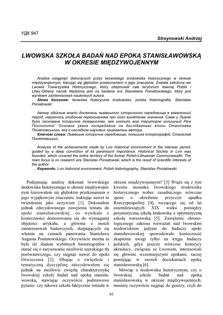 Випуск 11 УДК 947 Stroynowski Andrzej LWOWSKA SZKOŁA BADAŃ NAD EPOKĄ STANISŁAWOWSKĄ W OKRESIE MIĘDZYWOJENNYM Analiza osiągnięć dokonanych przez lwowskiego środowiska historycznego w okresie międzywojennym, kierując się głębokim przekonaniem o jego znaczenie. Została założona we Lwowie Towarzystwa Historycznego, który obejmował całe terytorium dawnej Polski i Litwy.Główny nacisk kładziony jest na badania era Stanisława Poniatowskiego, który jest wynikiem zainteresowań naukowych autora. Słowa kluczowe: lwowskie historyczne środowisko, polska historiografia, Stanisław Poniatowski Автор здійснив аналіз досягнень львівського історичного середовища в міжвоєнний період, керуючись глибоким переконанням про його виняткове значення. Саме у Львові було засноване Історичне товариство, яке охопило всю територію колишньої Речі Посполитої. Основна увага зосереджена на дос лідженнях епохи Станіслава Понятовського, яка є наслідком наукових зацікавлень автора. Ключові слова: Львівське історичне середовище, польська історіографія, Станіслав Понятовський. Analysis of the achievements made by Lviv historical environment in the interwar period, guided by a deep conviction of its paramount importance. Historical Society in Lviv was founded, which covered the entire territory of the former Polish-Lithuanian Commonwealth. The main focus is on research era Stanislav Poniatowski, which is the result of scientific interests of the author. Keywords: Lviv historical environment, Polish historiography, Stanislav Poniatowski. Podejmując analizę dokonań lwowskiego środowiska historycznego w okresie międzywojennym kierowałem się głębokim przekonaniem o jego wyjątkowym znaczeniu, traktując nawet to twierdzenie jako oczywiste [1]. Dokonałem jednak zdecydowanego zawężenia tematu do epoki stanisławowskiej, co wynikało z konieczności dostosowania się do wymaganej objętości artykułu, a głównie z moich zainteresowań badawczych, skupiających się właśnie na czasach panowania Stanisława Augusta Poniatowskiego. Oczywiście można tu było iść śladem wybitnych historiografów i starać się o zarysowanie możliwie szerokiego tła porównawczego, czy sięgnąć nawet do epoki Oświecenia [2]. Dbając o zwięzłość i tematyczną dyscyplinę zdecydowałem się jednak na możliwie zwięzłą charakterystykę lwowskiej szkoły badań nad epoką stanisławowską, stawiając oczywiście podstawowe pytanie: czy takowa szkoła faktycznie istniała w 93 okresie międzywojennym? [3] Wiąże się z tym kwestia stosunku lwowskiego środowiska historycznego wobec zasadniczego wówczas sporu o określenie przyczyn upadku Rzeczypospolitej [4], toczącego się od lat osiemdziesiątych XIX wieku pomiędzy pesymistyczną szkołą krakowską a optymistyczną szkołą warszawską [5]. Zawężenie chronologicznego zakresu rozważań nad lwowskim środowiskiem jedynie do badaczy epoki stanisławowskiej spowodowało konieczność skupienia uwagi tylko na kręgu badaczy polskich, gdyż jeszcze wówczas historycy ukraińscy, związani ze Lwowem, interesowali się głównie wcześniejszymi epokami, raczej pomijając w swoich dociekaniach epokę stanisławowską [6]. Mówiąc o środowisku historycznym, czy o lwowskiej szkole badań nad epoką stanisławowską w okresie międzywojennych, musimy oczywiście sięgnąć do genezy, czyli do Історичний архів XIX w., gdy na mapie naukowej pojawił się Uniwersytet Jana Kazimierza we Lwowie. Wówczas nie było tam jeszcze warunków do podejmowania pogłębionych badań, stąd wiele prac miało charakter popularyzatorski. Wynikało to z charakteru tej uczelni, w której początkowo językiem wykładowym był niemiecki, w którym przez pierwsze lata swoje wykłady prowadził Ksawery Liske. Zdecydowana większość historyków lwowskich swoje studia historyczne zaczynała zresztą na uniwersytetach niemieckich lub w Krakowie. Od samego początku jednak środowisko lwowskich historyków zaznaczyło swoją odrębność na mapie naukowej Polski, szczególnie wyraźnie odcinając się od pesymistycznej wizji szkoły krakowskiej, co jest o tyle dziwne, że do Lwowa w 1880 roku przybył ksiądz Walerian Kalinka [7]. O tej odmienności spojrzenia na dzieje ojczyste zadecydowała postawa pierwszych wielkich historyków lwowskich, zaczynając od Ksawerego Liske, który podejmował polemiki z przedstawicielami szkoły krakowskiej (Józefem Szujskim, Michałem Bobrzyńskim, Walerianem Kalinką), kwestionując możliwość formułowania generalnych sądów, czy odrzucając zasadność kwestionowania sensu dążeń niepodległościowych, chociażby w formie pracy organicznej. Odrzucał też pojawiające się próby negowania polskich rozwiązań ustrojowych z XVI i XVII wieku, które jakoby miały w bezpośredni sposób wpływać na sytuację u schyłku Rzeczypospolitej. Dostrzegał też – całkowicie pominięty przez Bobrzyńskiego – ogrom postępu cywilizacyjnego i gospodarczego, jaki dokonał się w czasach stanisławowskich. Dążąc do umocnienia roli środowiska lwowskiego i umożliwienia szerszej wymiany poglądów i propagowania wiedzy historycznej doprowadził on do założenia w 1886 roku Towarzystwa Historycznego, które swoim zasięgiem objęło całość ziem dawnej Rzeczypospolitej, a następnie w 1887 roku «Kwartalnika Historycznego» [8]. Wzmocniło to niewątpliwie rolę lwowskiego środowiska historycznego. Na rozwój i charakter badań nad wiekiem XVIII i nad epoką stanisławowską zasadniczy wpływ wywarł jednak Henryk Schmi