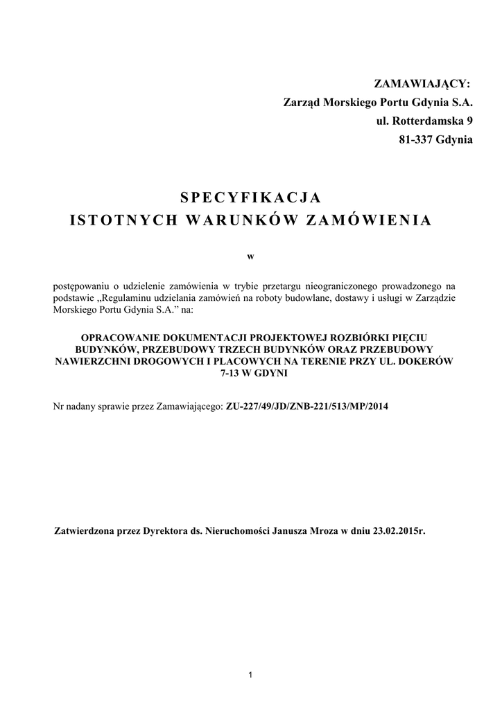 ZAMAWIAJĄCY: Zarząd Morskiego Portu Gdynia S.A. ul. Rotterdamska 9 81-337 Gdynia SPECYFIKACJA ISTOTNYCH WARUNKÓW ZAMÓWIENIA w postępowaniu o udzielenie zamówienia w trybie przetargu nieograniczonego prowadzonego na podstawie „Regulaminu udzielania zamówień na roboty budowlane, dostawy i usługi w Zarządzie Morskiego Portu Gdynia S.A.” na: OPRACOWANIE DOKUMENTACJI PROJEKTOWEJ ROZBIÓRKI PIĘCIU BUDYNKÓW, PRZEBUDOWY TRZECH BUDYNKÓW ORAZ PRZEBUDOWY NAWIERZCHNI DROGOWYCH I PLACOWYCH NA TERENIE PRZY UL. DOKERÓW 7-13 W GDYNI Nr nadany sprawie przez Zamawiającego: ZU-227/49/JD/ZNB-221/513/MP/2014 Zatwierdzona przez Dyrektora ds. Nieruchomości Janusza Mroza w dniu 23.02.2015r. 1 SPIS TREŚCI 1. Rozdział I – Definicje 2. Rozdział II – Informacje o Zamawiającym 3. Rozdział III – Tryb udzielenia zamówienia 4. Rozdział IV – Opis przedmiotu zamówienia 5. Rozdział V – Termin wykonania zamówienia 6. Rozdział VI – Opis warunków udziału w postępowaniu oraz opis sposobu dokonywania oceny spełnienia tych warunków 7. Rozdział VII – Wykaz oświadczeń lub dokumentów, jakie mają dostarczyć wykonawcy, w tym w celu potwierdzenia spełniania warunków udziału w postępowaniu 8. Rozdział VIII – Informacje o sposobie porozumiewania się Zamawiającego z Wykonawcami 9. Rozdział IX – Termin związania ofertą 10. Rozdział X – Opis sposobu przygotowania ofert 11. Rozdział XI – Miejsce oraz termin składania i otwarcia ofert 12. Rozdział XII – Opis sposobu obliczenia ceny 13. Rozdział XIII – Kryteria oceny ofert 14. Rozdział XIV – Informacje o formalnościach, jakie powinny zostać dopełnione po wyborze oferty w celu zawarcia umowy 15. Rozdział XV – Istotne dla stron postanowienia, które zostaną wprowadzone do treści zawieranej umowy 16. Rozdział XVI – Materiały przetargowe 17. Rozdział XVII – Wykaz załączników do SIWZ 18. Rozdział XVIII – Inne postanowienia 2 ROZDZIAŁ I DEFINICJE 1. Określenia użyte w Specyfikacji Istotnych Warunków Zamówienia oznaczają : 1) SIWZ - niniejsza specyfikacja istotnych warunków zamówienia; 2) postępowanie - postępowanie o udzielenie zamówienia prowadzone przez Zamawiającego na podstawie „Regulaminu udzielania zamówień na roboty budowlane, dostawy i usługi w Zarządzie Morskiego Portu Gdynia S.A.” podanego do publicznej wiadomości na stronie internetowej Zamawiającego: www.port.gdynia.pl oraz SIWZ; 3) Zamawiający - Zarząd Morskiego Portu Gdynia S.A. z siedzibą w Gdyni; 4) Wykonawca - osoba fizyczna, osoba prawna albo jednostka organizacyjna nie posiadająca osobowości prawnej, która ubiega się o udzielenie Zamówienia, złożyła ofertę na wykonanie Zamówienia lub zawarła umowę; 5) zamówienie - zamówienie, którego przedmiot został opisany w Rozdziale IV SIWZ; 6) umowa - oznacza umowę w sprawie zamówienia zawartą pomiędzy Zamawiającym, a Wykonawcą wyłonionym w Postępowaniu. 2. Określenia, o których mowa w ust. 1 zachowują przypisane im znaczenie we wszystkich załącznikach do SIWZ, w tym we wzorze umowy. ROZDZIAŁ II INFORMACJE O ZAMAWIAJĄCYM 1) Zamawiający: Zarząd Morskiego Portu Gdynia Spółka Akcyjna; 2) Adres: 81-337 Gdynia, ul. Rotterdamska 9; 3) KRS: 0000082699 – Sąd Rejonowy Gdańsk – Północ w Gdańsku, VIII Wydział Gospodarczy Krajowego Rejestru Sądowego; 4) REGON : 191920577; 5) NIP : 9581323524; 6) Kapitał zakładowy: 112 285 300 PLN; 7) Adres do korespondencji w sprawie zamówienia: Zarząd Morskiego Portu Gdynia S.A. ul. Rotterdamska 9, 81-337 Gdynia, Dział Umów i Rozliczeń, pok. nr 330; 8) Nr faksu w sprawie zamówienia: (58) 627 47 65; 9) Adres e-mail: [email protected], m.kalaczyń[email protected]; 10) Adres strony internetowej Zamawiającego: www.port.gdynia.pl. ROZDZIAŁ III TRYB UDZIELENIA ZAMÓWIENIA 1. Postępowanie prowadzone jest w trybie przetargu nieograniczonego, na podstawie Regulaminu, o którym mowa w Rozdziale I ust. 1 pkt 2) SIWZ. 2. Postępowanie prowadzi się w języku polskim. ROZDZIAŁ IV OPIS PRZEDMIOTU ZAMÓWIENIA 1. Przedmiotem zamówienia jest opracowanie dokumentacji projektowej rozbiórki pięciu budynków, przebudowy trzech budynków oraz przebudowy nawierzchni drogowych i placowych na terenie przy ul. Dokerów 7-13 w Gdyni, wraz z uzyskaniem prawomocnej decyzji o pozwoleniu na budowę. 3 2. Dane ogólne o budynkach zlokalizowanych przy ul. Dokerów 7-11, przewidzianych do rozbiórki i przebudowy: 1) Budynek biurowo-socjalny przy ul. Dokerów 7 o nr inw. 105-0115, do całkowitej rozbiórki: Kubatura budynku – ca. 7811,7 m3 Powierzchnia zabudowy – ca. 816,9 m2 Powierzchnia użytkowa – ca. 1840,4 m2 Ilość kondygnacji nadziemnych – 3 Rok budowy – 1936 Budynek niepodpiwniczony trzykondygnacyjny ze stromym dachem wielospadowym, o konstrukcji nośnej murowanej z cegły ceramicznej wykończonej obustronnie tynkiem, fundamenty – ławy żelbetowe. Ściany działowe z cegły ceramicznej i płyt gipsowo-kartonowych, schody żelbetowe, stropy Ackermana. Dach drewniany kryty fałdową blachą stalową. Posadzki ceramiczne, PCV i wykładziny dywanowe. Budynek wyposażony jest w rękaw ewakuacyjny, instalację elektryczną, teletechniczną, c.o., wodno-kanalizacyjną, wentylacyjną mechaniczną i grawitacyjną, instalację odgromową, hydrantową. Na parterze budynku zlokalizowany jest węzeł c.o. Przy budynku zlokalizowany jest parking samochodów osobowych o nr inw. 220-2183, o całkowitej powierzchni około 1145 m2 i o układzie warstw konstrukcji nawierzchni: podłoże gruntowe, podsypka piaskowa, płyty betonowe. Budynek wpisany do Gminnej Ewidencji Zabytków dla miasta Gdyni 2) Budynek wielofunkcyjny przy ul. Dokerów 11 o nr inw. 101-0033, do całkowitej rozbiórki: Kubatura budynku – ca. 8074,74 m3 Powierzchnia zabudowy – ca. 582,0 m2 Powierzchnia użytkowa – ca. 1488,9 m2 Ilość kondygnacji nadziemnych - 2 Ilość kondygnacji podziemnych - 1 Rok budowy - 1940 Budynek dwukondygnac