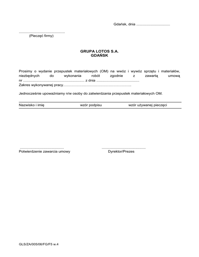 Gdańsk, dnia ................................. ............................................. (Pieczęć firmy) GRUPA LOTOS S.A. GDAŃSK Prosimy o wydanie przepustek materiałowych (OM) na wwóz i wywóz sprzętu i materiałów, niezbędnych do wykonania robót zgodnie z zawartą umową nr ............................................................ z dnia .......................................... Zakres wykonywanej pracy……………………………………………….. Jednocześnie upowaŜniamy n/w osoby do zatwierdzania przepustek materiałowych OM. Nazwisko i imię ........................................... Potwierdzenie zawarcia umowy GLS/ZA/005/06/FG/F5 w.4 wzór podpisu wzór uŜywanej pieczęci ........................................... Dyrektor/Prezes