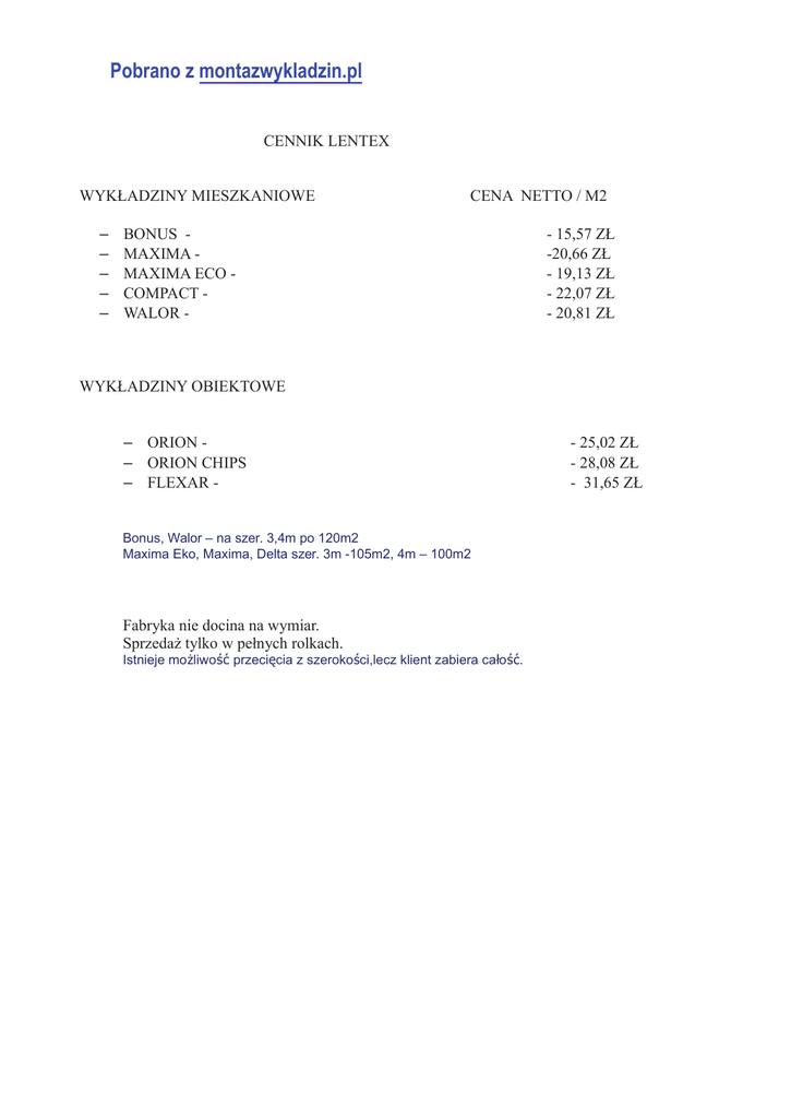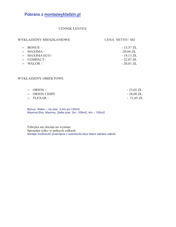 Pobrano z montazwykladzin.pl ! " ! !# $! Bonus, Walor – na szer. 3,4m po 120m2 Maxima Eko, Maxima, Delta szer. 3m -105m2, 4m – 100m2 $%&'()%*+,-./+*%*%0(1+%'2 3'4,-%57(8).03,9*(/:'.8)%/:2 Istnieje mo liwo przecicia z szeroko ci,lecz klient zabiera ca o . ""