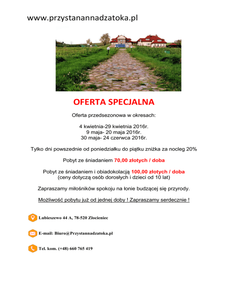 www.przystanannadzatoka.pl OFERTA SPECJALNA Oferta przedsezonowa w okresach: 4 kwietnia-29 kwietnia 2016r. 9 maja- 20 maja 2016r. 30 maja- 24 czerwca 2016r. Tylko dni powszednie od poniedziałku do piątku zniżka za nocleg 20% Pobyt ze śniadaniem 70,00 złotych / doba Pobyt ze śniadaniem i obiadokolacją 100,00 złotych / doba (ceny dotyczą osób dorosłych i dzieci od 10 lat) Zapraszamy miłośników spokoju na łonie budzącej się przyrody. Możliwość pobytu już od jednej doby ! Zapraszamy serdecznie ! Lubieszewo 44 A, 78-520 Złocieniec E-mail: [email protected] Tel. kom. (+48) 660 765 419 www.przystanannadzatoka.pl