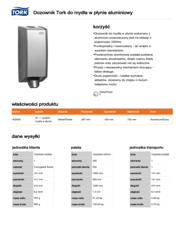 Dozownik Tork do mydła w płynie aluminiowy korzyść •Dozownik do mydła w płynie wykonany z aluminium przeznaczony jest na wkłady o pojemności 1000ml •Funkcjonalny i nowoczesny - do wnętrz o wysokim standardzie •Powierzchnia aluminiowa została poddana utlenianiu anodowemu, dzięki czemu ślady palców oraz zarysowań nie są widoczne •Prosty i niezawodny mechanizm dozujący łatwa obsługa •Duża pojemność - rzadka wymiana wkładów, stosowny do miejsc o dużym natężeniu ruchu Metal/Plasti k właściwości produktu artykuł system Materiał Wysokość Szerokość Głębokość Kolor 452000 S1 — system mydła w płynie Metal/Plastik 297 mm 105 mm 102 mm Aluminium/Szary dane wysyłki jednostka klienta paleta jednostka transportu EAN 7322540122565 EAN 7322540137910 EAN 7322540122565 elementy 1 elementy 200 elementy 1 materiał Corrugated board jednostki klienta 200 jednostki klienta 1 wysokość 141 mm wysokość 1560 mm wysokość 141 mm szerokość 141 mm szerokość 800 mm szerokość 141 mm długość 314 mm długość 1200 mm długość 314 mm objętość 6.2 dm3 objętość 1.2 m3 objętość 6.2 dm3 masa netto 457 g masa netto 91.40 kg masa netto 0.46 kg masa brutto 695 g masa brutto 139.00 kg masa brutto 0.70 kg