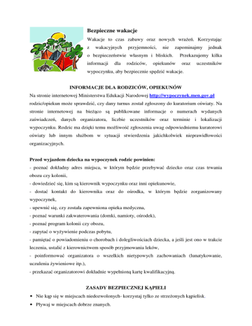 Bezpieczne wakacje Wakacje to czas zabawy oraz nowych wrażeń. Korzystając z wakacyjnych przyjemności, nie zapominajmy o bezpieczeństwie własnym i bliskich. informacji dla rodziców, opiekunów jednak Przekazujemy kilka oraz uczestników wypoczynku, aby bezpiecznie spędzić wakacje. INFORMACJE DLA RODZICÓW, OPIEKUNÓW Na stronie internetowej Ministerstwa Edukacji Narodowej http://wypoczynek.men.gov.pl rodzic/opiekun może sprawdzić, czy dany turnus został zgłoszony do kuratorium oświaty. Na stronie internetowej na bieżąco są publikowane informacje o numerach wydanych zaświadczeń, danych organizatora, liczbie uczestników oraz terminie i lokalizacji wypoczynku. Rodzic ma dzięki temu możliwość zgłoszenia uwag odpowiedniemu kuratorowi oświaty lub innym służbom w sytuacji stwierdzenia jakichkolwiek nieprawidłowości organizacyjnych. Przed wyjazdem dziecka na wypoczynek rodzic powinien: - poznać dokładny adres miejsca, w którym będzie przebywać dziecko oraz czas trwania obozu czy kolonii, - dowiedzieć się, kim są kierownik wypoczynku oraz inni opiekunowie, - dostać kontakt do kierownika oraz do ośrodka, w którym będzie zorganizowany wypoczynek, - upewnić się, czy została zapewniona opieka medyczna, - poznać warunki zakwaterowania (domki, namioty, ośrodek), - poznać program kolonii czy obozu, - zapytać o wyżywienie podczas pobytu, - pamiętać o powiadomieniu o chorobach i dolegliwościach dziecka, a jeśli jest ono w trakcie leczenia, ustalić z kierownictwem sposób przyjmowania leków, - poinformować organizatora o wszelkich nietypowych zachowaniach (lunatykowanie, uczulenia żywieniowe itp.), - przekazać organizatorowi dokładnie wypełnioną kartę kwalifikacyjną. ZASADY BEZPIECZNEJ KĄPIELI • Nie kąp się w miejscach niedozwolonych- korzystaj tylko ze strzeżonych kąpielisk. • Pływaj w miejscach dobrze znanych. • Pływanie rozpocznij od ochłodzenia najbardziej ukrwionych miejsc ciała- klatki piersiowej, karku. • Nie zapominaj o zdrowym rozsądku i przestrzeganiu podstawowych zasad bezpieczeństwa. • Nie pływaj w okolicy mostów, omijaj dzikie kąpieliska, rzeki. • Nie kąp się po rozgrzaniu ciała, posiłku czy wysiłku fizycznym. • Nie skacz do wody w miejscach nieznanych. • Nie wypływaj za daleko od brzegu- nie przeceniaj swoich umiejętności. • Nie wrzucaj ani nie popychaj innych. W GÓRACH, W LESIE Zabierz ze sobą ciepłe ubranie, jedzenie i napoje. Nigdy nie schodź ze szlaku i nie oddalaj się od grupy. Uważaj na kleszcze i owady, chroń się przed nimi odpowiednim ubraniem i preparatami odstraszającymi. Nie zbieraj grzybów, jeśli nie jesteś pewien czy są jadalne. BEZPIECZNE OPALANIE o Nie przebywaj za długo na słońcu. o Stosuj kremy z filtrami ochronnymi. o Zaopatrz się w okulary przeciwsłoneczne, czapkę lub chustę. o Pij dużo wody niegazowanej. DBAJ O ZDROWIE ORAZ HIGIENĘ • Dbaj o higienę osobistą oraz czystość wokół siebie. • Nie spożywaj posiłków ze wspólnych naczyń. • Myj ręce przed każdym posiłkiem. • Nie używaj wspólnych przyborów toaletowych. Opracowała: Dorota Kimsa