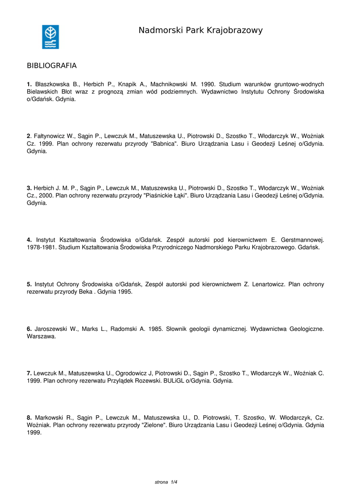 Nadmorski Park Krajobrazowy BIBLIOGRAFIA 1. Błaszkowska B., Herbich P., Knapik A., Machnikowski M. 1990. Studium warunków gruntowo-wodnych Bielawskich Błot wraz z prognozą zmian wód podziemnych. Wydawnictwo Instytutu Ochrony Środowiska o/Gdańsk. Gdynia. 2. Fałtynowicz W., Sągin P., Lewczuk M., Matuszewska U., Piotrowski D., Szostko T., Włodarczyk W., Wożniak Cz. 1999. Plan ochrony rezerwatu przyrody "Babnica". Biuro Urządzania Lasu i Geodezji Leśnej o/Gdynia. Gdynia. 3. Herbich J. M. P., Sągin P., Lewczuk M., Matuszewska U., Piotrowski D., Szostko T., Włodarczyk W., Wożniak Cz., 2000. Plan ochrony rezerwatu przyrody "Piaśnickie Łąki". Biuro Urządzania Lasu i Geodezji Leśnej o/Gdynia. Gdynia. 4. Instytut Kształtowania Środowiska o/Gdańsk. Zespół autorski pod kierownictwem E. Gerstmannowej. 1978-1981. Studium Kształtowania Środowiska Przyrodniczego Nadmorskiego Parku Krajobrazowego. Gdańsk. 5. Instytut Ochrony Środowiska o/Gdańsk, Zespół autorski pod kierownictwem Z. Lenartowicz. Plan ochrony rezerwatu przyrody Beka . Gdynia 1995. 6. Jaroszewski W., Marks L., Radomski A. 1985. Słownik geologii dynamicznej. Wydawnictwa Geologiczne. Warszawa. 7. Lewczuk M., Matuszewska U., Ogrodowicz J, Piotrowski D., Sągin P., Szostko T., Włodarczyk W., Woźniak C. 1999. Plan ochrony rezerwatu Przylądek Rozewski. BULiGL o/Gdynia. Gdynia. 8. Markowski R., Sągin P., Lewczuk M., Matuszewska U., D. Piotrowski, T. Szostko, W. Włodarczyk, Cz. Wożniak. Plan ochrony rezerwatu przyrody "Zielone". Biuro Urządzania Lasu i Geodezji Leśnej o/Gdynia. Gdynia 1999. strona 1/4 9. Mejer E., Orzołek M. 1999.Stan Zachowania wybranych gatunków roślin naczyniowych w zagłębieniach międzywydmowych w Białogórze (Pobrzeże Kaszubskie). Praca magisterska wykonana w Katedrze Ekologii Roślin i Ochrony Przyrody Uniwersytetu Gdańskiego. Gdańsk. 10. Mieńko W. 1994. Aktualizacja przebiegu granic i uzupełnienie dokumentacji przyrodniczej projektowanego rezerwatu roślinności solniskowej i ptaków "Rzeczne Łąki". Gdynia. 11. Markowski R.., Meissner W., 1997."Szlak przyrodniczy-Rewa Mechalinki". Nadbałtyckie Centrum Edukacji Ekologicznej i Ekorozwoju, Gdańsk. 12. Praca zbiorowa pod redakcją A. Janty. 1997. Nadmorski Park Krajobrazowy. Wydawnictwo NPK. Władysławowo. 13. www.geografia-polski.republika.pl 14. Basiński A., Grabowicz A.,Medowski T.,1989. "Budować na wsi- zasady kształtowania krajobrazu wiejskiego w subregionach woj.gdańskiego, część I pas nadmorski". Gdańska Pracownia Architektury Regionalnej i Krajobrazu,Gdańsk. 15. Gerstmannowa E.red.,2000. "Materiały do monografii przyrodniczej regionu gdańskiego,tom III "Nadmorski Park Krajobrazowy".Wydawnictwo "Mapress", Gdańsk. 16. Jakubowska B., Nogaczewski M.,1996. "Nadmorski Park Krajobrazowy.Studium wartości kulturowych dla potrzeb planu ochrony". Regionalny Ośrodek Studiów i Ochrony Środowiska Kulturowego w Gdańsku, Gdańsk. 17. Jankowski J.,2001 "Rezerwaty przyrody Nadmorskiego Parku Krajobrazowego". Wydawnictwo EkoKapio.Sopot. 18. Piotrowska H..2003. "Zróżnicowanie i dynamika nadmorskich lasów i zarośli w Polsce". Bogucki Wydawnictwo Naukowe. Poznań-Gdańsk. strona 2/4 19. Jonson L.`1998. "../ptaki Europy i obszaru śródziemnomorskiego". Muza SA,Warszawa' 20. Kruk-Dowgiałło.L. red., 2000. "../przyrodnicza waloryzacja morskich części obszarów chronionych HELCOM BSPA województwa pomorskiego, część 3 Nadmorski Park Krajobrazowy". Centrum Biologii Morza PAN, Gdynia. 21. Luck K.,1939,Wierzba P.tłum.2000. "Karwińskie Błota nad Morzem Bałtyckim", Krokowa. 22. Sokołowski J.,1992. "../ptaki Polski". Wydawnictwo Szkolne i Pedagogiczne, Warszawa. 23. Subotowicz W.,Janta A.,1998. "Brzegi Morskie- trasa dydaktyczna". Wydawnictwo NPK,Wydawnictwo DJ,Gdańsk. 24. Tobolski K.,2003. "Torfowiska na pzrykładzie Ziemi Świeckiej". Towarzystwo Przyjaciół Dolnej Wisły,Świecie. 25. Wysocki C.,Sikorski P.,2000. "Zarys fitosocjologii stosowanej". Wydawnictwo SGGW,Warszawa. 26. Herbichowa M.,Herbich J.,Budyś A.,Gromadzki M.,2002. "Dokumentacja przyrodnicza projektowanego rezerwatu Długosz Królewski w Wierzchucinie" Gdańsk. 27. Błaszkowska B.,Gromadzki M.,Machnikowski M.,1995. "../program ochrony czynnej ostoi ptaków Bielawskie Błota"Ogólnopolskie Towarzystwo Ochrony Ptaków. Gdańsk. 28. Lehki R.,1982. "../plan urządzenia gospodarstwa rezerwatu przyrody "Białogóra". Biuro Urządzenia Lasów i Geodezji Leśnej. Gdynia. strona 3/4 29. Fałtynowicz W., Lewczuk M., Matuszewska U., Piotrowski D., Szostko T., Włodarczyk W., Woźniak C., 1999. "../plan ochrony Rezerwatu Przyrody "Babnica" na lata 2000 - 2019." Biuro urządzania Lasu i Geodezji Leśnej. Gdynia. strona 4/4 Powered by TCPDF (www.tcpdf.org)