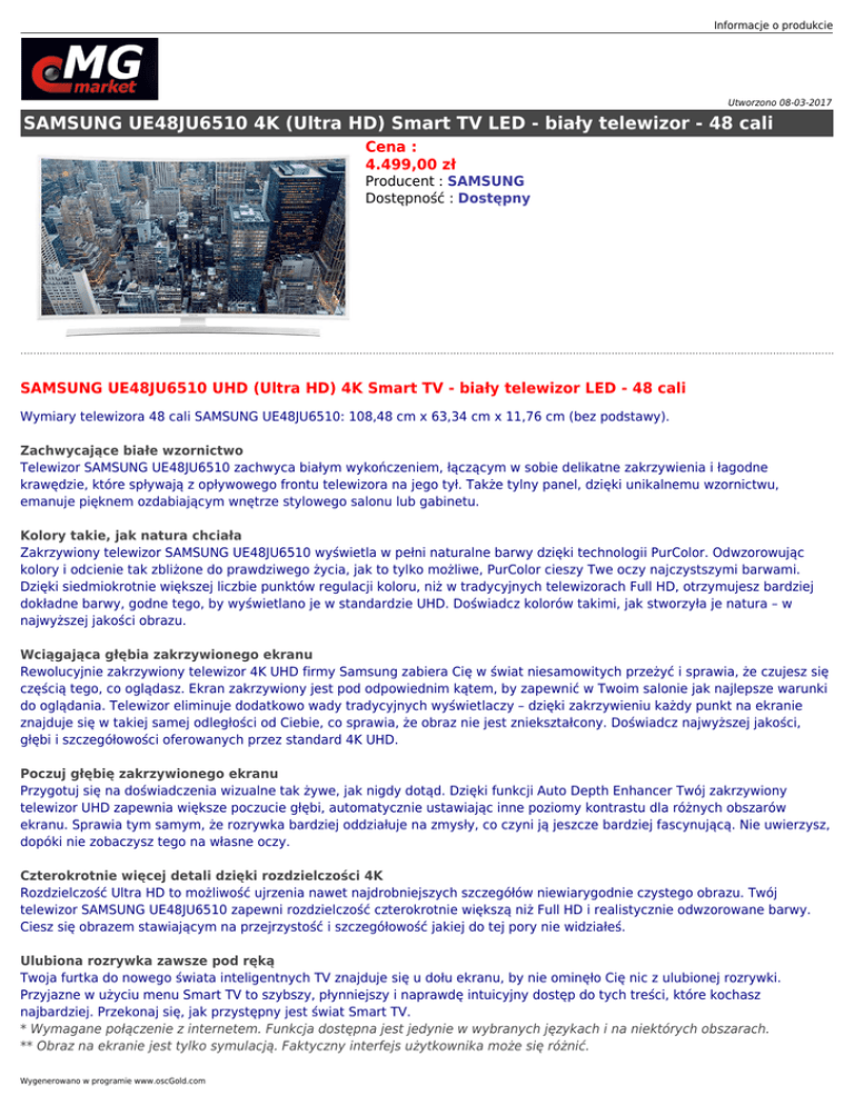 Informacje o produkcie Utworzono 08-03-2017 SAMSUNG UE48JU6510 4K (Ultra HD) Smart TV LED - biały telewizor - 48 cali Cena : 4.499,00 zł Producent : SAMSUNG Dostępność : Dostępny SAMSUNG UE48JU6510 UHD (Ultra HD) 4K Smart TV - biały telewizor LED - 48 cali Wymiary telewizora 48 cali SAMSUNG UE48JU6510: 108,48 cm x 63,34 cm x 11,76 cm (bez podstawy). Zachwycające białe wzornictwo Telewizor SAMSUNG UE48JU6510 zachwyca białym wykończeniem, łączącym w sobie delikatne zakrzywienia i łagodne krawędzie, które spływają z opływowego frontu telewizora na jego tył. Także tylny panel, dzięki unikalnemu wzornictwu, emanuje pięknem ozdabiającym wnętrze stylowego salonu lub gabinetu. Kolory takie, jak natura chciała Zakrzywiony telewizor SAMSUNG UE48JU6510 wyświetla w pełni naturalne barwy dzięki technologii PurColor. Odwzorowując kolory i odcienie tak zbliżone do prawdziwego życia, jak to tylko możliwe, PurColor cieszy Twe oczy najczystszymi barwami. Dzięki siedmiokrotnie większej liczbie punktów regulacji koloru, niż w tradycyjnych telewizorach Full HD, otrzymujesz bardziej dokładne barwy, godne tego, by wyświetlano je w standardzie UHD. Doświadcz kolorów takimi, jak stworzyła je natura – w najwyższej jakości obrazu. Wciągająca głębia zakrzywionego ekranu Rewolucyjnie zakrzywiony telewizor 4K UHD firmy Samsung zabiera Cię w świat niesamowitych przeżyć i sprawia, że czujesz się częścią tego, co oglądasz. Ekran zakrzywiony jest pod odpowiednim kątem, by zapewnić w Twoim salonie jak najlepsze warunki do oglądania. Telewizor eliminuje dodatkowo wady tradycyjnych wyświetlaczy – dzięki zakrzywieniu każdy punkt na ekranie znajduje się w takiej samej odległości od Ciebie, co sprawia, że obraz nie jest zniekształcony. Doświadcz najwyższej jakości, głębi i szczegółowości oferowanych przez standard 4K UHD. Poczuj głębię zakrzywionego ekranu Przygotuj się na doświadczenia wizualne tak żywe, jak nigdy dotąd. Dzięki funkcji Auto Depth Enhancer Twój zakrzywiony telewizor UHD zapewnia większe poczucie głębi, automatycznie ustawiając inne poziomy kontrastu dla różnych obszarów ekranu. Sprawia tym samym, że rozrywka bardziej oddziałuje na zmysły, co czyni ją jeszcze bardziej fascynującą. Nie uwierzysz, dopóki nie zobaczysz tego na własne oczy. Czterokrotnie więcej detali dzięki rozdzielczości 4K Rozdzielczość Ultra HD to możliwość ujrzenia nawet najdrobniejszych szczegółów niewiarygodnie czystego obrazu. Twój telewizor SAMSUNG UE48JU6510 zapewni rozdzielczość czterokrotnie większą niż Full HD i realistycznie odwzorowane barwy. Ciesz się obrazem stawiającym na przejrzystość i szczegółowość jakiej do tej pory nie widziałeś. Ulubiona rozrywka zawsze pod ręką Twoja furtka do nowego świata inteligentnych TV znajduje się u dołu ekranu, by nie ominęło Cię nic z ulubionej rozrywki. Przyjazne w użyciu menu Smart TV to szybszy, płynniejszy i naprawdę intuicyjny dostęp do tych treści, które kochasz najbardziej. Przekonaj się, jak przystępny jest świat Smart TV. * Wymagane połączenie z internetem. Funkcja dostępna jest jedynie w wybranych językach i na niektórych obszarach. ** Obraz na ekranie jest tylko symulacją. Faktyczny interfejs użytkownika może się różnić. Wygenerowano w programie www.oscGold.com *** Przedstawione treści, usługi TV i funkcje mogą nie być dostępne we wszystkich regionach i krajach. Nowy, intuicyjny i szybszy Smart TV Poznaj łatwy i intuicyjny Smart TV, który otwiera przed Tobą świat pełen możliwości. Szybki, potężny i zapewniający ogrom zabawy - na dodatek łatwy w obsłudze. Swoje ulubione treści masz zawsze pod ręką w Smart Hub, który jest zachwycająco szybki dzięki czterordzeniowemu procesorowi i systemowi operacyjnemu Tizen. Włącza się błyskawicznie, a nawet zapamiętuje ostatnio odtwarzane treści, które wznawia w mgnieniu oka. Możesz także przeglądać internet nie rezygnując z oglądania ulubionego programu. Smart TV stał się właśnie znacznie lepszy. Szybka synchronizacja z urządzeniami mobilnymi Funkcja Samsung Quick Connect (Szybkie Połączenie) to łatwy sposób na udostępnianie treści pomiędzy telewizorem, a urządzeniami mobilnymi. Teraz w prosty sposób pokażesz rodzinie śmieszny filmik, dokończysz na dużym ekranie rozpoczęty w drodze serial. Telewizor SAMSUNG UE48JU6510 Smart TV odbiera sygnał, gdy wykryje przez Bluetooth pasujące urządzenie i po potwierdzeniu, błyskawicznie wyświetli wideo w optymalnej rozdzielczości. Działa to również w drugą stronę - możesz kontynuować oglądanie na ekranie urządzenia mobilnego, w dowolnym miejscu domu. Ciesz się nieskrępowaną rozrywką. * Funkcja jest kompatybilna tylko z wybranymi modelami telewizorów i urządzeń mobilnych. O szczegóły zapytaj sprzedawcę. Lepszy start dnia ze Smart TV Wyobraź sobie lepszy początek dnia. Telewizor SAMSUNG UE48JU6510 może włączyć się w chwili, gdy włączy się alarm w Twoim telefonie, a następnie wyświetli na ekranie niezbędne informacje – kalendarz dnia, prognozę pogody. Wszystko na dużym ekranie, gdy Ty szykujesz się do wyjścia. Dobre wejście w nowy dzień dzięki funkcji Briefing on TV. * Obraz na ekranie jest tylko symulacją. Faktyczny interfejs użytkownika może się różnić. ** Przedstawione treści, usługi TV i funkcje mogą nie być dostępne we wszystkich regionach i krajach. *** Telewizor wyświetli ostatnio oglądany kanał. **** Funkcja jest kompatybilna tylko z wybranymi modelami telewizorów i urządzeń mobilnych. Treści dopasowane do Ciebie W Samsung Smart TV każdy znajdzie coś dla siebie. Kucharze pokochają aplikacje związane z gotowaniem, natomiast kibice docenią dynamiczną aplikację sportową. Biblioteka Smart TV to także świat dziecięcych gier i kolorowych bajek. Przygotowaliśmy również dedykowaną graczom platformę, oferującą szeroką gamę 