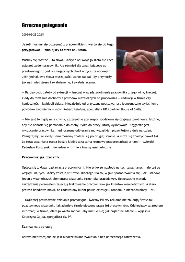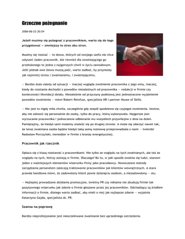 Grzeczne poŜegnanie 2006-06-23 20:54 JeŜeli musimy się poŜegnać z pracownikiem, warto się do tego przygotować — zmniejszy to stres obu stron. Musimy się rozstać — to słowa, których od swojego szefa nie chce usłyszeć Ŝaden pracownik. Ale równieŜ dla zwalniającego go przełoŜonego to jedna z najgorszych chwil w Ŝyciu zawodowym. Jeśli jednak owe słowa muszą paść, warto zadbać, by przyniosły jak najmniej stresu i zwalnianemu, i zwalniającemu. — Bardzo duŜo zaleŜy od sytuacji — inaczej wygląda zwolnienie pracownika z jego winy, inaczej, kiedy do rozstania dochodzi z powodów niezaleŜnych od pracownika — redukcji w firmie czy konieczności likwidacji działu. NiezaleŜnie od przyczyny podstawą jest jednoznaczne wyjaśnienie powodów zwolnienia — mówi Robert Reinfuss, specjalista HR i partner House of Skills. — Nie jest to nigdy miła chwila, szczególnie gdy zespół spodziewa się czyjegoś zwolnienia. Istotne, aby nie odnosić się personalnie do osoby, tylko do pracy, którą wykonywała. Najgorsze jest wyrzucanie pracownika i jednoczesne odbieranie mu wszystkich przywilejów z dnia na dzień. Pamiętajmy, Ŝe kiedyś sami moŜemy znaleźć się po drugiej stronie. A moŜe się zdarzyć nawet tak, Ŝe teraz zwalniana osoba będzie kiedyś taką samą rozmowę przeprowadzała z nami — twierdzi Radosław Porczyński, menedŜer w firmie z branŜy energetycznej. Pracownik jak rzecznik Opłaca się z klasą rozstawać z pracownikami. Nie tylko ze względu na tych zwalnianych, ale teŜ ze względu na tych, którzy zostają w firmie. Dlaczego? Bo to, w jaki sposób zwalnia się ludzi, stanowi jeden z waŜniejszych elementów wizerunku firmy jako pracodawcy. Nowoczesne metody zarządzania personelem zalecają traktowanie pracowników jak klientów wewnętrznych. A stara prawda handlowa mówi, Ŝe zadowolony klient powie dziesięciu osobom, a niezadowolony — stu. — Najlepiej prowadzone działania promocyjne, świetny PR czy reklama nie zbudują firmie tak pozytywnego wizerunku jak zdanie o firmie głoszone przez jej pracowników. Odchodzący są źródłem informacji o firmie, dlatego warto zadbać, aby mieli o niej jak najlepsze zdanie — wyjaśnia Katarzyna Gajda, specjalista ds. PR. Szansa na poprawę Bardzo nieprofesjonalne jest nieoczekiwane zwalnianie bez uprzedniego ostrzeŜenia. — Bezpośredni przełoŜony powinien z wyprzedzeniem powiedzieć pracownikowi, Ŝe nie jest zadowolony z jego pracy. Często w rozmowie wspólnie ustala się program naprawczy, czyli jasno określa, co dana osoba ma zmienić — podpowiada Monika Buchajska-Wróbel z firmy doradztwa personalnego Inwenta People Management Solutions. NaleŜy sprecyzować ramy czasowe oraz elementy tego programu i rozliczać ich wykonanie na bieŜąco. UmoŜliwi to odniesienie się do konkretnych argumentów w czasie końcowej rozmowy. Jeśli i ten pomysł zawiedzie, trzeba przygotować się do profesjonalnego przeprowadzenia zwolnienia. Szef przed rozmową z pracownikiem powinien przygotować rzetelne argumenty. Najlepiej, by miał je spisane na kartce. — Nawet wtedy, gdy pracownik się z nimi nie zgodzi, poczuje się powaŜnie potraktowany. Rozmowa z pracownikiem powinna dotyczyć tylko i wyłącznie argumentów merytorycznych — zwraca uwagę Robert Reinfuss. Najpierw zła Zwykle pracodawcy słusznie stosują zasadę podawania najpierw złej, a potem dobrej wiadomości. Najpierw przedstawiają powody zwolnienia, a następnie „osładzają” decyzję np. dodatkowym miesiącem zatrudnienia. — Dobrym pomysłem jest zawieranie płatnych umów o zakazie konkurencji. W razie konfliktu i nieumiejętnego przeprowadzenia zwolnienia pracodawca musi liczyć się z tym, Ŝe sfrustrowany pracownik moŜe narazić firmę na utratę waŜnych danych czy dobrego wizerunku — wyjaśnia Robert Reinfuss. JeŜeli budŜet firmy na to pozwala, warto pomyśleć o przygotowaniu programu outplacementowego dla zwalnianego pracownika. Ooutplacement zapewnia wsparcie pracownikom opuszczającym miejsce pracy z powodów zaleŜnych od pracodawcy i ułatwia nawiązanie stosunku pracy z nowym pracodawcą. — Osoba w ten sposób zwalniana poczuje, Ŝe ma wsparcie. Konsultanci programu pokaŜą jej, jakie są moŜliwości poszukiwania pracy, pomogą przeanalizować profil zawodowy oraz wspólnie z zainteresowanym nakreślą indywidualny plan działania — tłumaczy Monika Buchajska-Wróbel z Inwenty. Outplacement buduje bardzo pozytywny wizerunek firmy jako organizacji dbającej o swoich pracowników. Pomogą kadry W razie rozstania z winy pracodawcy — gdy firma zamyka dział lub musi redukować załogę ze względu na zmniejszenie kosztów — szef powinien jasno powiedzieć pracownikowi, Ŝe to nie jego wina. Dla pracownika najgorszy bowiem będzie spadek poczucia własnej wartości. — Przygotowanie do zwolnienia wymaga opracowania systemu odpraw, które są nie tylko wymogiem prawnym, ale stanowią teŜ dla pracodawcy szansę na zachowanie dobrego wizerunku — dodaje Robert Reinfuss. W niektórych firmach menedŜerowie przechodzą szkolenia, które uczą, jak profesjonalnie zwalniać. — Często firma zapewnia menedŜerowi wsparcie konsultanta, który radzi, jak zorganizować dany proces oraz pomaga przygotować się do przeprowadzania trudnych rozmów. Takim konsultantem moŜe teŜ być pracownik działu HR firmy — to rozwiązanie tańsze niŜ zatrudnianie człowieka z zewnątrz — zauwaŜa Monika Buchajska. Zdarza się, Ŝe menedŜer boi się oporu stawianego przez zwalnianego pracownika, a osoba z działu HR, znająca prawo pracy, moŜe skutecznie pomóc menedŜerowi. Źródło: Archiwum Puls Biznesu