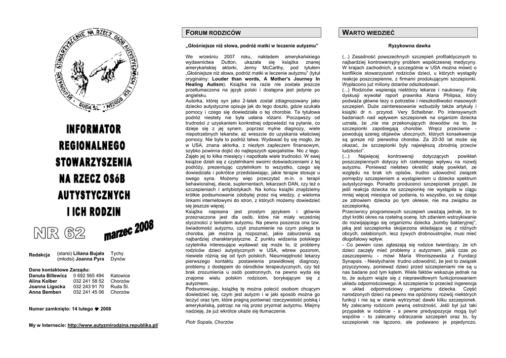 FORUM RODZICÓW Redakcja (starsi) Liliana Bujała (młodsi) Joanna Pyra Dane kontaktowe Zarządu: Danuta Billewicz 0 692 565 494 Alina Kolber 032 241 58 52 Joanna Ligocka 032 243 91 70 Anna Bemben 032 241 45 06 Tychy Dynów Katowice Chorzów Ruda Śl. Chorzów Numer zamknięto: 14 lutego < 2008 My w Internecie: http://www.autyzmirodzina.republika.pl/ WARTO WIEDZIEĆ „Głośniejsze niż słowa, podróż matki w leczenie autyzmu” Ryzykowna dawka We wrześniu 2007 roku, nakładem amerykańskiego wydawnictwa Dutton, ukazała się książka znanej amerykańskiej aktorki, Jenny McCarthy, pod tytułem „Głośniejsze niż słowa, podróż matki w leczenie autyzmu” (tytuł oryginalny: Louder than words, A Mother’s Journey In Healing Autism). Książka na razie nie została jeszcze przetłumaczona na język polski i dostępna jest jedynie po angielsku. Autorka, której syn jako 2-latek został zdiagnozowany jako dziecko autystyczne opisuje jak do tego doszło, gdzie szukała pomocy i czego się dowiedziała o tej chorobie. Ta tytułowa podróż niestety nie była usłana różami. Począwszy od trudności z uzyskaniem konkretnej odpowiedzi na pytanie, co dzieje się z jej synem, poprzez mylne diagnozy, wiele niepotrzebnych lekarstw, aż wreszcie do uzyskania właściwej pomocy. Nie była to podróż łatwa. Wydawać by się mogło, że w USA, znana aktorka, z niezłym zapleczem finansowym, szybko powinna dojść do najlepszych specjalistów. Nic z tego. Zajęło jej to kilka miesięcy i napotkała wiele trudności. W swej książce dzieli się z czytelnikami swoimi doświadczeniami z tej podróży, prezentując czytelnikom to wszystko, czego się dowiedziała i pokrótce przedstawiając, jakie terapie stosuje u swego syna. Możemy więc przeczytać m.in. o terapii behawioralnej, diecie, suplementach, lekarzach DAN, czy też o szczepieniach i antybiotykach. Na końcu książki znajdziemy krótkie podsumowanie zdobytej przez nią wiedzy, z wieloma linkami internetowymi do stron, z których możemy dowiedzieć się jeszcze więcej. Książka napisana jest prostym językiem i głównie przeznaczona jest dla osób, które nie miały wcześniej styczności z tematem autyzmu. Na pewno poszerza ona tzw. świadomość autyzmu, czyli zrozumienie na czym polega ta choroba, jak można ją rozpoznać, jakie zaburzenia są najbardziej charakterystyczne. Z punktu widzenia polskiego czytelnika interesujące wydawać się może to, iż problemy rodziców dzieci autystycznych w USA, wbrew pozorom, niewiele różnią się od tych polskich. Nieumiejętność lekarzy pierwszego kontaktu postawienia prawidłowej diagnozy, problemy z dostępem do ośrodków terapeutycznych, czy też brak zrozumienia u osób postronnych, na pewno wyda się znajome wielu polskim rodzicom, borykającym się z autyzmem. Podsumowując, książkę tę można polecić osobom chcącym dowiedzieć się, czym jest autyzm i w jaki sposób można go leczyć oraz tym, które pragną porównać rzeczywistość polską i amerykańską, patrząc na nią przez pryzmat autyzmu. Miejmy nadzieję, że już wkrótce ukaże się tłumaczenie. (...) Zasadność powszechnych szczepień profilaktycznych to najbardziej kontrowersyjny problem współczesnej medycyny. W krajach zachodnich, a szczególnie w USA można mówić o konflikcie stowarzyszeń rodziców dzieci, u których wystąpiły reakcje poszczepienne, z firmami produkującymi szczepionki. Wypłacono już miliony dolarów odszkodowań. (...) Rodziców wspierają niektórzy lekarze i naukowcy. Falę dyskusji wywołał raport prawnika Alana Philipsa, który podważa główne tezy o potrzebie i nieszkodliwości masowych szczepień. Duże zainteresowanie wzbudziły także artykuły i książki dr n. przyrod. Very Scheibner. Po intensywnych badaniach nad wpływem szczepionek na organizm dziecka uznała, że „nie ma przekonujących dowodów na to, że szczepionki zapobiegają chorobie. Wręcz przeciwnie powodują szereg objawów ubocznych, których konsekwencje są gorsze niż pierwotna choroba. Za 20-30 lat może się okazać, że szczepionki były największą zbrodnią przeciw ludzkości”. (...) Najwięcej kontrowersji dotyczących powikłań poszczepiennych dotyczy ich rzekomego wpływu na rozwój autyzmu. Ponieważ niełatwo określić skalę powikłań, ze względu na brak ich opisów, trudno udowodnić związek pomiędzy szczepieniem a wystąpieniem u dziecka spektrum autystycznego. Ponadto producenci szczepionek przyjęli, że jeśli reakcja dziecka na szczepionkę nie wystąpiła w ciągu mniej więcej miesiąca od podania, to wszystko, co się dzieje ze zdrowiem dziecka po tym okresie, nie ma związku ze szczepionką. Przeciwnicy programowych szczepień uważają jednak, że to zbyt krótki okres na rzetelną ocenę. Ich zdaniem wstrzykiwanie do rozwijającego się organizmu dziecka „bomby bakteryjnej”, jaką jest szczepionka skojarzona składająca się z różnych obcych, osłabionych, lecz żywych drobnoustrojów, musi mieć długofalowy wpływ. - Co pewien czas zgłaszają się rodzice twierdzący, że ich dzieci zaczęły mieć problemy z autyzmem, jakiś czas po zaszczepieniu - mówi Maria Wroniszewska z Fundacji Synapsis. - Niesłychanie trudno udowodnić, że jest to związek przyczynowy, ponieważ dzieci przed szczepieniami nie są u nas badane pod tym kątem. Wiele faktów wskazuje jednak na to, że autyzm wiąże się z nieprawidłowym funkcjonowaniem układu odpornościowego. A szczepienie to przecież ingerencja w układ odpornościowy organizmu dziecka. Część narodzonych dzieci na pewno ma opóźniony rozwój niektórych funkcji i nie są w stanie wytrzymać dawki kilku szczepionek. My zalecamy rodzicom pewną ostrożność. Jeśli był już taki przypadek w rodzinie - a pewne predyspozycje mogą być wspólne - to zalecamy odraczanie szczepień oraz to, by szczepionek nie łączono, ale podawano je pojedynczo. Piotr Sopala, Chorzów Zalecamy ostrożność, choć 