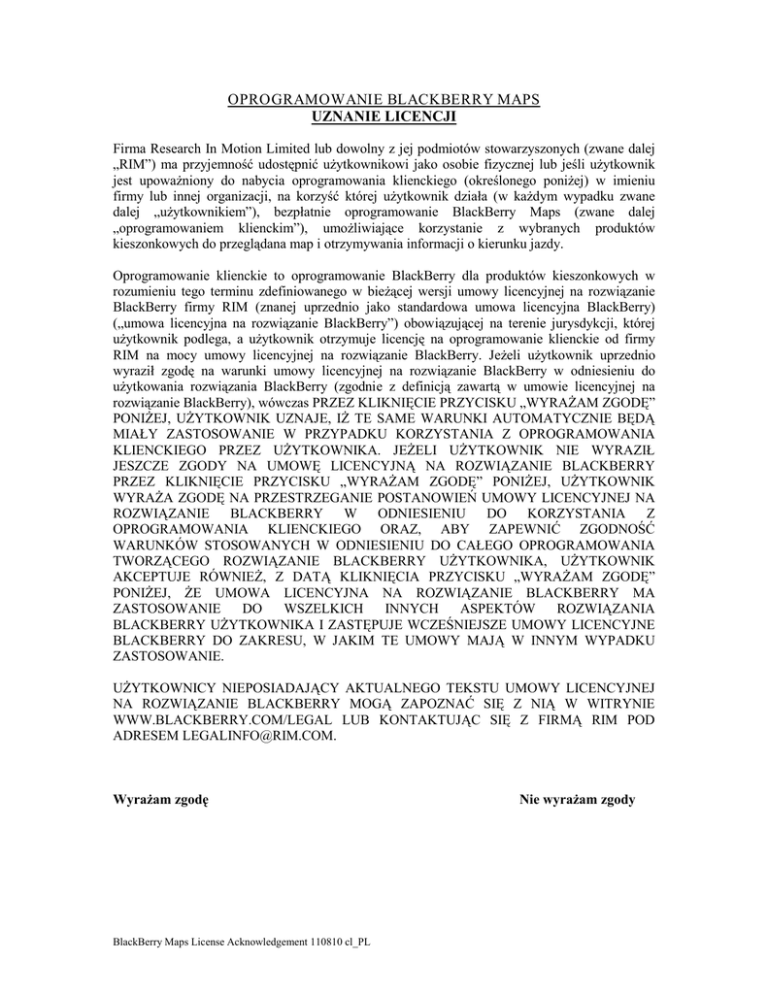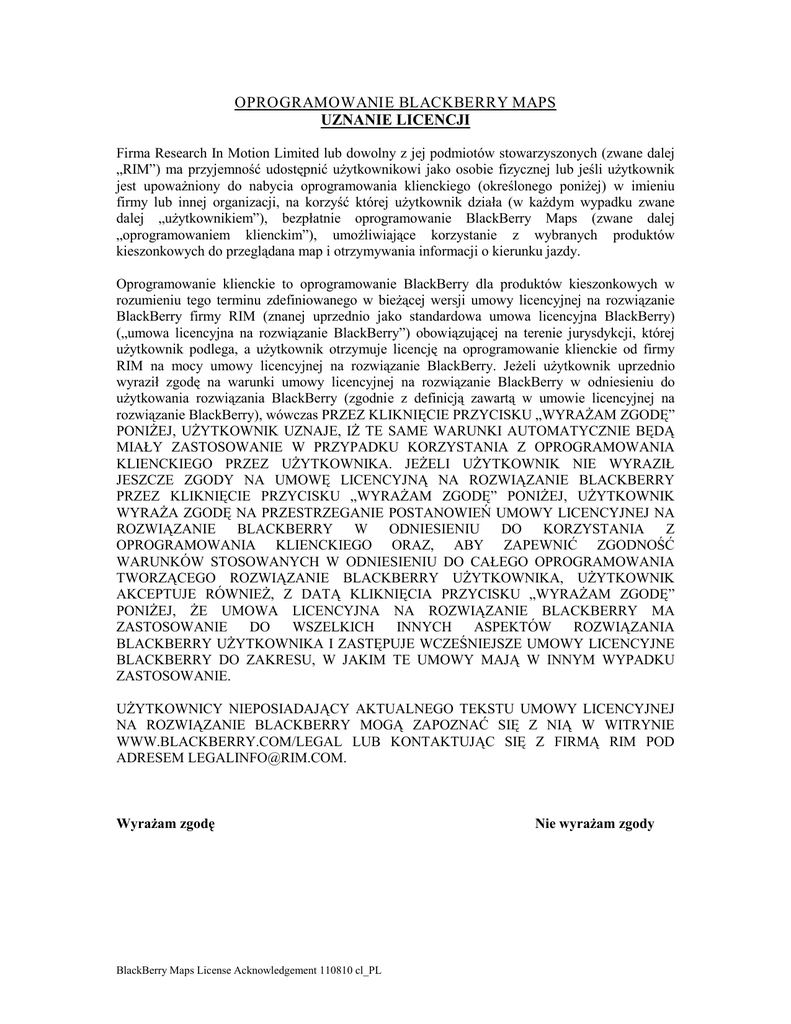 OPROGRAMOWANIE BLACKBERRY MAPS UZNANIE LICENCJI Firma Research In Motion Limited lub dowolny z jej podmiotów stowarzyszonych (zwane dalej „RIM”) ma przyjemność udostępnić użytkownikowi jako osobie fizycznej lub jeśli użytkownik jest upoważniony do nabycia oprogramowania klienckiego (określonego poniżej) w imieniu firmy lub innej organizacji, na korzyść której użytkownik działa (w każdym wypadku zwane dalej „użytkownikiem”), bezpłatnie oprogramowanie BlackBerry Maps (zwane dalej „oprogramowaniem klienckim”), umożliwiające korzystanie z wybranych produktów kieszonkowych do przeglądana map i otrzymywania informacji o kierunku jazdy. Oprogramowanie klienckie to oprogramowanie BlackBerry dla produktów kieszonkowych w rozumieniu tego terminu zdefiniowanego w bieżącej wersji umowy licencyjnej na rozwiązanie BlackBerry firmy RIM (znanej uprzednio jako standardowa umowa licencyjna BlackBerry) („umowa licencyjna na rozwiązanie BlackBerry”) obowiązującej na terenie jurysdykcji, której użytkownik podlega, a użytkownik otrzymuje licencję na oprogramowanie klienckie od firmy RIM na mocy umowy licencyjnej na rozwiązanie BlackBerry. Jeżeli użytkownik uprzednio wyraził zgodę na warunki umowy licencyjnej na rozwiązanie BlackBerry w odniesieniu do użytkowania rozwiązania BlackBerry (zgodnie z definicją zawartą w umowie licencyjnej na rozwiązanie BlackBerry), wówczas PRZEZ KLIKNIĘCIE PRZYCISKU „WYRAŻAM ZGODĘ” PONIŻEJ, UŻYTKOWNIK UZNAJE, IŻ TE SAME WARUNKI AUTOMATYCZNIE BĘDĄ MIAŁY ZASTOSOWANIE W PRZYPADKU KORZYSTANIA Z OPROGRAMOWANIA KLIENCKIEGO PRZEZ UŻYTKOWNIKA. JEŻELI UŻYTKOWNIK NIE WYRAZIŁ JESZCZE ZGODY NA UMOWĘ LICENCYJNĄ NA ROZWIĄZANIE BLACKBERRY PRZEZ KLIKNIĘCIE PRZYCISKU „WYRAŻAM ZGODĘ” PONIŻEJ, UŻYTKOWNIK WYRAŻA ZGODĘ NA PRZESTRZEGANIE POSTANOWIEŃ UMOWY LICENCYJNEJ NA ROZWIĄZANIE BLACKBERRY W ODNIESIENIU DO KORZYSTANIA Z OPROGRAMOWANIA KLIENCKIEGO ORAZ, ABY ZAPEWNIĆ ZGODNOŚĆ WARUNKÓW STOSOWANYCH W ODNIESIENIU DO CAŁEGO OPROGRAMOWANIA TWORZĄCEGO ROZWIĄZANIE BLACKBERRY UŻYTKOWNIKA, UŻYTKOWNIK AKCEPTUJE RÓWNIEŻ, Z DATĄ KLIKNIĘCIA PRZYCISKU „WYRAŻAM ZGODĘ” PONIŻEJ, ŻE UMOWA LICENCYJNA NA ROZWIĄZANIE BLACKBERRY MA ZASTOSOWANIE DO WSZELKICH INNYCH ASPEKTÓW ROZWIĄZANIA BLACKBERRY UŻYTKOWNIKA I ZASTĘPUJE WCZEŚNIEJSZE UMOWY LICENCYJNE BLACKBERRY DO ZAKRESU, W JAKIM TE UMOWY MAJĄ W INNYM WYPADKU ZASTOSOWANIE. UŻYTKOWNICY NIEPOSIADAJĄCY AKTUALNEGO TEKSTU UMOWY LICENCYJNEJ NA ROZWIĄZANIE BLACKBERRY MOGĄ ZAPOZNAĆ SIĘ Z NIĄ W WITRYNIE WWW.BLACKBERRY.COM/LEGAL LUB KONTAKTUJĄC SIĘ Z FIRMĄ RIM POD ADRESEM [email protected]. Wyrażam zgodę BlackBerry Maps License Acknowledgement 110810 cl_PL Nie wyrażam zgody