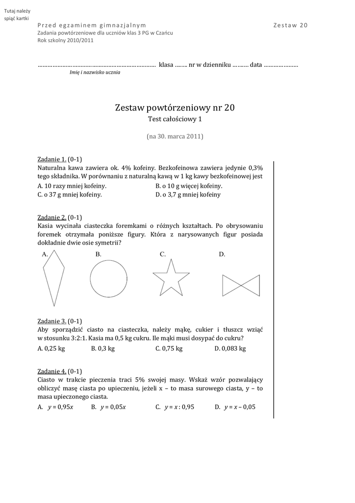 Tutaj należy spiąć kartki Przed egzaminem gimnazjalnym Zestaw 20 Zadania powtórzeniowe dla uczniów klas 3 PG w Czańcu Rok szkolny 2010/2011 ……………………………………………………………… klasa ….…. nr w dzienniku …….… data ………………… Imię i nazwisko ucznia Zestaw powtórzeniowy nr 20 Test całościowy 1 (na 30. marca 2011) Zadanie 1. (0-1) Naturalna kawa zawiera ok. 4% kofeiny. Bezkofeinowa zawiera jedynie 0,3% tego składnika. W porównaniu z naturalną kawą w 1 kg kawy bezkofeinowej jest A. 10 razy mniej kofeiny. B. o 10 g więcej kofeiny. C. o 37 g mniej kofeiny. D. o 3,7 g mniej kofeiny Zadanie 2. (0-1) Kasia wycinała ciasteczka foremkami o różnych kształtach. Po obrysowaniu foremek otrzymała poniższe figury. Która z narysowanych figur posiada dokładnie dwie osie symetrii? A. B. C. D. Zadanie 3. (0-1) Aby sporządzić ciasto na ciasteczka, należy mąkę, cukier i tłuszcz wziąć w stosunku 3:2:1. Kasia ma 0,5 kg cukru. Ile mąki musi dosypać do cukru? A. 0,25 kg B. 0,3 kg C. 0,75 kg D. 0,083 kg Zadanie 4. (0-1) Ciasto w trakcie pieczenia traci 5% swojej masy. Wskaż wzór pozwalający obliczyć masę ciasta po upieczeniu, jeżeli x – to masa surowego ciasta, y – to masa upieczonego ciasta. A. y = 0,95x B. y = 0,05x C. y = x : 0,95 D. y = x – 0,05 Tutaj należy spiąć kartki Przed egzaminem gimnazjalnym Zestaw 20 Zadania powtórzeniowe dla uczniów klas 3 PG w Czańcu Rok szkolny 2010/2011 Według poniższej siatki wykonane są pudełeczka do śmietanki. Zadanie 5. (0–1). Pudełeczko ma kształt A. ostrosłupa prawidłowego czworokątnego. B. czworościanu foremnego. C. prostopadłościanu. D. sześcianu. Zadanie 6. (0-2) Wykorzystując dane z rysunku do zadania nr 5, oblicz, ile cm2 folii potrzeba na oklejenie zewnętrznej powierzchni jednego pudełeczka do śmietanki. Zapisz obliczenia. Zadanie 7. (0-4) Trzy koleżanki urządzały wspólnie urodziny. Każda kupiła słodycze, owoce i napoje. Ania za zakupy zapłaciła x zł, Kasia o 3,20 zł więcej, a Ola dwa razy mniej niż Ania. Razem zapłaciły 65,70zł. Oblicz, ile zapłaciła każda z nich. Zapisz obliczenia. Tutaj należy spiąć kartki Przed egzaminem gimnazjalnym Zestaw 20 Zadania powtórzeniowe dla uczniów klas 3 PG w Czańcu Rok szkolny 2010/2011 Zadanie 8. (0-5) Ciasteczko ma masę 25 g. Skład zawartych w nim wartości odżywczych przedstawia tabela. Oblicz procentowe zawartości poszczególnych składników i uzupełnij tabelę. Następnie uzupełnij załączony diagram kołowy według wzoru. Zapisz wszystkie obliczenia Zawartość odżywcza ciasteczka W gramach Węglowodany 15 g Tłuszcze 5g Białko 2,5 g Wapń i inne makroelementy 2,5 g Obliczenia procentowe: Diagram kołowy Obliczenia miar kątów W procentach Tutaj należy spiąć kartki Przed egzaminem gimnazjalnym Zestaw 20 Zadania powtórzeniowe dla uczniów klas 3 PG w Czańcu Rok szkolny 2010/2011 Zapoznaj się z informacjami w tabeli i odpowiedz na pytania z zadań od 9 do 12. Nazwa państwa Niger Somalia Malawi Ghana Malezja Liczba ludności w milionach 8 7 10 16 18 Procent umiejących czytać i pisać 14 24 37 50 78 Zadanie 9. (0-1) Jaka część ludności Malawi potrafi czytać i pisać? ...................................................................................................................................................................................................... Zadanie 10. (0-1) ଷ ସ W którym państwie około ludności nie potrafi czytać i pisać? ...................................................................................................................................................................................................... Zadanie 11. (0-1) W którym państwie jest największy procent analfabetów? ...................................................................................................................................................................................................... Zadanie 12. (0-1) W którym państwie co najmniej 8 milionów ludzi potrafi czytać i pisać? ...................................................................................................................................................................................................... Zadanie 13. (0–2) Jacek podjął wakacyjną pracę w osiedlowej pizzerii. Zaproponowano mu stałą stawkę dzienną w wysokości 5 zł plus 60 groszy za każdą pizzę, którą dostarczy do odbiorcy. Ile dostaw musi zrealizować w ciągu dnia, aby zarobić co najmniej 18 złotych? Tutaj należy spiąć kartki Przed egzaminem gimnazjalnym Zestaw 20 Zadania powtórzeniowe dla uczniów klas 3 PG w Czańcu Rok szkolny 2010/2011 Zadanie 14. (0–2) Zbiornik na cysternie ma kształt walca. Oblicz długość tego zbiornika, jeżeli średnica przekroju poprzecznego ma 2 metry oraz wiadomo, że w zbiorniku mieszczą się 22 m3 benzyny. Do obliczeń przyjmij ߨ ൌ ଶଶ . Zadanie 15. (0–2) Ile osób zmieści się przy okrągłym stole o średnicy 1,2 m wiedząc, że na l osobą przewidziane jest 50 cm? W zestawie wykorzystano materiały przygotowane przez OKE
