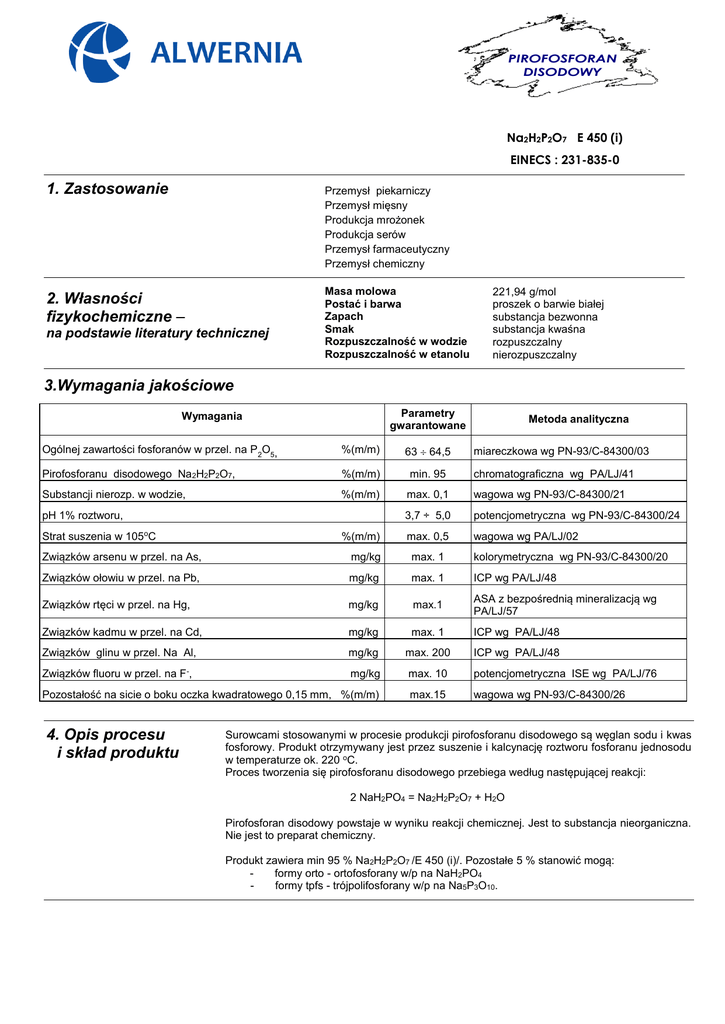 PIROFOSFORAN DISODOWY Na2H2P2O7 E 450 (i) EINECS : 231-835-0 1. Zastosowanie Przemysł piekarniczy Przemysł mięsny Produkcja mrożonek Produkcja serów Przemysł farmaceutyczny Przemysł chemiczny 2. Własności fizykochemiczne – Masa molowa Postać i barwa Zapach Smak Rozpuszczalność w wodzie Rozpuszczalność w etanolu na podstawie literatury technicznej 221,94 g/mol proszek o barwie białej substancja bezwonna substancja kwaśna rozpuszczalny nierozpuszczalny 3.Wymagania jakościowe Parametry gwarantowane Wymagania Metoda analityczna Ogólnej zawartości fosforanów w przel. na P2O5, %(m/m) 63 64,5 Pirofosforanu disodowego Na2H2P2O7, %(m/m) min. 95 chromatograficzna wg PA/LJ/41 Substancji nierozp. w wodzie, %(m/m) max. 0,1 wagowa wg PN-93/C-84300/21 3,7 ÷ 5,0 potencjometryczna wg PN-93/C-84300/24 max. 0,5 wagowa wg PA/LJ/02 pH 1% roztworu, Strat suszenia w 105oC %(m/m) miareczkowa wg PN-93/C-84300/03 Związków arsenu w przel. na As, mg/kg max. 1 kolorymetryczna wg PN-93/C-84300/20 Związków ołowiu w przel. na Pb, mg/kg max. 1 ICP wg PA/LJ/48 Związków rtęci w przel. na Hg, mg/kg max.1 ASA z bezpośrednią mineralizacją wg PA/LJ/57 Związków kadmu w przel. na Cd, mg/kg max. 1 ICP wg PA/LJ/48 Związków glinu w przel. Na Al, mg/kg max. 200 ICP wg PA/LJ/48 Związków fluoru w przel. na F-, mg/kg max. 10 potencjometryczna ISE wg PA/LJ/76 Pozostałość na sicie o boku oczka kwadratowego 0,15 mm, %(m/m) max.15 wagowa wg PN-93/C-84300/26 4. Opis procesu i skład produktu Surowcami stosowanymi w procesie produkcji pirofosforanu disodowego są węglan sodu i kwas fosforowy. Produkt otrzymywany jest przez suszenie i kalcynację roztworu fosforanu jednosodu w temperaturze ok. 220 oC. Proces tworzenia się pirofosforanu disodowego przebiega według następującej reakcji: 2 NaH2PO4 = Na2H2P2O7 + H2O Pirofosforan disodowy powstaje w wyniku reakcji chemicznej. Jest to substancja nieorganiczna. Nie jest to preparat chemiczny. Produkt zawiera min 95 % Na2H2P2O7 /E 450 (i)/. Pozostałe 5 % stanowić mogą: formy orto - ortofosforany w/p na NaH2PO4 formy tpfs - trójpolifosforany w/p na Na5P3O10. 5. Pakowanie i oznakowanie Pirofosforan disodowy pakowany jest w worki polietylenowe, papierowe wentylowe w ilości po 25 kg oraz w big-bagi w ilości 1000 kg. Worki i big-bagi umieszcza się na paletach i pokrywa folią. Dopuszcza się inny rodzaj opakowania po uzgodnieniu z odbiorcą. Opakowania spełniają wymagania prawne określone dla materiałów i wyrobów przeznaczonych do kontaktu z żywnością. Na opakowaniu pirofosforanu disodowego umieszcza się co najmniej: nazwę i adres producenta, nazwę produktu, masę netto, numer partii, datę ważności. Numer partii oznacza: rok/miesiąc/numer kolejnej partii zapakowanej w miesiącu. Dodatkowo na opakowaniu umieszcza się numer kontrolny osoby pakującej produkt. 6. Badania mikrobiologiczne Pirofosforan disodowy spełnia wymagania prawne dotyczące specyfikacji i kryteriów czystości dla dozwolonych substancji dodatkowych stosowanych w środkach spożywczych. W wyrywkowych badaniach mikrobiologicznych produktu nie stwierdzono obecności bakterii: Escherichia coli, Staphylococcus aureus, beztlenowych przetrwalnikujących i pałeczek Salmonelli.Wyniki przeprowadzonych badań wskazują również, że produkt nie stanowi korzystnego środowiska dla rozwoju i namnażania się pałeczek z rodzaju Salmonella. 7. Zawartość substancji obcych Pirofosforan disodowy spełnia wymagania prawne dotyczące zawartości substancji zanieczyszczających dla dozwolonych substancji dodatkowych. W procesie produkcji stosowane są surowce wolne od zanieczyszczeń fizycznych, chemicznych, mikrobiologicznych /zgodnie z deklaracją ich dostawców/, w tym wolne od: mykotoksyn, pestycydów, antybiotyków, hormonów, dioksyn i na żadnym etapie procesu produkcji i konfekcjonowania nie są dodawane substancje zawierające w/w. Zawartość metali ciężkich spełnia wymagania przepisów prawnych dotyczących dozwolonych substancji dodatkowych. W procesie produkcji /na żadnym z etapów/ nie dodaje się: substancji pochodzenia organicznego, substancji pochodzenia roślinnego i zwierzęcego, substancji barwiących, emulgatorów, antyutleniaczy, substancji konserwujących, substancji słodzących, aromatów, tłuszczów zwierzęcych, rozpuszczalników ani żadnych innych ulepszaczy. 8. Zawartość alergenów Pirofosforan disodowy nie zawiera alergenów i całkowicie wykluczona jest możliwość zanieczyszczenia krzyżowego substancjami wywołującymi alergię, takimi jak: Zboża zawierające gluten tj. pszenica, żyto, jęczmień, owies, orkisz, kamut lub ich odmiany hybrydowe, a także produkty pochodne, Ryż i pochodne, Kukurydza i pochodne, Soja i produkty pochodne, Gryka, Drożdże, Lecytyna, Gluten, Seler i produkty pochodne, Cynamon, Orzechy, tj. migdały, orzechy laskowe, orzechy włoskie, orzechy nerkowca, orzeszki pekan, orzechy brazylijskie, pistacje/orzechy pistacjowe, orzechy makadamia lub orzechy Queensland, a także produkty pochodne, Orzeszki ziemne /arachidowe/ i produkty pochodne, Nasiona sezamu i produkty pochodne, Kakao i jego produkty włączając masło kakaowe, Olejek kolendry, Strączkowe, Owoce z pestkami morela, śliwka, wiśnia itp., Gorczyca i produkty pochodne, - Żelatyna, Laktoza, Musztarda i jej produkty, Jaja i produkty pochodne, TVP /Teksturowane białka warzywne/, HVP /Hydrolizowane białka warzywne/, Mleko i produkty pochodne, Proteiny mleka /np. kazeina, serwatka/, Mięso /wołowe, wieprzowe, drobiowe/ i produkty mięsne, Skorupiaki oraz małże i produkty pochodne, - - Mięczaki i produkty pochodne, Ryby i produkty pochodne, Drób i produkty drobiowe, Wanilina, Barwniki naturalne, Barwniki azowe ( E110), Tartazyna (E 102), Rośliny baldaszkowate, Marchewka, Łubin i produkty pochodne, Mak, Kolendra, Konserwanty, Kwas benzoesowy (E210-E213), Glutaminiany (E620-E625), Siarczki (E220-E228), Dwutlenek siarki i siarczyny w stężeniach pow