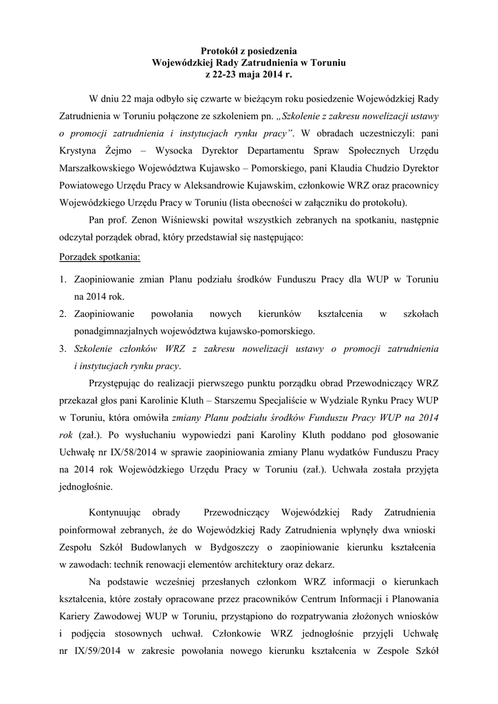Protokół z posiedzenia Wojewódzkiej Rady Zatrudnienia w Toruniu z 22-23 maja 2014 r. W dniu 22 maja odbyło się czwarte w bieżącym roku posiedzenie Wojewódzkiej Rady Zatrudnienia w Toruniu połączone ze szkoleniem pn. „Szkolenie z zakresu nowelizacji ustawy o promocji zatrudnienia i instytucjach rynku pracy”. W obradach uczestniczyli: pani Krystyna Żejmo – Wysocka Dyrektor Departamentu Spraw Społecznych Urzędu Marszałkowskiego Województwa Kujawsko – Pomorskiego, pani Klaudia Chudzio Dyrektor Powiatowego Urzędu Pracy w Aleksandrowie Kujawskim, członkowie WRZ oraz pracownicy Wojewódzkiego Urzędu Pracy w Toruniu (lista obecności w załączniku do protokołu). Pan prof. Zenon Wiśniewski powitał wszystkich zebranych na spotkaniu, następnie odczytał porządek obrad, który przedstawiał się następująco: Porządek spotkania: 1. Zaopiniowanie zmian Planu podziału środków Funduszu Pracy dla WUP w Toruniu na 2014 rok. 2. Zaopiniowanie powołania nowych kierunków kształcenia w szkołach ponadgimnazjalnych województwa kujawsko-pomorskiego. 3. Szkolenie członków WRZ z zakresu nowelizacji ustawy o promocji zatrudnienia i instytucjach rynku pracy. Przystępując do realizacji pierwszego punktu porządku obrad Przewodniczący WRZ przekazał głos pani Karolinie Kluth – Starszemu Specjaliście w Wydziale Rynku Pracy WUP w Toruniu, która omówiła zmiany Planu podziału środków Funduszu Pracy WUP na 2014 rok (zał.). Po wysłuchaniu wypowiedzi pani Karoliny Kluth poddano pod głosowanie Uchwałę nr IX/58/2014 w sprawie zaopiniowania zmiany Planu wydatków Funduszu Pracy na 2014 rok Wojewódzkiego Urzędu Pracy w Toruniu (zał.). Uchwała została przyjęta jednogłośnie. Kontynuując obrady Przewodniczący Wojewódzkiej Rady Zatrudnienia poinformował zebranych, że do Wojewódzkiej Rady Zatrudnienia wpłynęły dwa wnioski Zespołu Szkół Budowlanych w Bydgoszczy o zaopiniowanie kierunku kształcenia w zawodach: technik renowacji elementów architektury oraz dekarz. Na podstawie wcześniej przesłanych członkom WRZ informacji o kierunkach kształcenia, które zostały opracowane przez pracowników Centrum Informacji i Planowania Kariery Zawodowej WUP w Toruniu, przystąpiono do rozpatrywania złożonych wniosków i podjęcia stosownych uchwał. Członkowie WRZ jednogłośnie przyjęli Uchwałę nr IX/59/2014 w zakresie powołania nowego kierunku kształcenia w Zespole Szkół Budowlanych w Bydgoszczy w brzmieniu: „Wojewódzka Rada Zatrudnienia w Toruniu, po analizie sytuacji rynku pracy, pozytywnie opiniuje, zgłoszoną przez Zespół Szkół Budowlanych w Bydgoszczy, potrzebę kształcenia w nowym kierunku technik renowacji elementów architektury” oraz Uchwałę nr IX/60/2014 w zakresie powołania nowego kierunku kształcenia w Zespole Szkół Budowlanych w Bydgoszczy w brzmieniu: „Wojewódzka Rada Zatrudnienia w Toruniu, po analizie sytuacji rynku pracy, pozytywnie opiniuje, zgłoszoną przez Zespół Szkół Budowlanych w Bydgoszczy, potrzebę kształcenia w nowym kierunku dekarz”. Po wyczerpaniu punktów porządku obrad dot. czwartego posiedzenia WRZ jej członkowie uczestniczyli w szkoleniu z zakresu nowelizacji ustawy o promocji zatrudnienia i instytucjach rynku pracy. W temat polityki rynku pracy wprowadził uczestników szkolenia prof. dr hab. Zenon Wiśniewski – Pzrewodniczacy WRZ, który jest jednocześnie kierownikiem Katedry Gospodarowania Zasobami Pracy Wydziału Nauk Ekonomicznych i Zarządzania Uniwersytetu Mikołaja Kopernika w Toruniu – prezentacją pn. Uwarunkowania polityki rynku pracy w Polsce (w załączniku do protokołu). Następnie do meritum szkolenia przeszedł Pan Ryszard Wilmanowicz - Radca Prawny WUP w Toruniu, który omówił Nowelizację ustawy o promocji zatrudnienia i instytucjach rynku pracy, a zwłaszcza jej cele i zmiany instytucjonalne, w tym dotyczące funkcjonowania rad rynku pracy, zmiany dotyczące usług i instrumentów rynku pracy: pośrednictwa pracy, poradnictwa zawodowego, profilowania bezrobotnych, szkoleń zawodowych i staży. W dalszej części szkolenia Pani Iwona Kotowska - Radca Prawny WUP w Toruniu omówiła zmiany dotyczące pozostałych usług i instrumentów rynku pracy: prac interwencyjnych, robót publicznych, środków na podjęcie działalności gospodarczej, zatrudnienia wspieranego, prac społecznie użytecznych oraz programów specjalnych. Na tym obrady pierwszego dnia zakończono. W drugim dniu spotkania Pan Janusz Bokser - Kierownik CIiPKZ w Toruniu przeprowadził szkolenie na temat „Sytuacja zawodów na rynku pracy w województwie kujawsko-pomorskim w świetle analiz i dostępnych badań” (źródła danych, metodologia tworzenia informacji lokalnej o zawodzie, ocena dotychczasowego procesu opiniowania). Prezentowane materiały znajdują się w załączniku do protokołu. W kolejnym punkcie szkolenia Pani Klaudia Chudzio - Dyrektor PUP w Aleksandrowie Kujawskim dokonała prezentacji pn. „Grupy problemowe na rynku pracy w powiecie aleksandrowskim a możliwości wykorzystania profilowania w praktyce PUP” (przedmiotowe materiały znajdują się w załączniku do protokołu). 2 Następnie Pani Beata Piskorska - Wicedyrektor ds. Rynku Pracy WUP w Toruniu zaprezentowała główne założenia Programu Operacyjnego Wiedza Edukacja Rozwój 2014 – 2020 oraz główne osie priorytetowe Kujawsko-Pomorskiego Regionalnego Programu Operacyjnego na lata 2014-2020 (prezentacja w załączniku). Jako ostatni głos zabrał Pan Artur Janas - Dyrektor WUP w Toruniu, który zaprezentował materiał dot. „Wyzwania współczesnego rynku pracy – konsekwencje praktyczne dla społeczności lokalnych i regionalnych” (materiały w załączniku). Podsumowując dwudniowe obrady WRZ, połączone ze szkoleniem jej członków Pan Przewodniczący podziękował wszystkim uczestnikom, a w szczególności prelegentom za właściwy dobór prezentowanych zagadnień i dobre przygotowanie materiałów. Na 