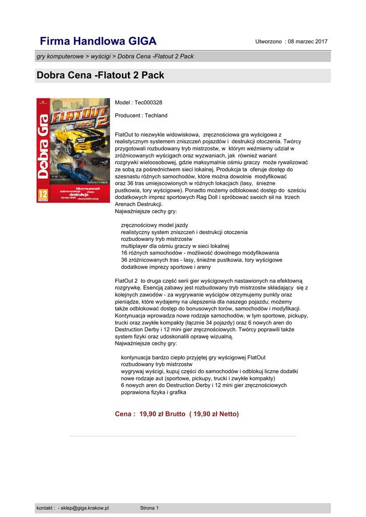 Firma Handlowa GIGA Utworzono : 08 marzec 2017 gry komputerowe > wyścigi > Dobra Cena -Flatout 2 Pack Dobra Cena -Flatout 2 Pack Model : Tec000328 Producent : Techland FlatOut to niezwykle widowiskowa, zręcznościowa gra wyścigowa z realistycznym systemem zniszczeń pojazdów i destrukcji otoczenia. Twórcy przygotowali rozbudowany tryb mistrzostw, w którym weźmiemy udział w zróżnicowanych wyścigach oraz wyzwaniach, jak również wariant rozgrywki wieloosobowej, gdzie maksymalnie ośmiu graczy może rywalizować ze sobą za pośrednictwem sieci lokalnej. Produkcja ta oferuje dostęp do szesnastu różnych samochodów, które można dowolnie modyfikować oraz 36 tras umiejscowionych w różnych lokacjach (lasy, śnieżne pustkowia, tory wyścigowe). Ponadto możemy odblokować dostęp do sześciu dodatkowych imprez sportowych Rag Doll i spróbować swoich sił na trzech Arenach Destrukcji. Najważniejsze cechy gry: zręcznościowy model jazdy realistyczny system zniszczeń i destrukcji otoczenia rozbudowany tryb mistrzostw multiplayer dla ośmiu graczy w sieci lokalnej 16 różnych samochodów - możliwość dowolnego modyfikowania 36 zróżnicowanych tras - lasy, śnieżne pustkowia, tory wyścigowe dodatkowe imprezy sportowe i areny FlatOut 2 to druga część serii gier wyścigowych nastawionych na efektowną rozgrywkę. Esencją zabawy jest rozbudowany tryb mistrzostw składający się z kolejnych zawodów - za wygrywanie wyścigów otrzymujemy punkty oraz pieniądze, które wydajemy na ulepszenia dla naszego pojazdu; możemy także odblokować dostęp do bonusowych torów, samochodów i modyfikacji. Kontynuacja wprowadza nowe rodzaje samochodów, w tym sportowe, pickupy, trucki oraz zwykłe kompakty (łącznie 34 pojazdy) oraz 6 nowych aren do Destruction Derby i 12 mini gier zręcznościowych. Twórcy poprawili także system fizyki oraz udoskonalili oprawę wizualną. Najważniejsze cechy gry: kontynuacja bardzo ciepło przyjętej gry wyścigowej FlatOut rozbudowany tryb mistrzostw wygrywaj wyścigi, kupuj części do samochodów i odblokuj liczne dodatki nowe rodzaje aut (sportowe, pickupy, trucki i zwykłe kompakty) 6 nowych aren do Destruction Derby i 12 mini gier zręcznościowych poprawiona fizyka i grafika Cena : 19,90 zł Brutto ( 19,90 zł Netto) kontakt : - [email protected] Strona 1