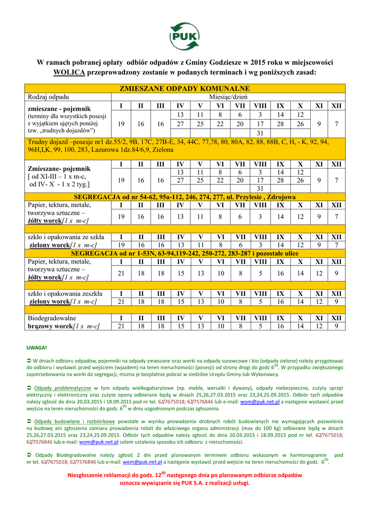 W ramach pobranej opłaty odbiór odpadów z Gminy Godziesze w 2015 roku w miejscowości WOLICA przeprowadzony zostanie w podanych terminach i wg poniższych zasad: ZMIESZANE ODPADY KOMUNALNE Miesiąc/dzień I II III IV V VI VII VIII IX X XI XII zmieszane - pojemnik 13 11 8 6 3 14 12 (terminy dla wszystkich posesji z wyjątkiem ujętych poniżej 19 16 16 27 25 22 20 17 28 26 9 7 tzw. „trudnych dojazdów”) 31 Trudny dojazd –posesje nr1 dz.55/2, 9B, 17C, 27B-E, 34, 44C, 77,78, 80, 80A, 82, 88, 88B, C, H, - K, 92, 94, 96H,I,K, 99, 100, 283, Lazurowa 1dz.84/6,9, Zielona Rodzaj odpadu VIII IX X 3 14 12 19 16 16 17 28 26 31 SEGREGACJA od nr 54-62, 95a-112, 246, 274, 277, ul. Przylesie , Zdrojowa Papier, tektura, metale, I II III IV V VI VII VIII IX X tworzywa sztuczne – 19 16 16 13 11 8 6 3 14 12 żółty worek[1 x m-c] XI XII 9 7 XI XII 9 7 szkło i opakowania ze szkła I II III IV V VI VII VIII IX X zielony worek[1 x m-c] 19 16 16 13 11 8 6 3 14 12 SEGREGACJA od nr 1-53N, 63-94,119-242, 250-272, 283-287 i pozostałe ulice Papier, tektura, metale, I II III IV V VI VII VIII IX X tworzywa sztuczne – 21 18 18 15 13 10 8 5 16 14 żółty worek[1 x m-c] XI 9 XII 7 XI XII 12 9 szkło i opakowania zeszkła zielony worek[1 x m-c] I 21 II 18 III 18 IV 15 V 13 VI 10 VII 8 VIII 5 IX 16 X 14 XI 12 XII 9 Biodegradowalne brązowy worek[1 x m-c] I 21 II 18 III 18 IV 15 V 13 VI 10 VII 8 VIII 5 IX 16 X 14 XI 12 XII 9 Zmieszane- pojemnik [ od XI-III – 1 x m-c, od IV- X - 1 x 2 tyg.] I II III IV 13 27 V 11 25 VI 8 22 VII 6 20 UWAGA! W dniach odbioru odpadów, pojemniki na odpady zmieszane oraz worki na odpady surowcowe i bio (odpady zielone) należy przygotowad 00 do odbioru i wystawid przed wejściem (wjazdem) na teren nieruchomości (posesji) od strony drogi do godz 6 . W przypadku zwiększonego zapotrzebowania na worki do segregacji, można je bezpłatnie pobrad w siedzibie Urzędu Gminy lub Wykonawcy. Odpady problematyczne w tym odpady wielkogabarytowe (np. meble, wersalki i dywany), odpady niebezpieczne, zużyty sprzęt elektryczny i elektroniczny oraz zużyte opony odbierane będą w dniach 25,26,27.03.2015 oraz 23,24,25.09.2015. Odbiór tych odpadów należy zgłosid do dnia 20.03.2015 i 18.09.2015 pod nr tel. 62/7675018; 62/7576846 lub e-mail: [email protected] a następnie wystawid przed 00 wejście na teren nieruchomości do godz. 6 w dniu uzgodnionym podczas zgłoszenia. Odpady budowlane i rozbiórkowe powstałe w wyniku prowadzenia drobnych robót budowlanych nie wymagających pozwolenia na budowę ani zgłoszenia zamiaru prowadzenia robót do właściwego organu administracji (max do 100 kg) odbierane będą w dniach 25,26,27.03.2015 oraz 23,24,25.09.2015. Odbiór tych odpadów należy zgłosid do dnia 20.03.2015 i 18.09.2015 pod nr tel. 62/7675018; 62/7576846 lub e-mail: [email protected] celem ustalenia sposobu ich odbioru z nieruchomości. Odpady Biodegradowalne należy zgłosid 2 dni przed planowanym terminem odbioru wskazanym w harmonogramie pod 00 nr tel. 62/7675018; 62/7576846 lub e-mail: [email protected] a następnie wystawid przed wejście na teren nieruchomości do godz. 6 . 00 Niezgłoszenie reklamacji do godz. 12 następnego dnia po planowanym odbiorze odpadów oznacza wywiązanie się PUK S.A. z realizacji usługi.